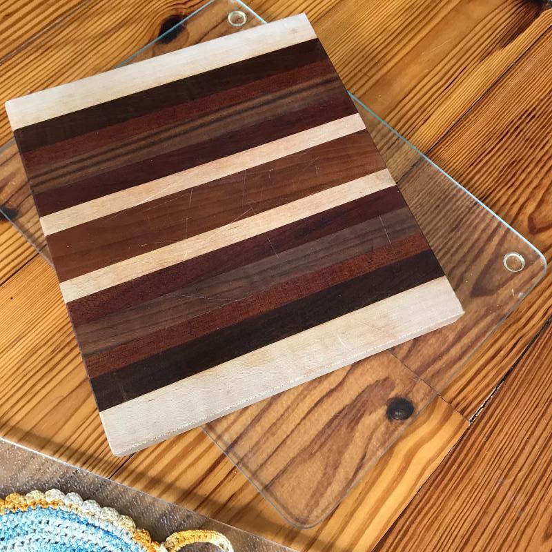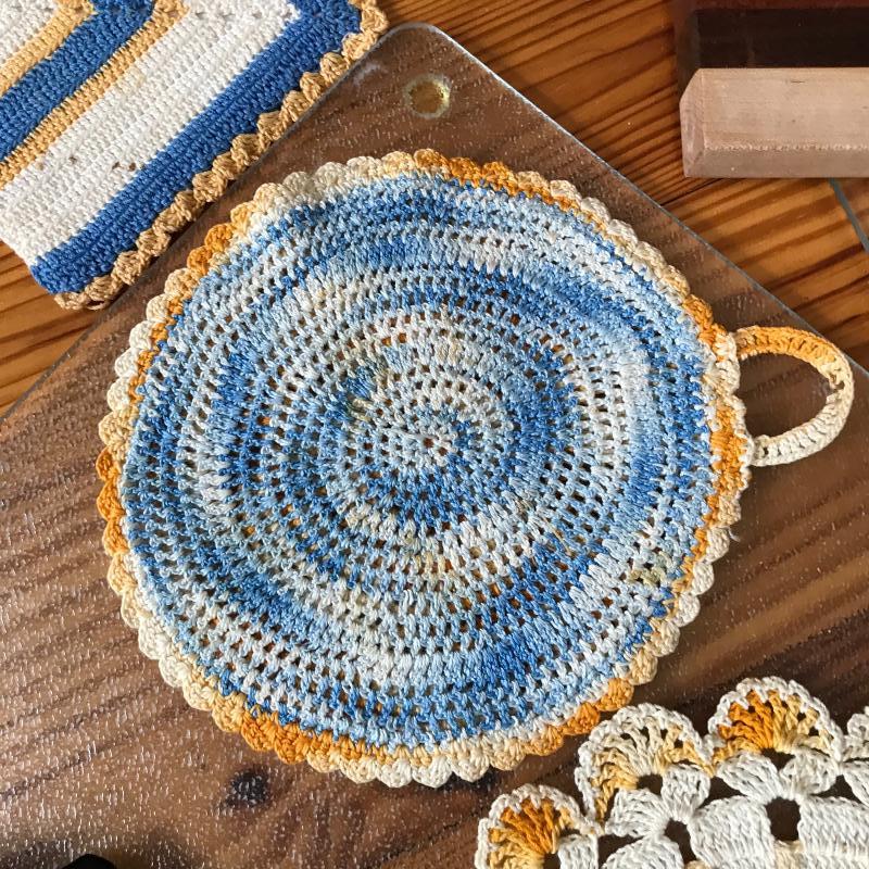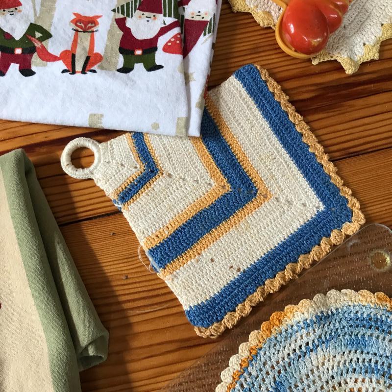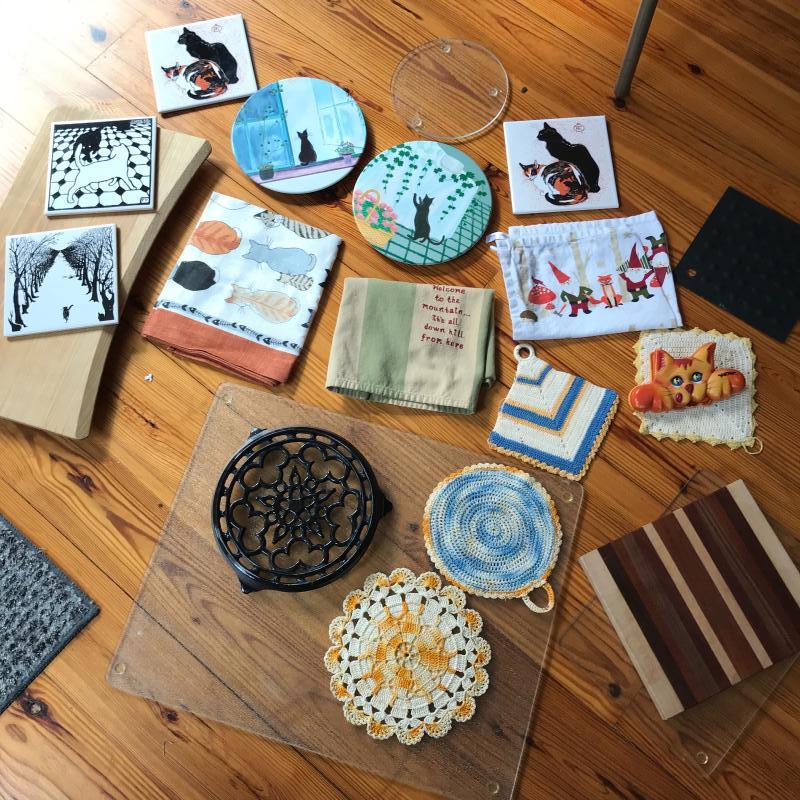 Lot includes four cutting boards, 9 trivets, a vintage cat Clío, three dish towels, and four crocheted pot holders. No shipping available. Local pickup only in Asheville, NC.