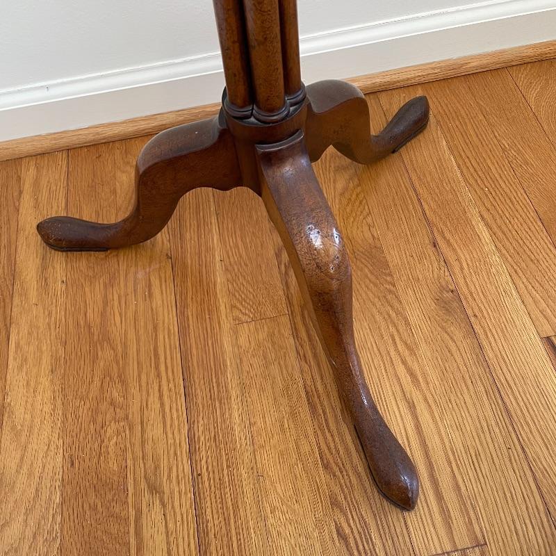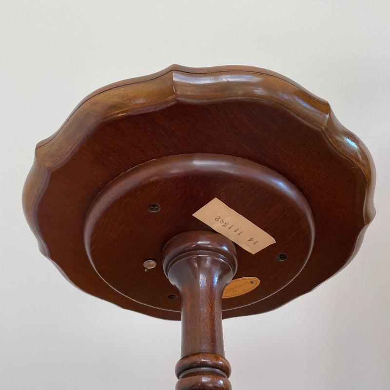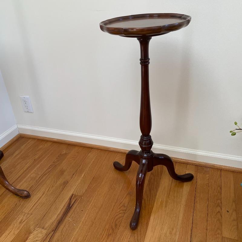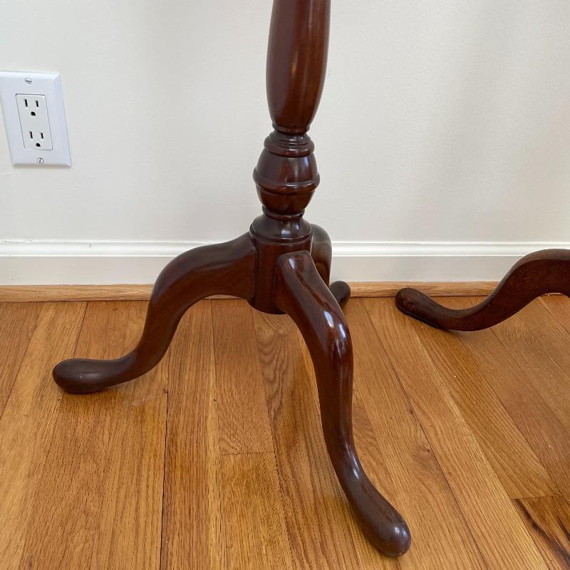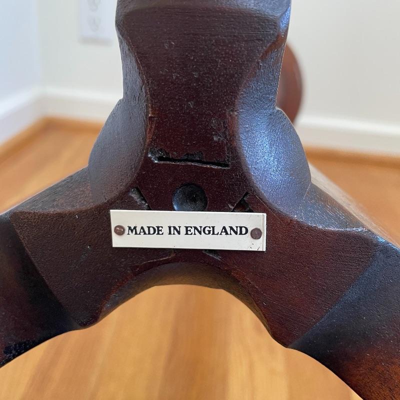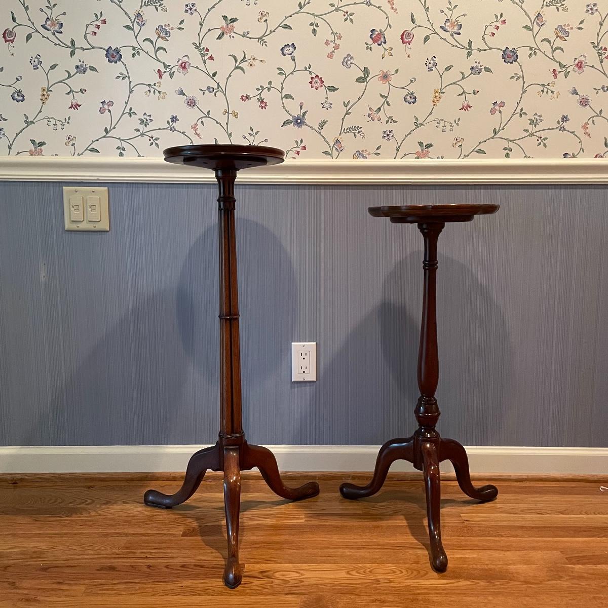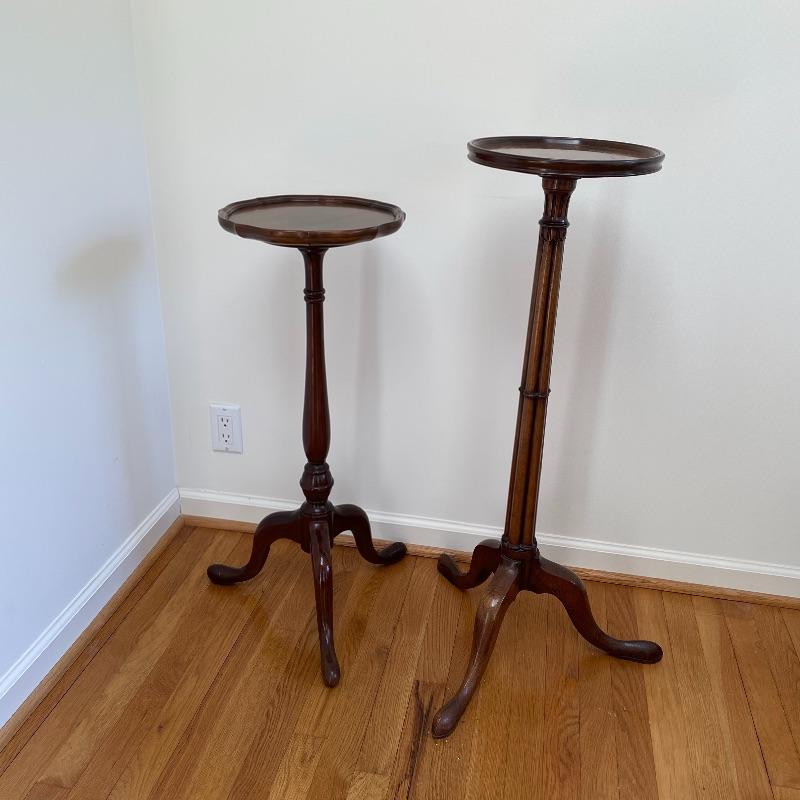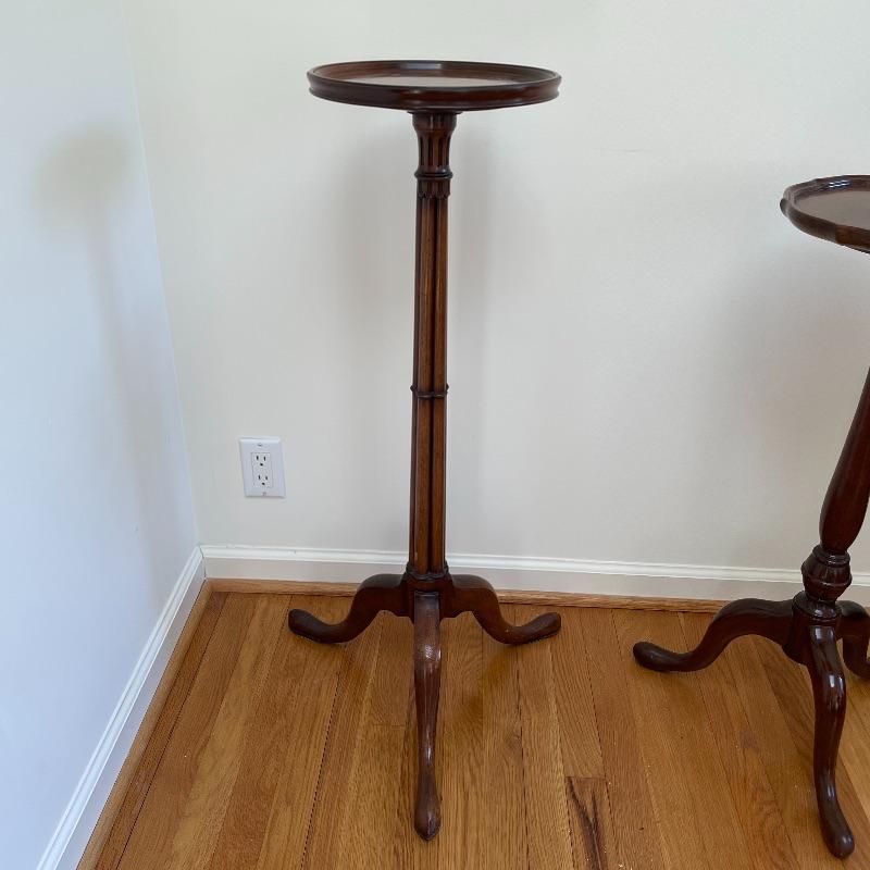 Two traditional wooden plant stands in remarkable condition. The Councill Craftsmen piece is a deep color with a hint of red. The other has a more intricate design and states it was Made in England. This piece is taller, measuring approximately 11” d (top) x 36” tall. The feet are approximately 16” apart. See photos. Local pick up only.