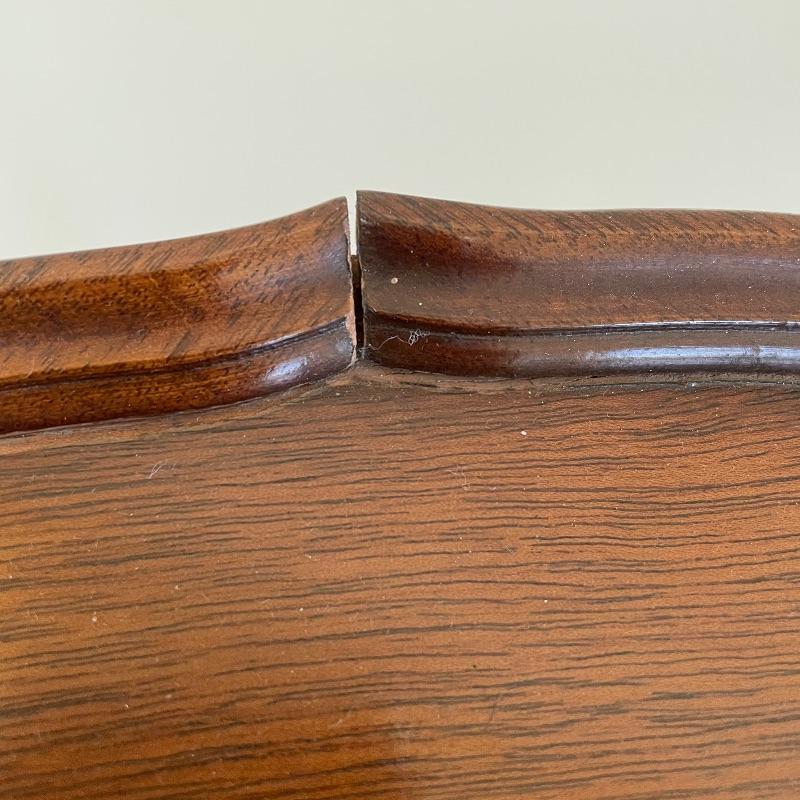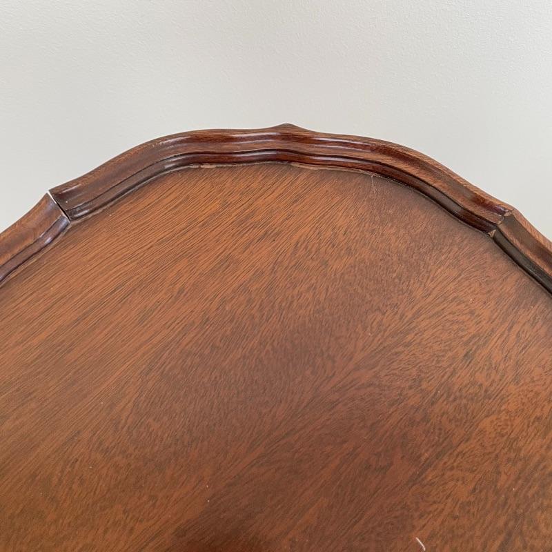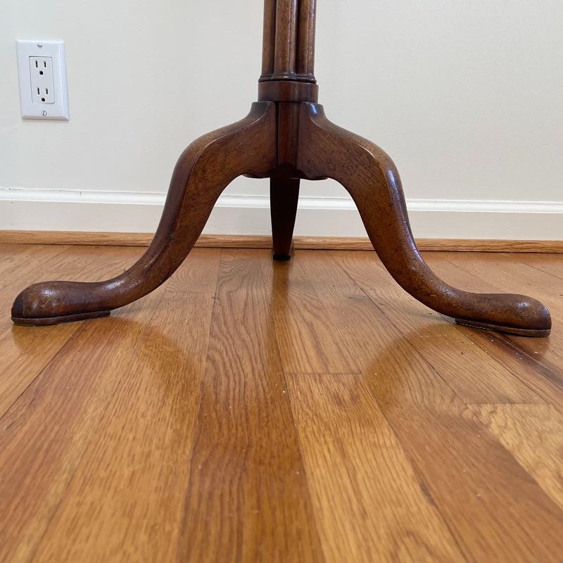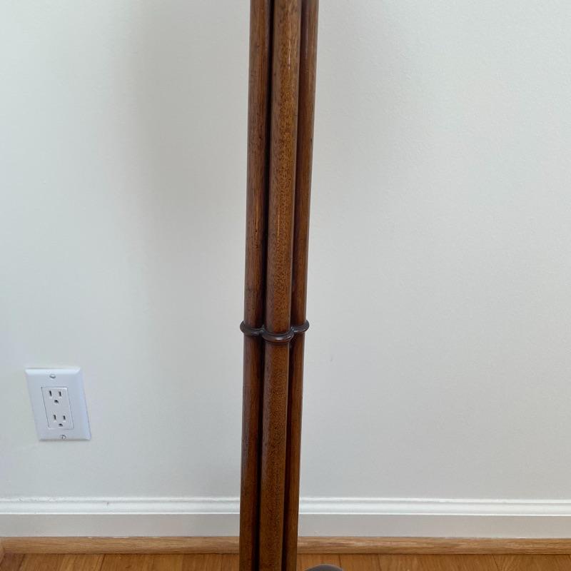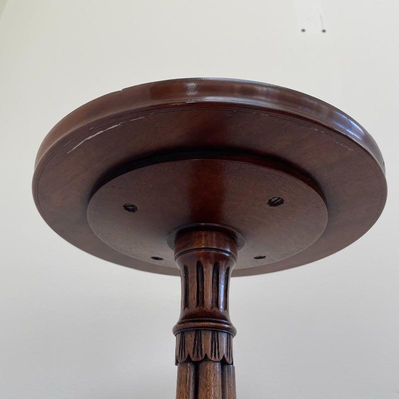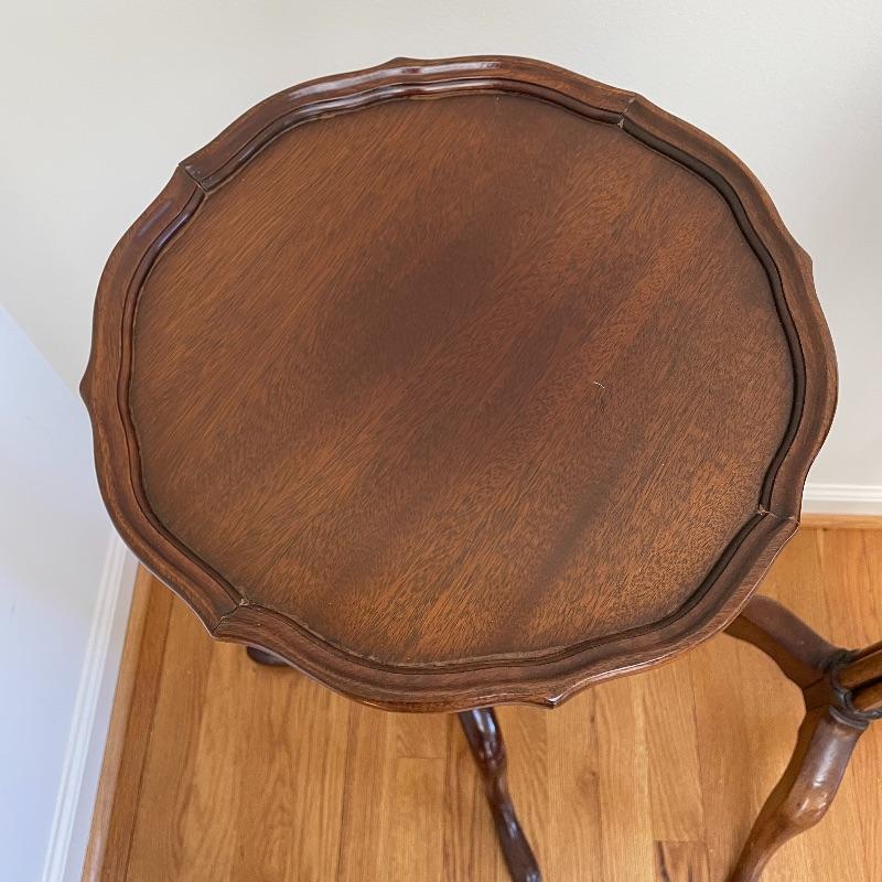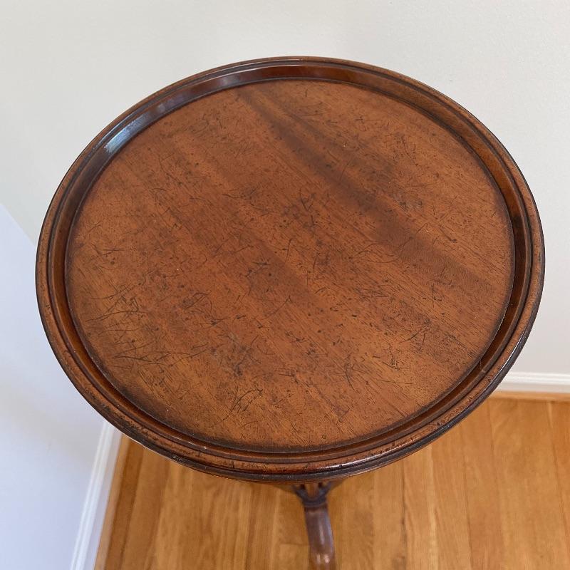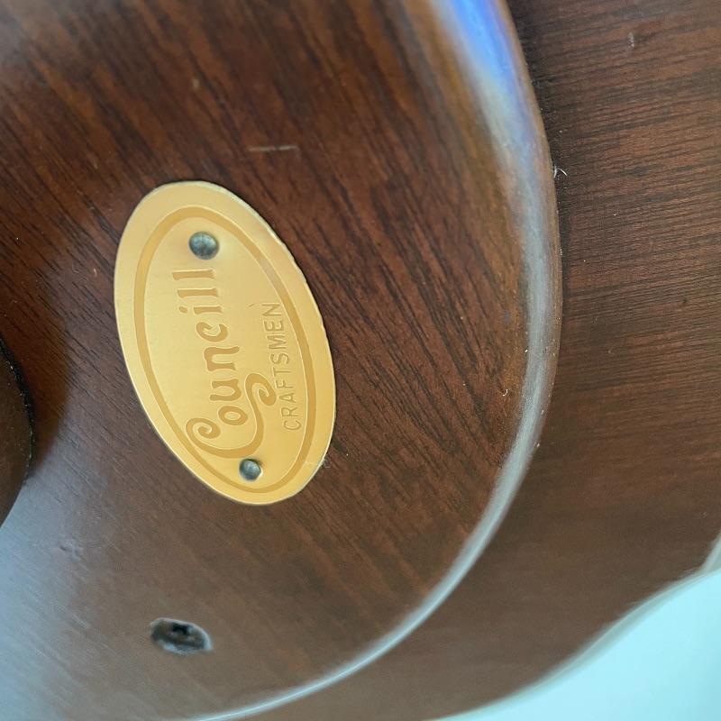 Two traditional wooden plant stands in remarkable condition. The Councill Craftsmen piece is a deep color with a hint of red. The other has a more intricate design and states it was Made in England. This piece is taller, measuring approximately 11” d (top) x 36” tall. The feet are approximately 16” apart. See photos. Local pick up only.
