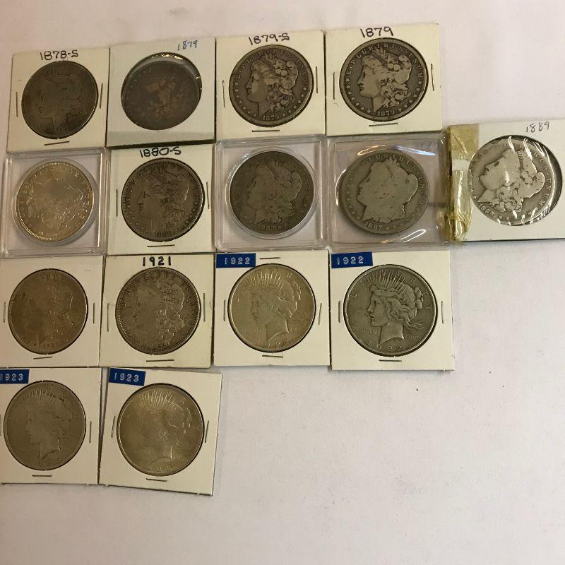 Fifteen Silver Dollars. Morgan and Peace. Various Dates between 1878 to 1923. See photos for dates.