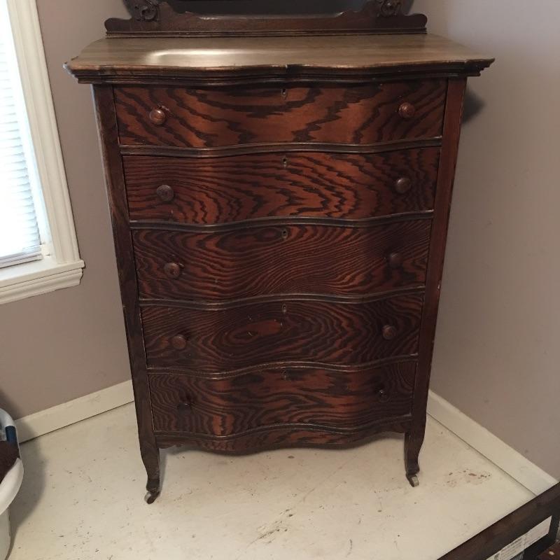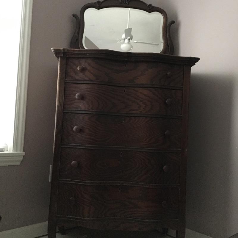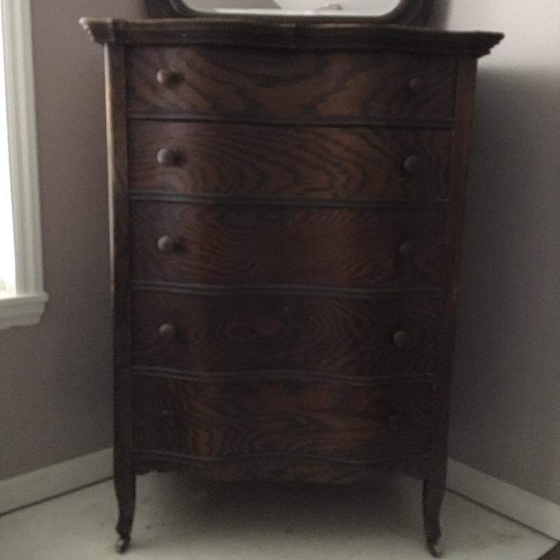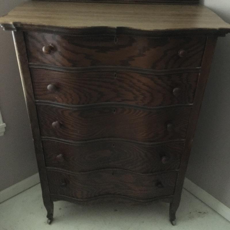 Beautiful vintage five drawer chest on wheels with attached mirror.
