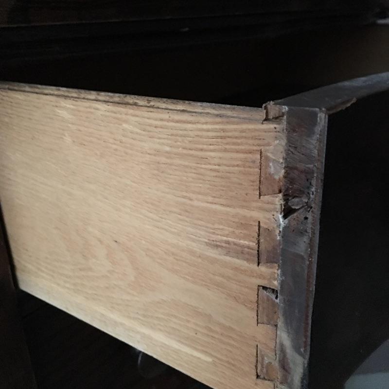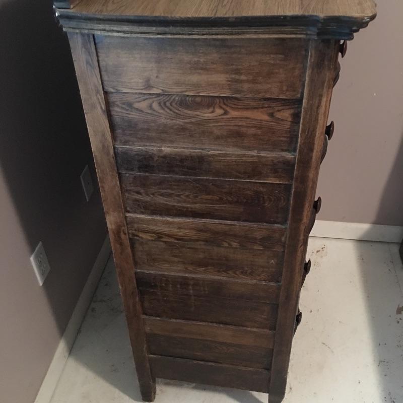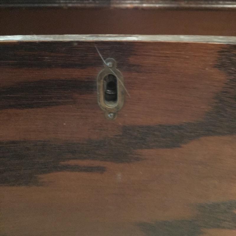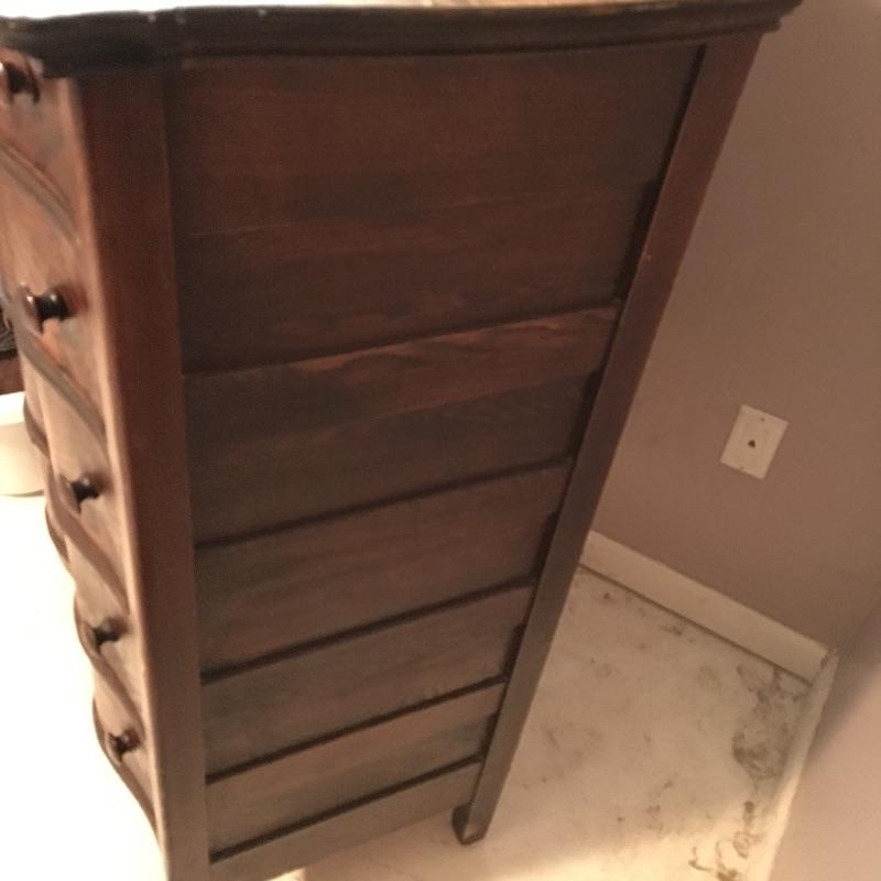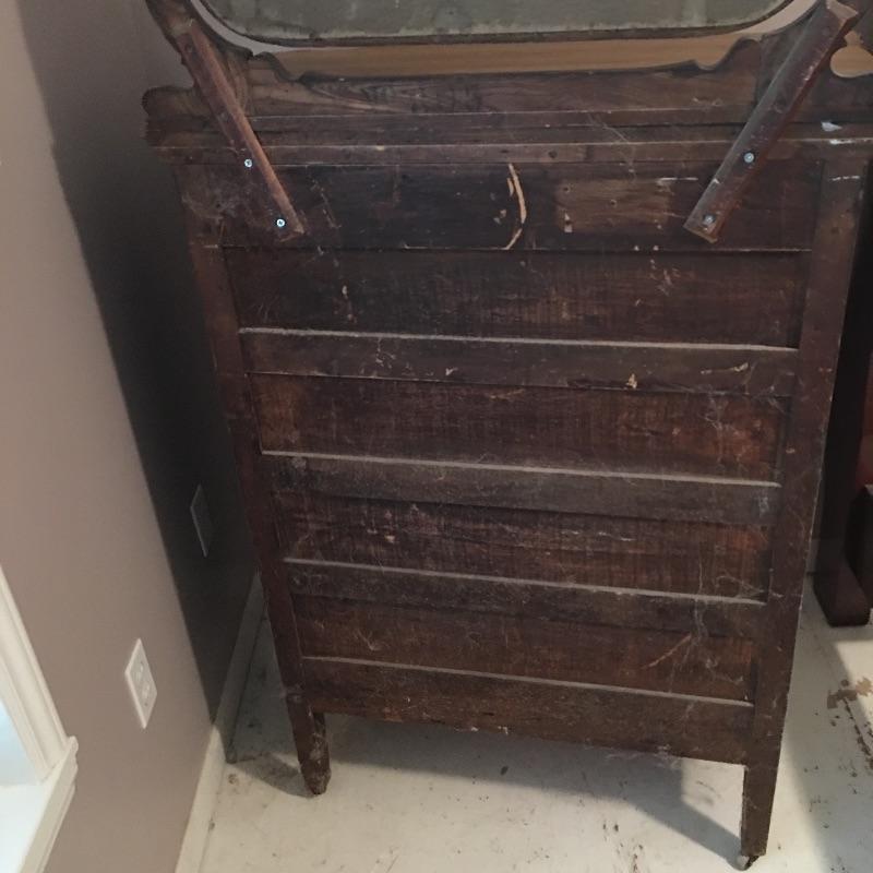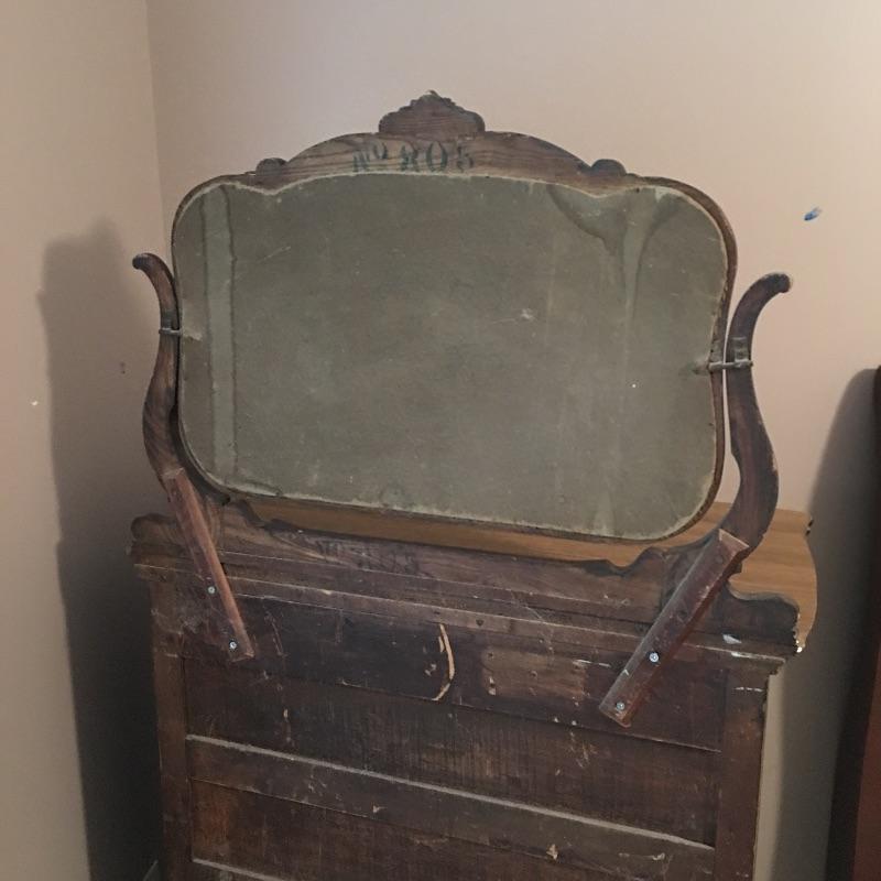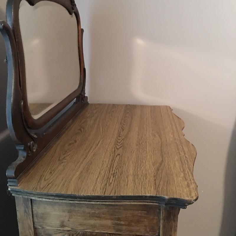 This is a beautiful piece but the top looks like stick on contact paper - see pictures. No key was found for drawers. Chest measures 18” x 33.5” x46.5”without mirror. Mirror measures 21” x 32”.
