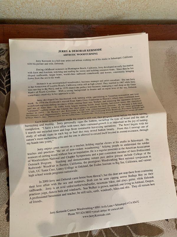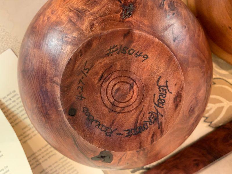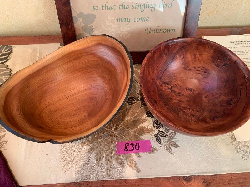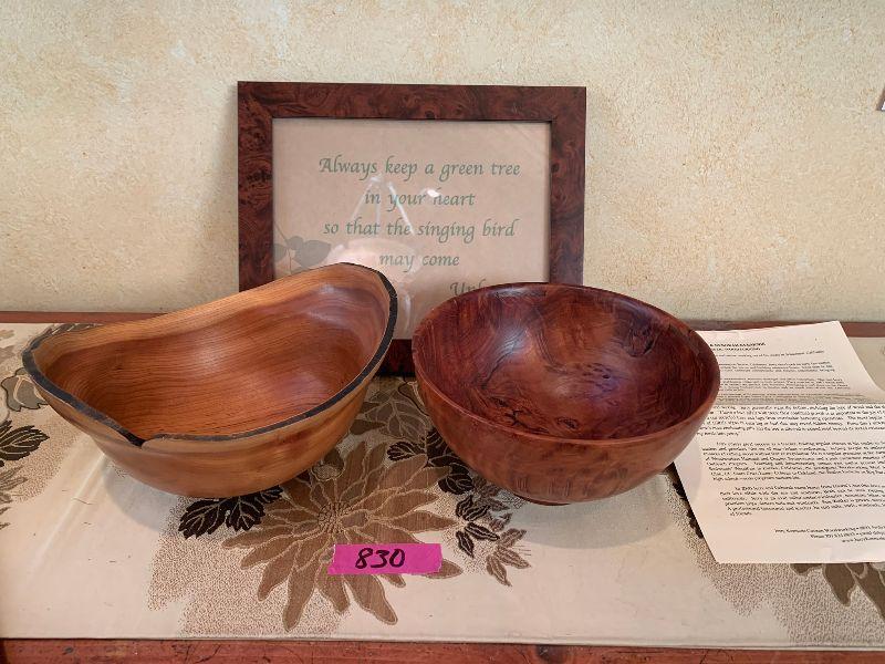 2 Wooden Bowls 1 by Jerry & Deborah Kermode solid edge 8" diameter and 1 by unknown artist and 1 picture with wood frame