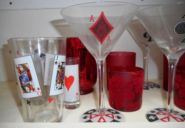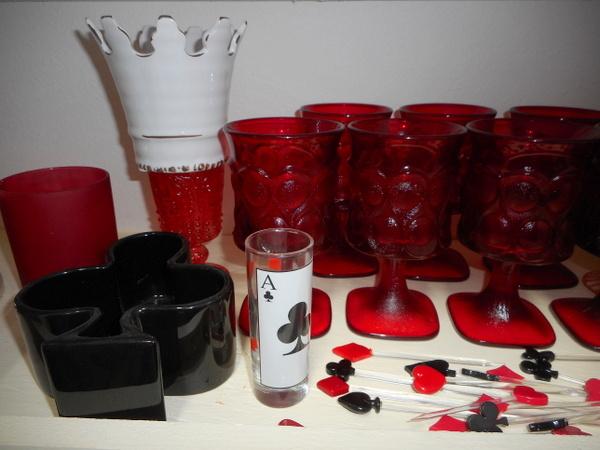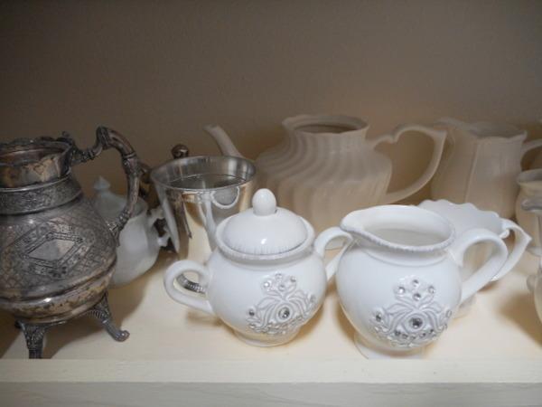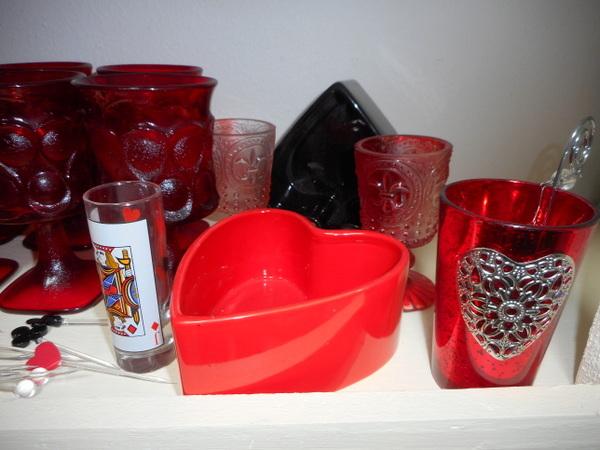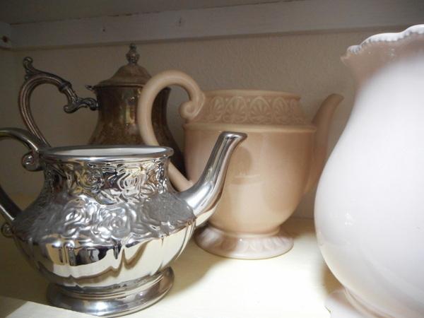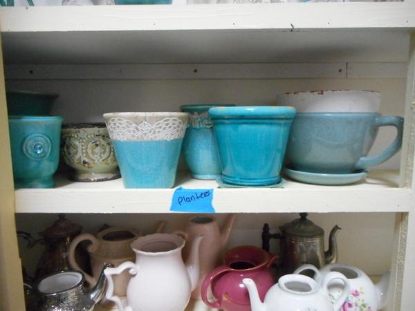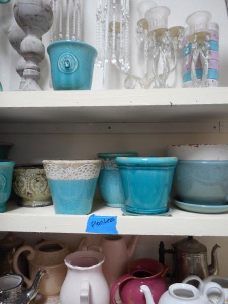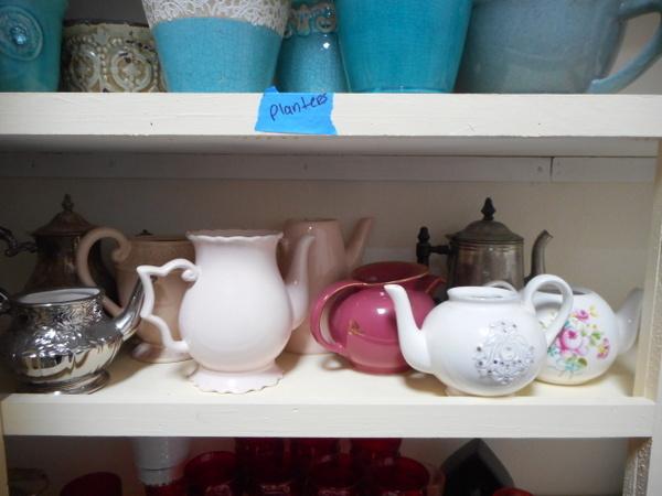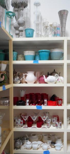 Lot 830 - Shelves Full of Glassware Teapots Planters Red Glass