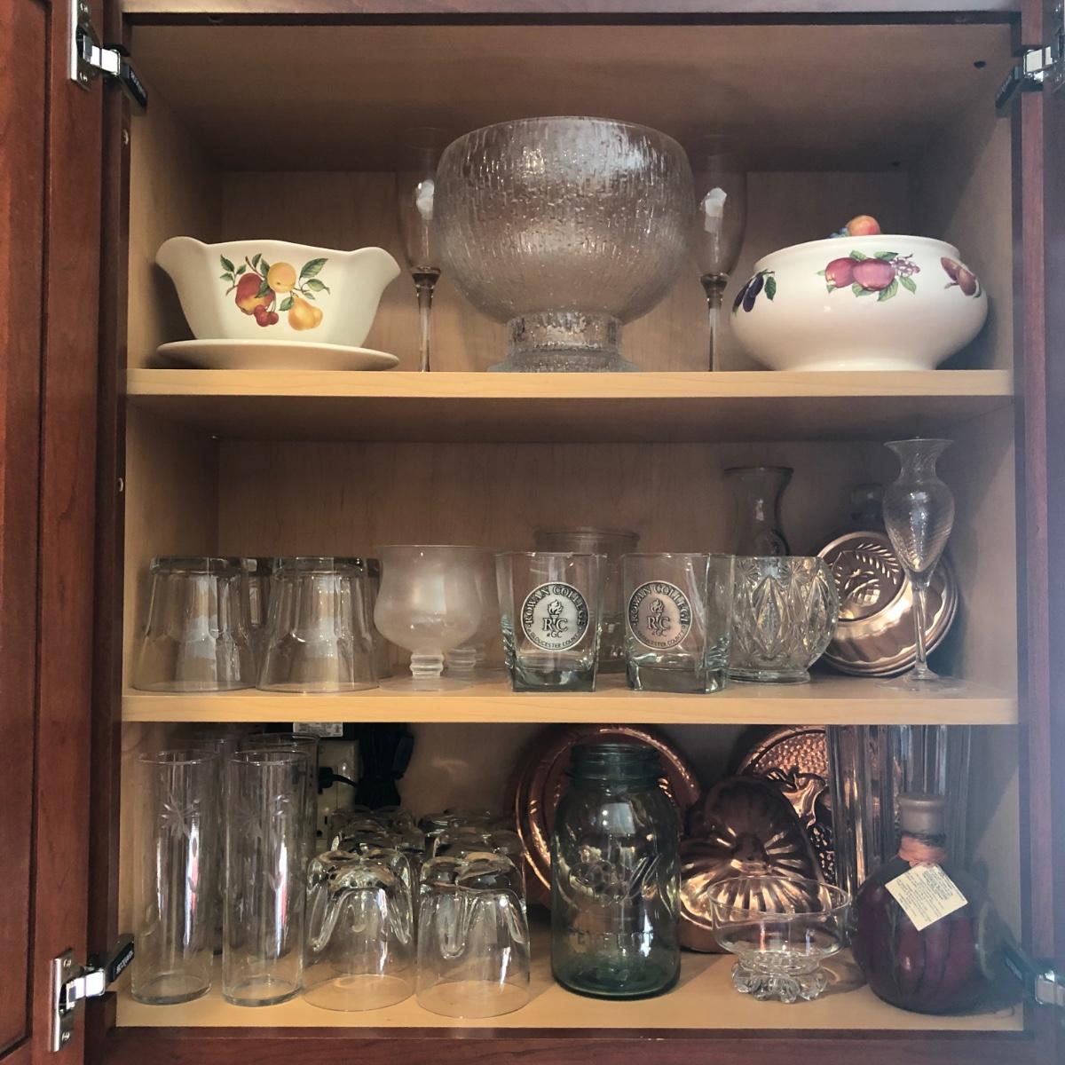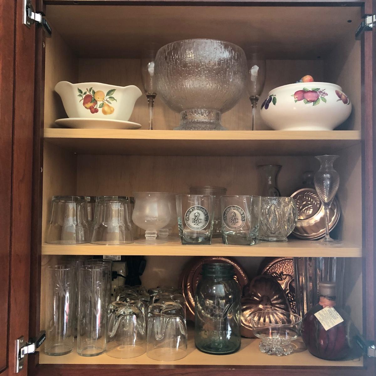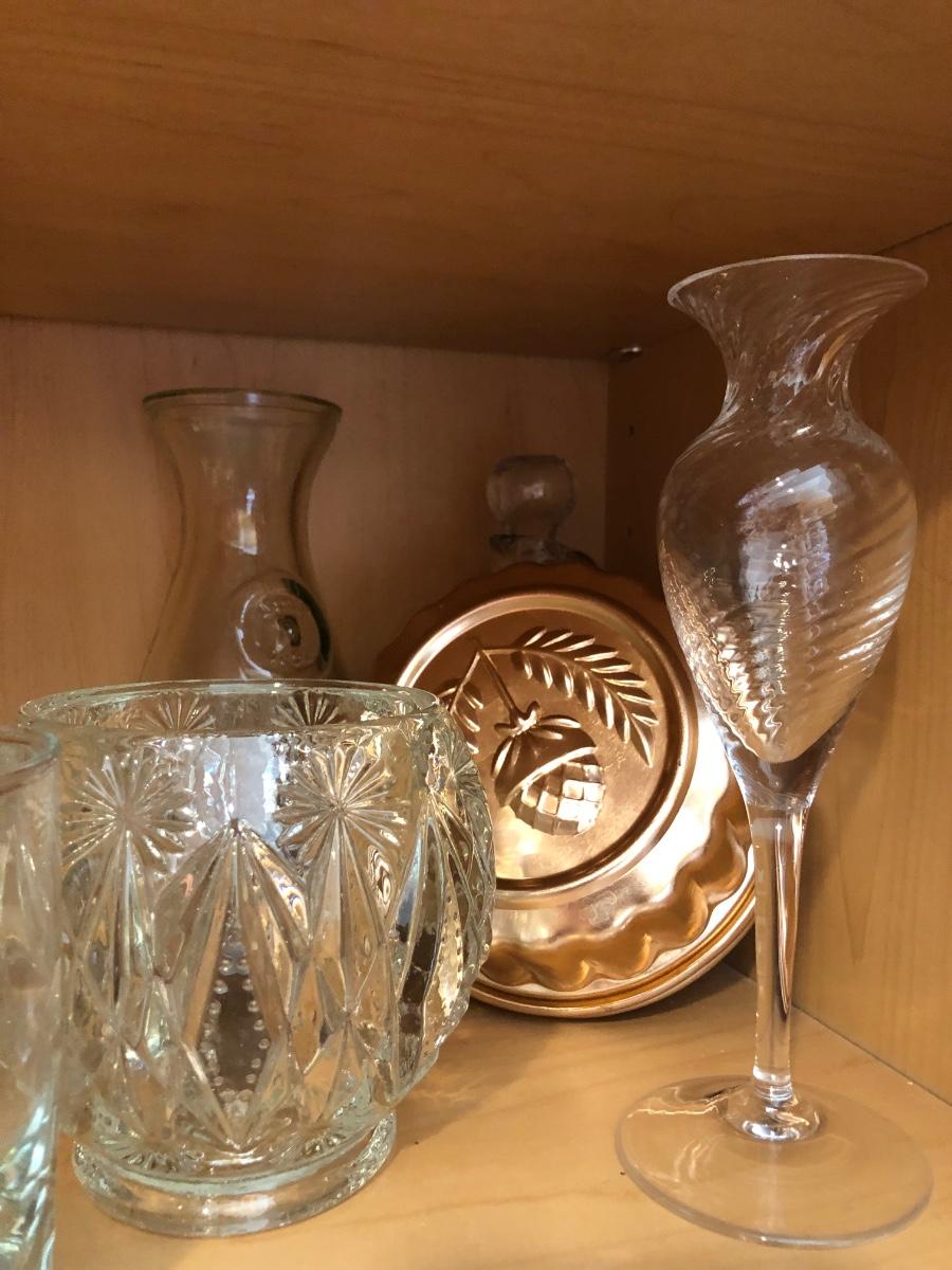 Cabinet full of glassware, copper jello molds for decor, punch bowl, vase and more. Pre-owned with some wear. Please see all pictures as they are the best representation of the items. The pictures show condition, measurements if taken, and what is included in the lot. Due to the large amount that we photograph and the time frame, we are not always able to take measurements. All items unless noted, are pre-owned and have been used. If you purchased furniture, you must bring help. We do not allow one person to carry large furniture out on their own. Bring help, tools and a truck for the safety of our client’s homes, and your personal safety. Any damages that result to the property including walls, and floors due to moving of the furniture will be charged to the buyer. Company policy. Thank you.