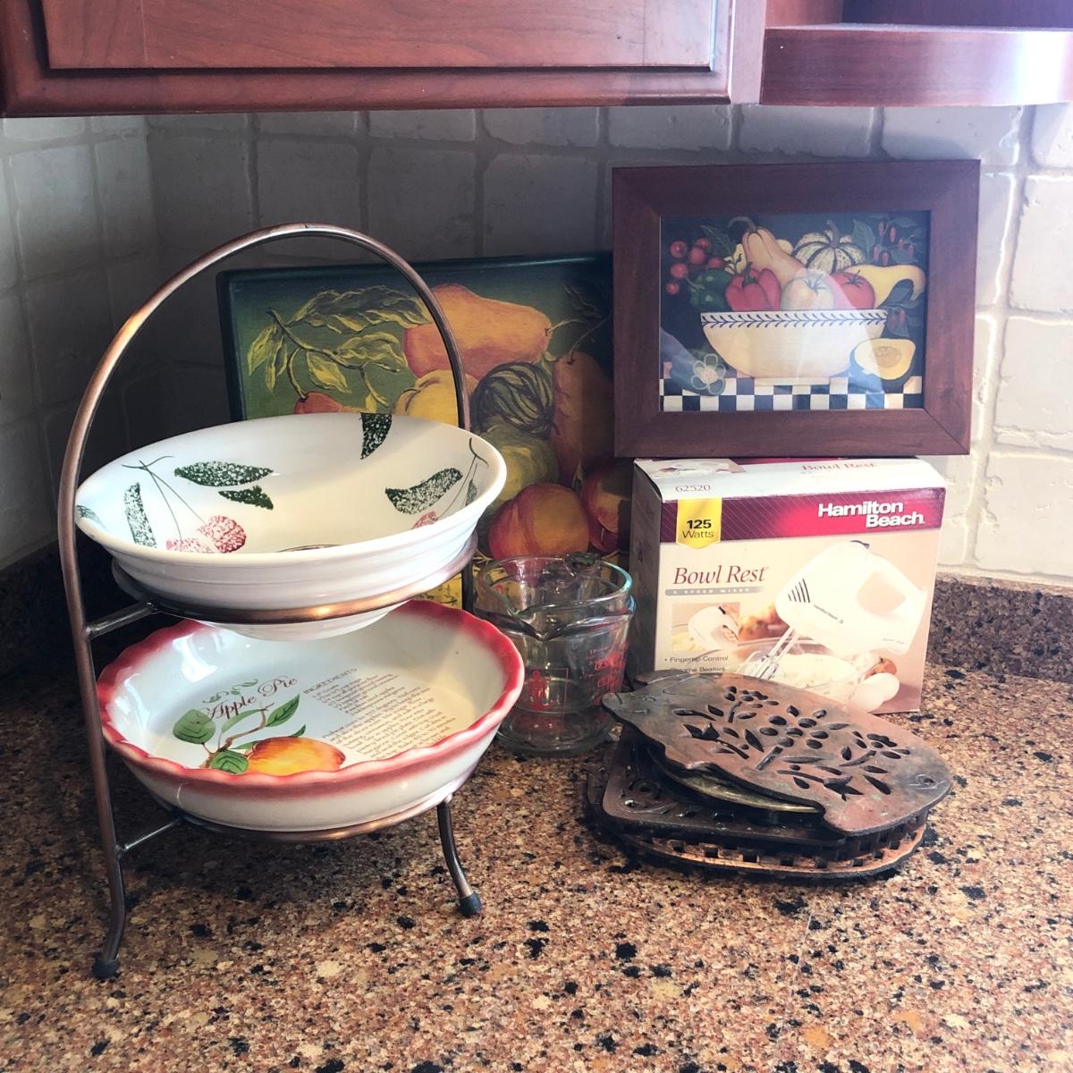 Mixed lot of kitchen items including decorative and useful metal trivets, Hamilton Beach bowl rest mixer, decorative tray and more. All pre-owned with minor wear from use. Please see all pictures as they are the best representation of the items. The pictures show condition, measurements if taken, and what is included in the lot. Due to the large amount that we photograph and the time frame, we are not always able to take measurements. All items unless noted, are pre-owned and have been used. If you purchased furniture, you must bring help. We do not allow one person to carry large furniture out on their own. Bring help, tools and a truck for the safety of our client’s homes, and your personal safety. Any damages that result to the property including walls, and floors due to moving of the furniture will be charged to the buyer. Company policy. Thank you.