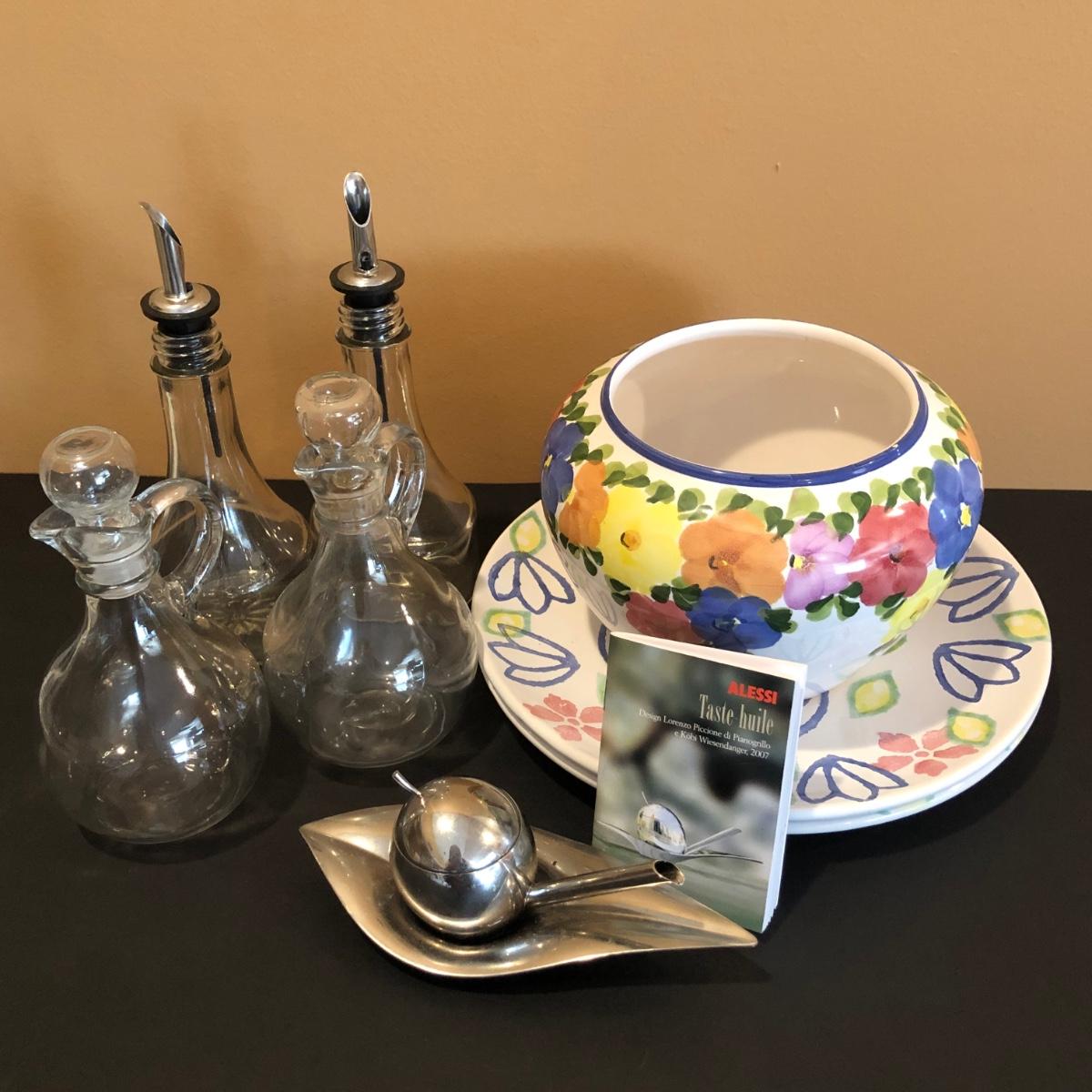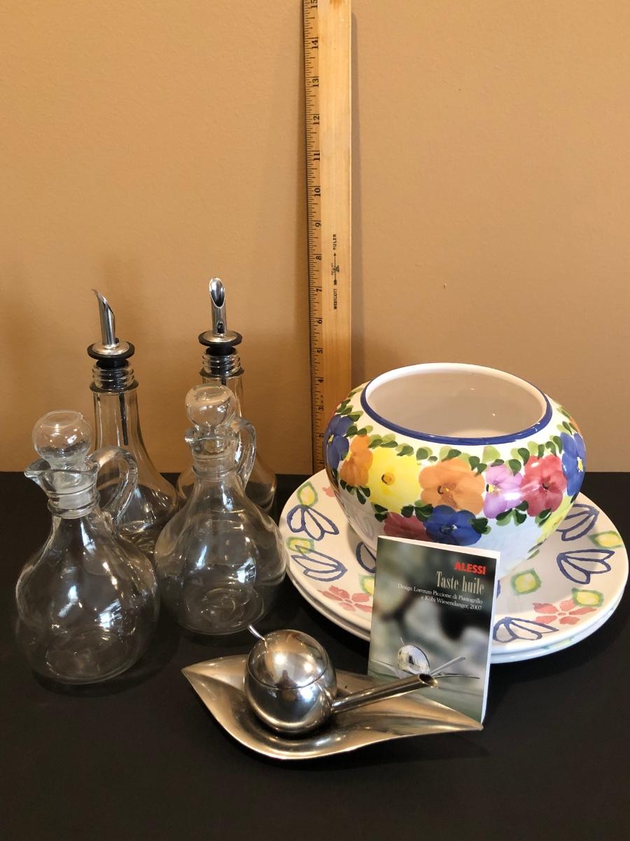Nice lot of kitchen items including glass cruets sets, hand painted decorative bowl, and Alessi olive oil taster set. All pre-owned with light wear from use. Please see all pictures as they are the best representation of the items. The pictures show condition, measurements if taken, and what is included in the lot. Due to the large amount that we photograph and the time frame, we are not always able to take measurements. All items unless noted, are pre-owned and have been used. If you purchased furniture, you must bring help. We do not allow one person to carry large furniture out on their own. Bring help, tools and a truck for the safety of our client’s homes, and your personal safety. Any damages that result to the property including walls, and floors due to moving of the furniture will be charged to the buyer. Company policy. Thank you.