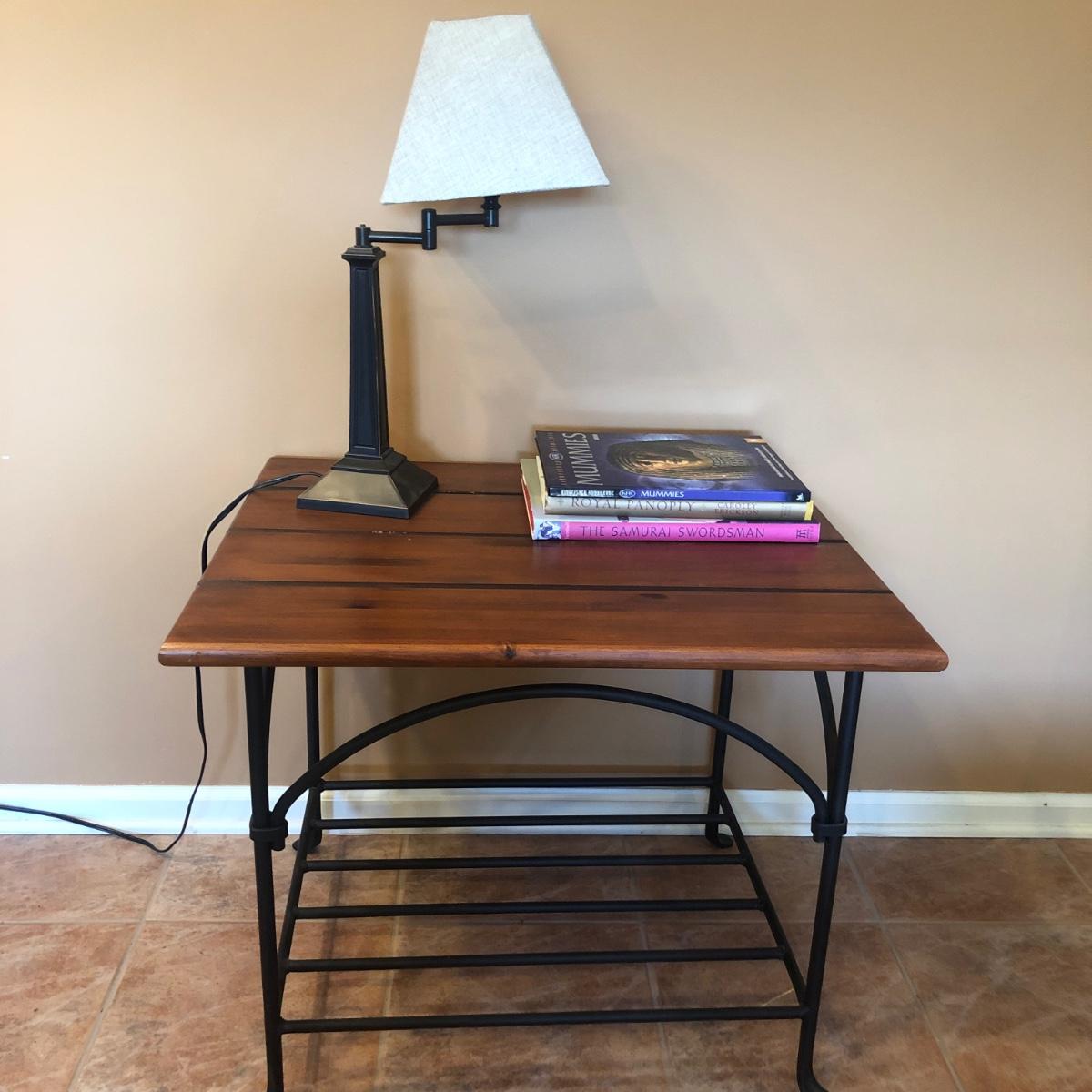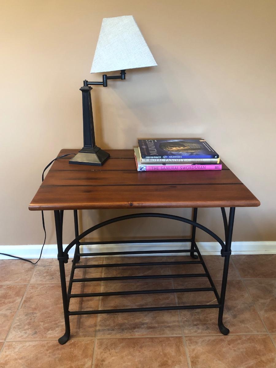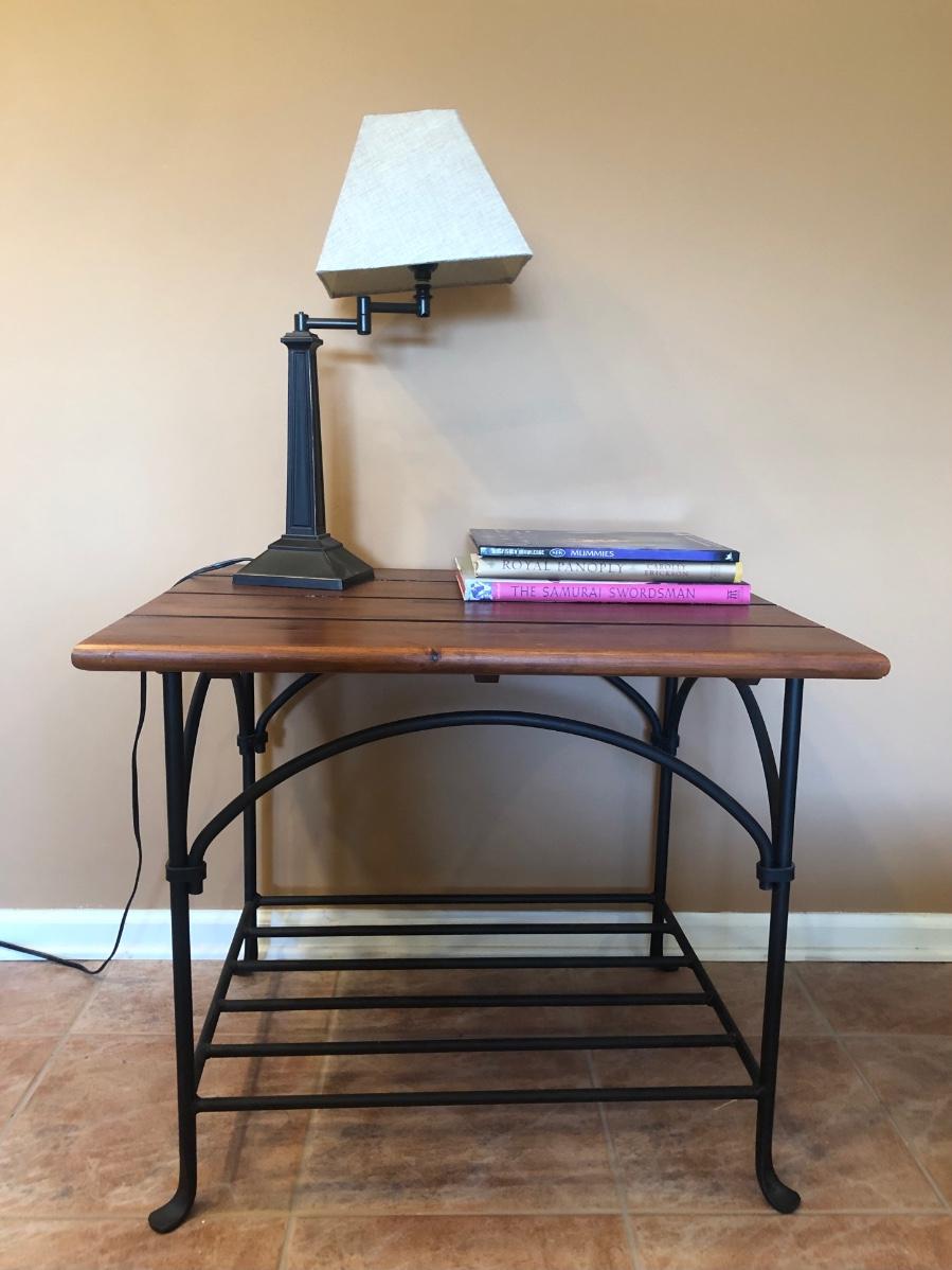 Metal with wood top modern designed table, with coordinating black lamp, and coffee table books. All pre-owned with minor wear from use. Please see all pictures as they are the best representation of the items. The pictures show condition, measurements if taken, and what is included in the lot. Due to the large amount that we photograph and the time frame, we are not always able to take measurements. All items unless noted, are pre-owned and have been used. If you purchased furniture, you must bring help. We do not allow one person to carry large furniture out on their own. Bring help, tools and a truck for the safety of our client’s homes, and your personal safety. Any damages that result to the property including walls, and floors due to moving of the furniture will be charged to the buyer. Company policy. Thank you.