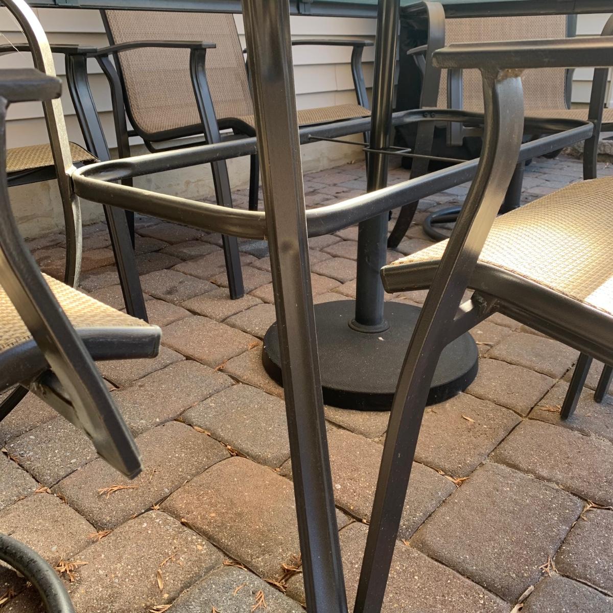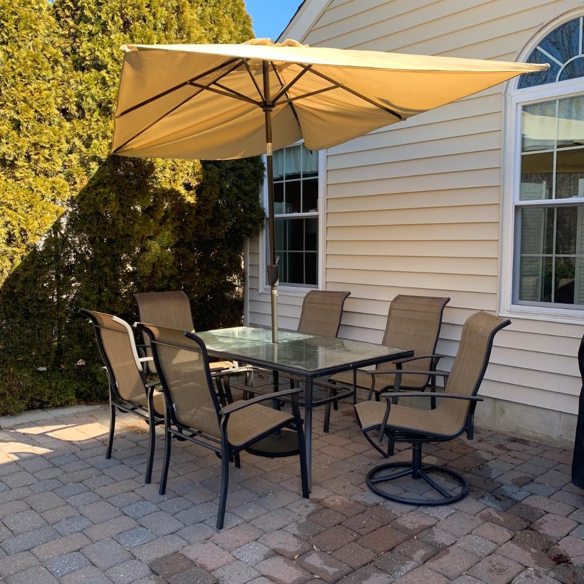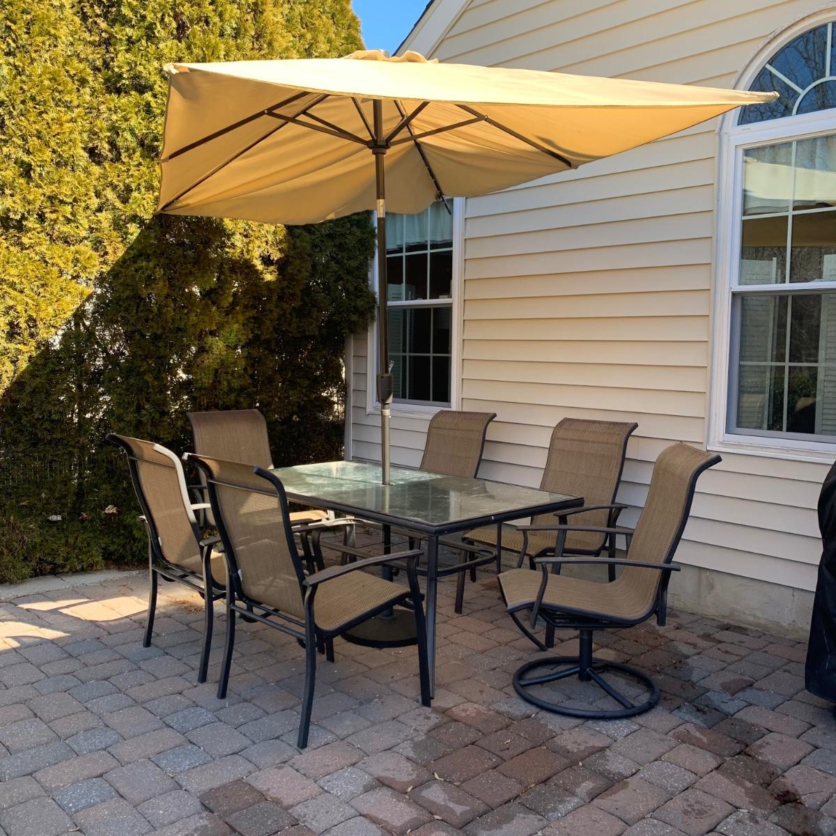 Nice pre-owned outdoor patio table set with umbrella, table, and six chairs. As seen in pictures, structurally sound with wear from normal use and being outdoors. Please see all pictures as they are the best representation of the items. The pictures show condition, measurements if taken, and what is included in the lot. Due to the large amount that we photograph and the time frame, we are not always able to take measurements. All items unless noted, are pre-owned and have been used. If you purchased furniture, you must bring help. We do not allow one person to carry large furniture out on their own. Bring help, tools and a truck for the safety of our client’s homes, and your personal safety. Any damages that result to the property including walls, and floors due to moving of the furniture will be charged to the buyer. Company policy. Thank you.