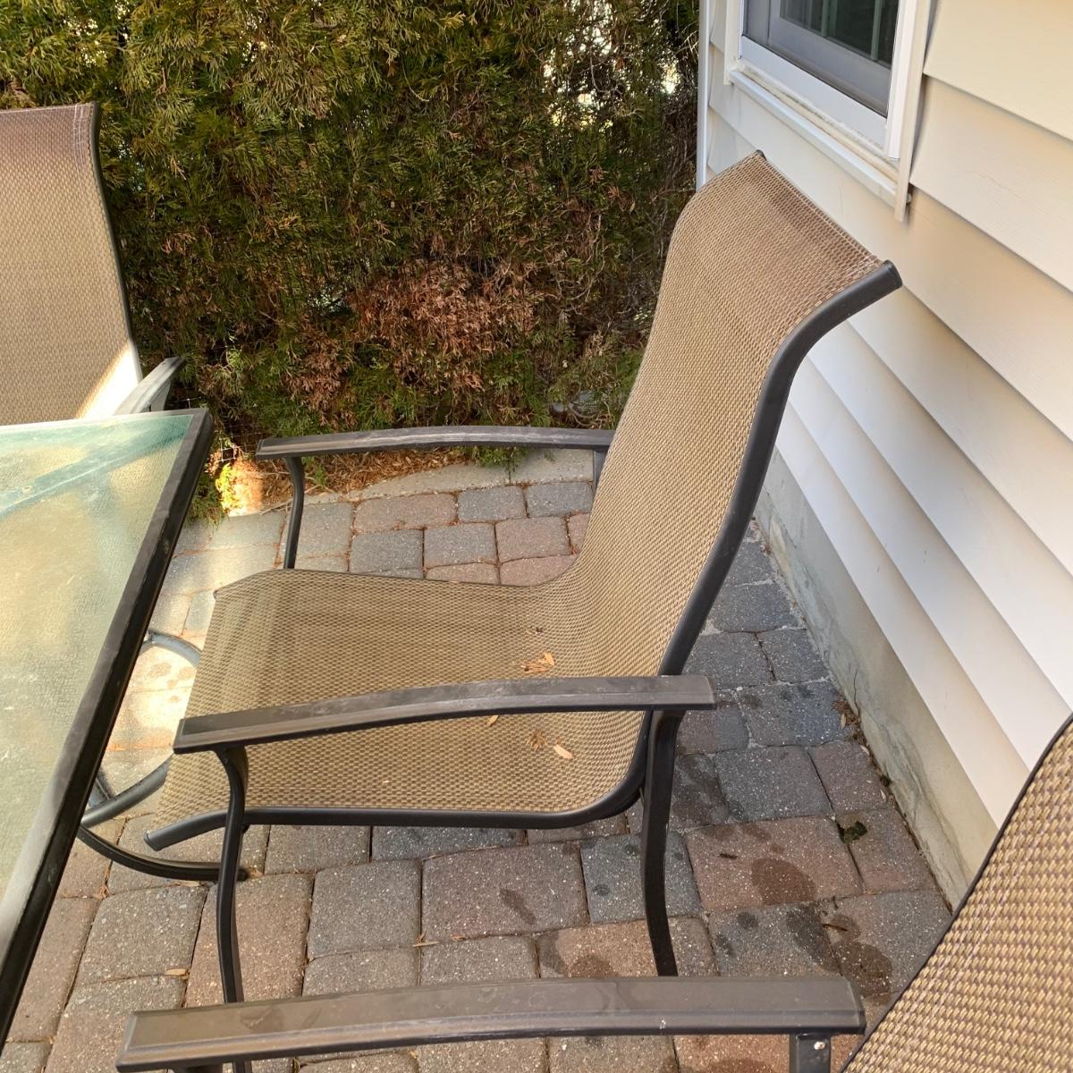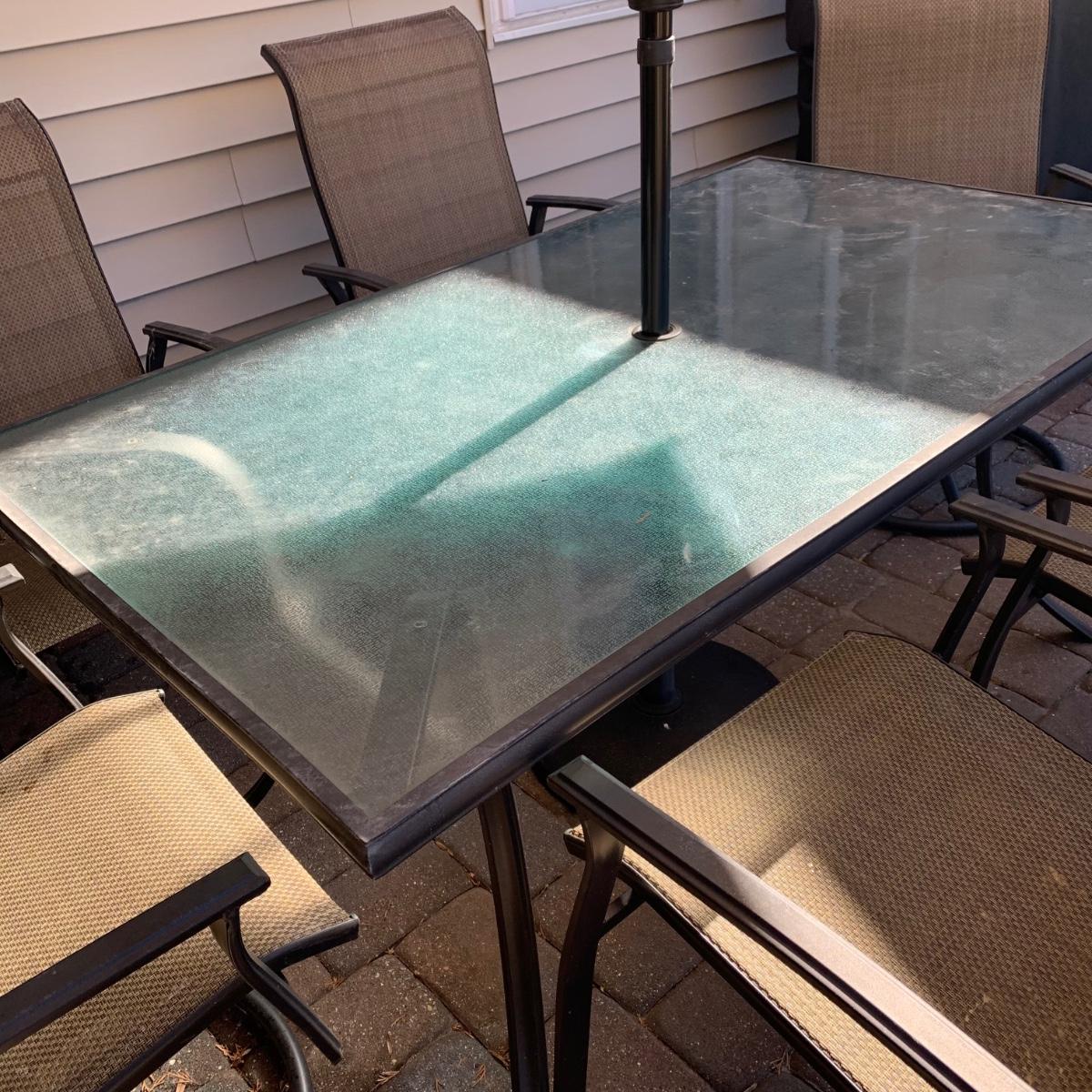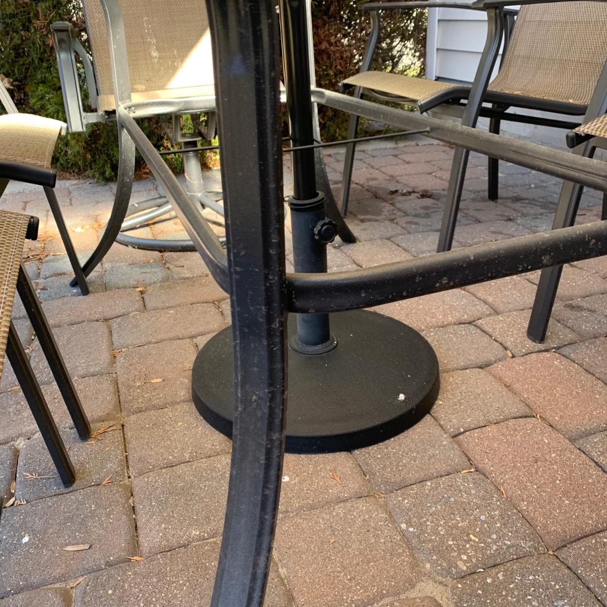 Nice pre-owned outdoor patio table set with umbrella, table, and six chairs. As seen in pictures, structurally sound with wear from normal use and being outdoors. Please see all pictures as they are the best representation of the items. The pictures show condition, measurements if taken, and what is included in the lot. Due to the large amount that we photograph and the time frame, we are not always able to take measurements. All items unless noted, are pre-owned and have been used. If you purchased furniture, you must bring help. We do not allow one person to carry large furniture out on their own. Bring help, tools and a truck for the safety of our client’s homes, and your personal safety. Any damages that result to the property including walls, and floors due to moving of the furniture will be charged to the buyer. Company policy. Thank you.
