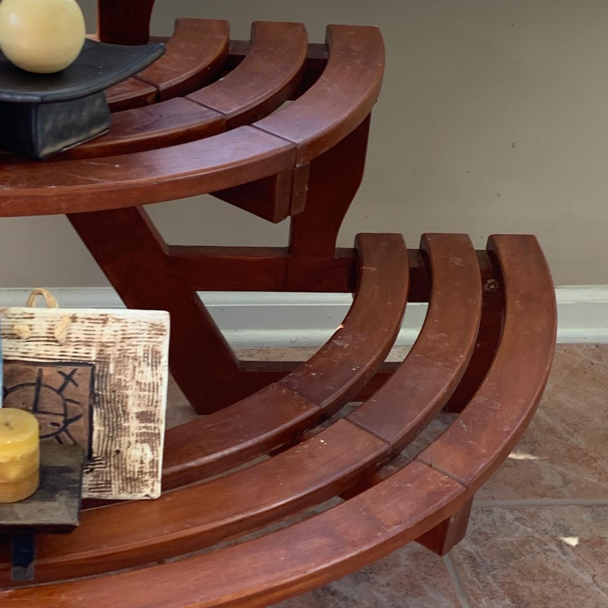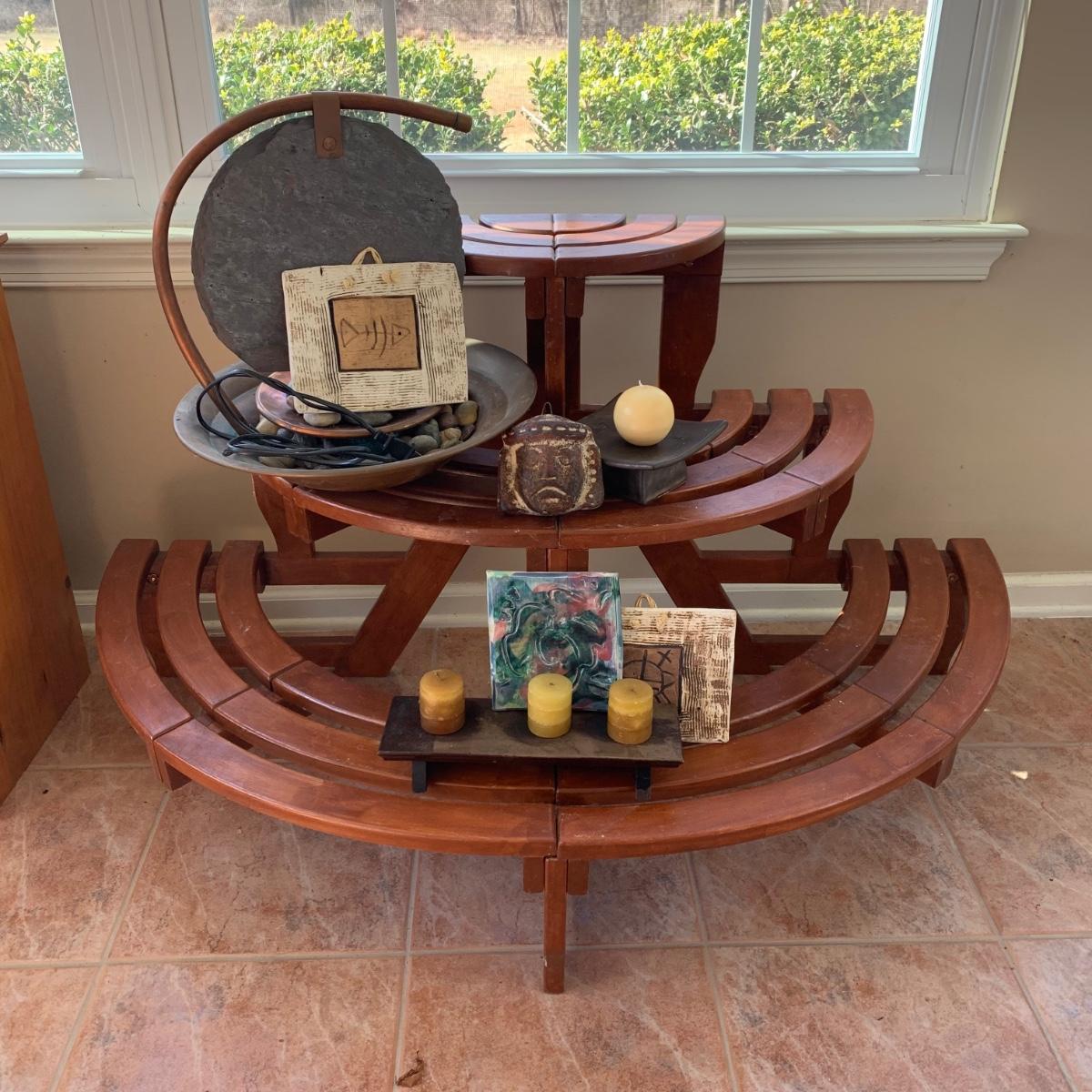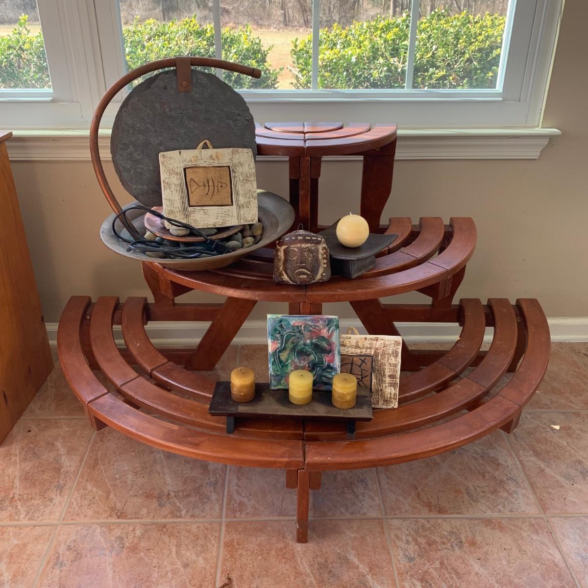 Three level tiered arched wood plant stand. Perfect for indoor or out. Also included is rock water fountain with gong design ( untested), candles, and more. All pre-owned with some wear from use. Please see all pictures as they are the best representation of the items. The pictures show condition, measurements if taken, and what is included in the lot. Due to the large amount that we photograph and the time frame, we are not always able to take measurements. All items unless noted, are pre-owned and have been used. If you purchased furniture, you must bring help. We do not allow one person to carry large furniture out on their own. Bring help, tools and a truck for the safety of our client’s homes, and your personal safety. Any damages that result to the property including walls, and floors due to moving of the furniture will be charged to the buyer. Company policy. Thank you.