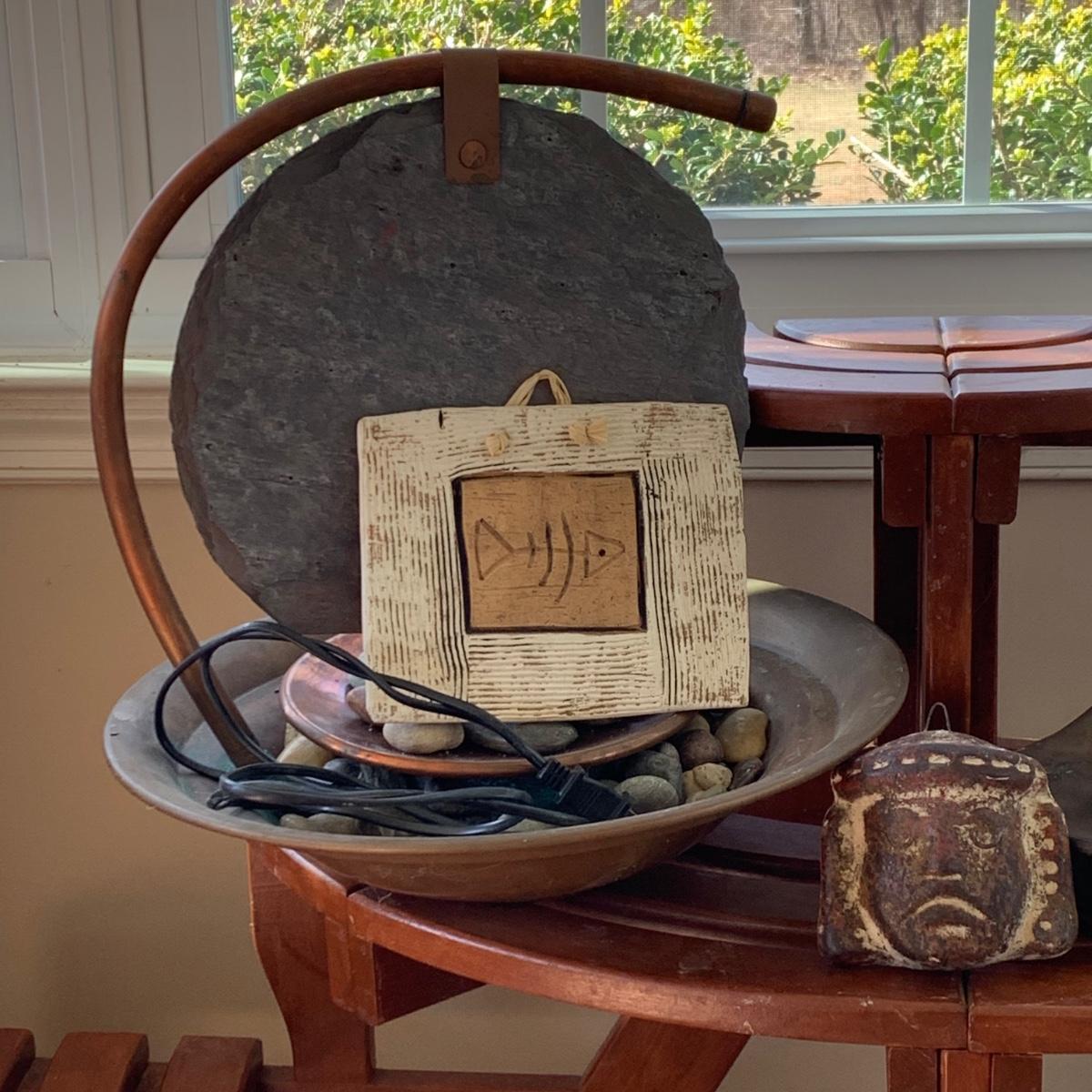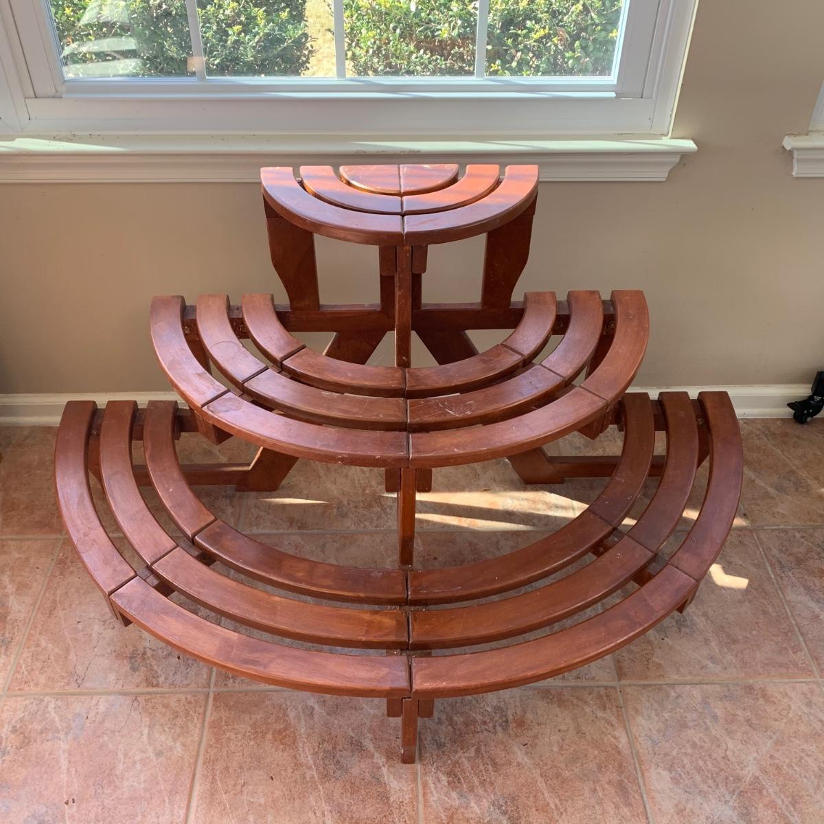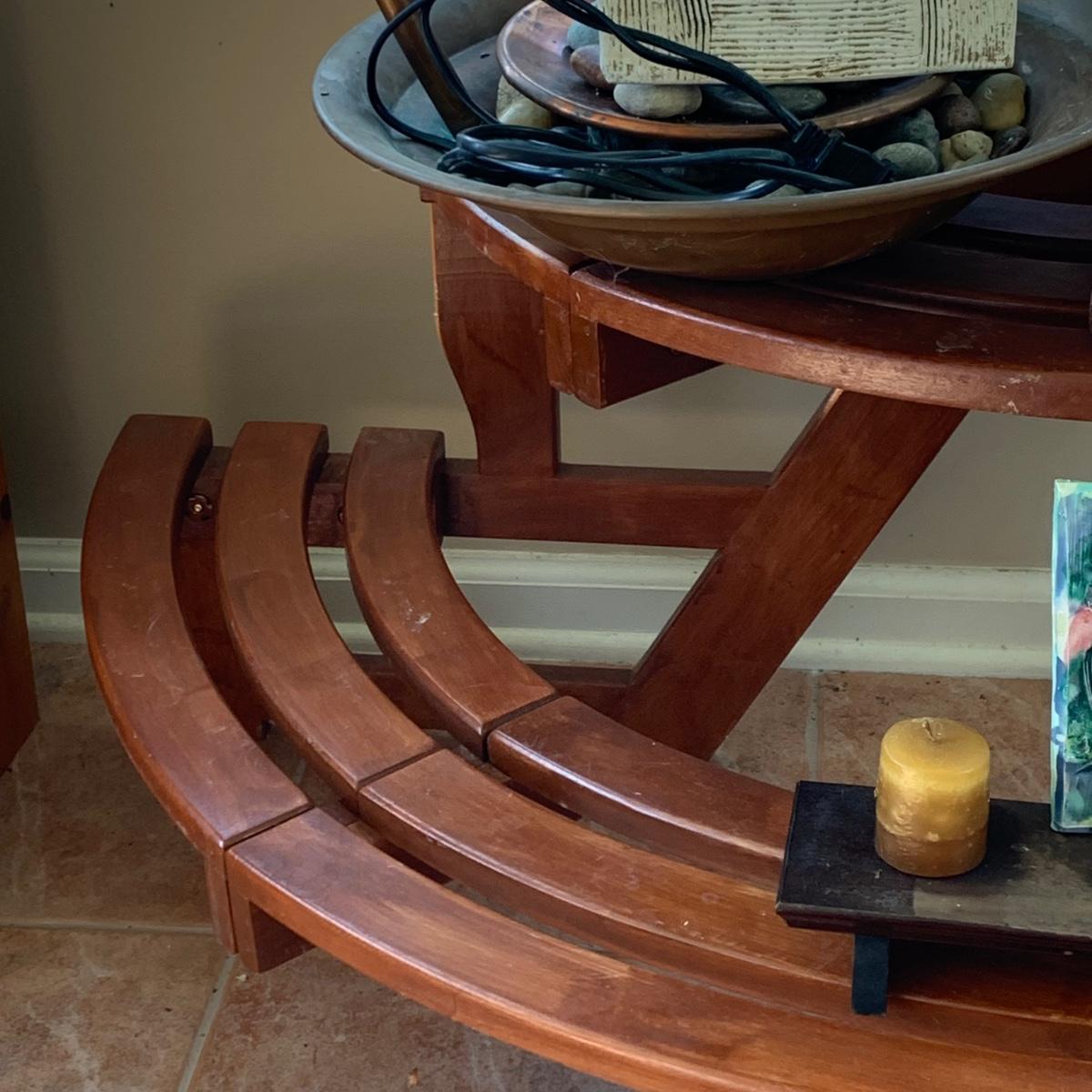 Three level tiered arched wood plant stand. Perfect for indoor or out. Also included is rock water fountain with gong design ( untested), candles, and more. All pre-owned with some wear from use. Please see all pictures as they are the best representation of the items. The pictures show condition, measurements if taken, and what is included in the lot. Due to the large amount that we photograph and the time frame, we are not always able to take measurements. All items unless noted, are pre-owned and have been used. If you purchased furniture, you must bring help. We do not allow one person to carry large furniture out on their own. Bring help, tools and a truck for the safety of our client’s homes, and your personal safety. Any damages that result to the property including walls, and floors due to moving of the furniture will be charged to the buyer. Company policy. Thank you.