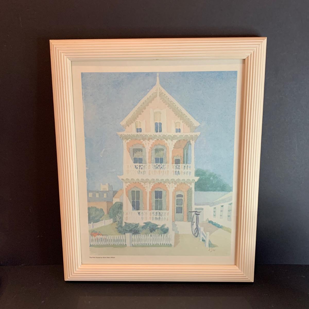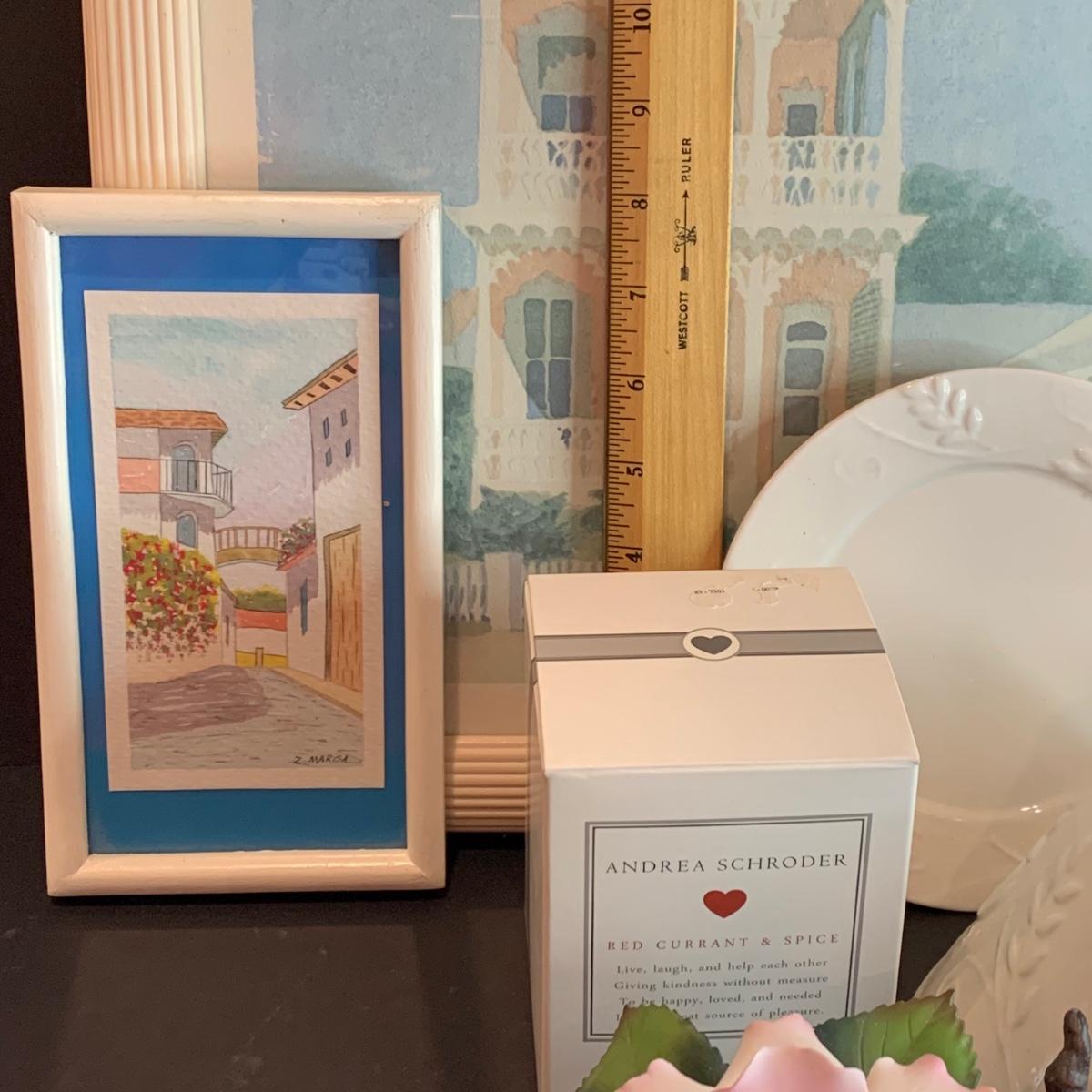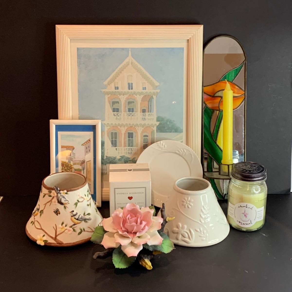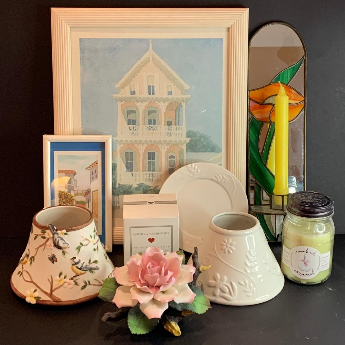 LOT 32R: Stained Glass Mirrored Candle Holder, Framed & Signed Print, "The Pink House" Print, Porcelain Rose & More