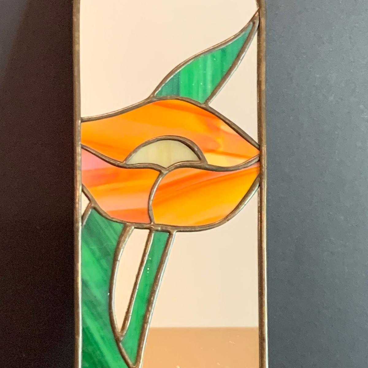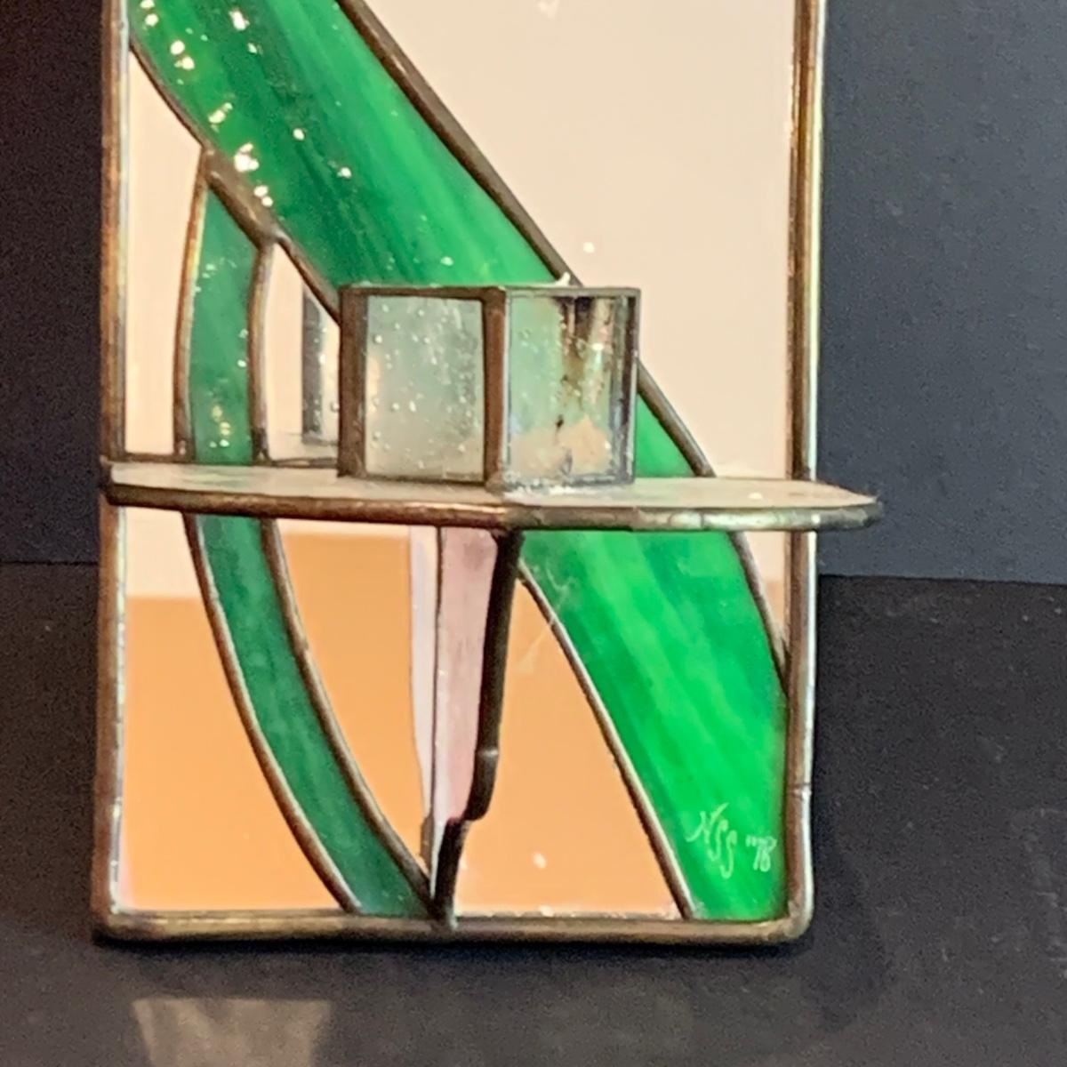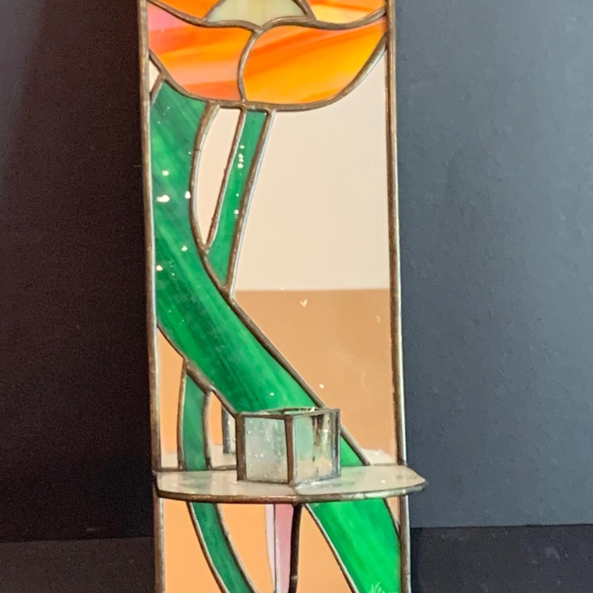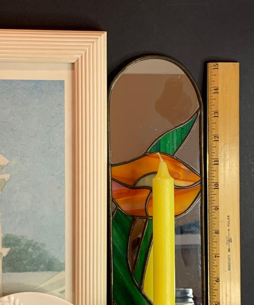 Mirrored floral stained glass wall sconce, framed prints, candles,candle shades and a porcelain rose.