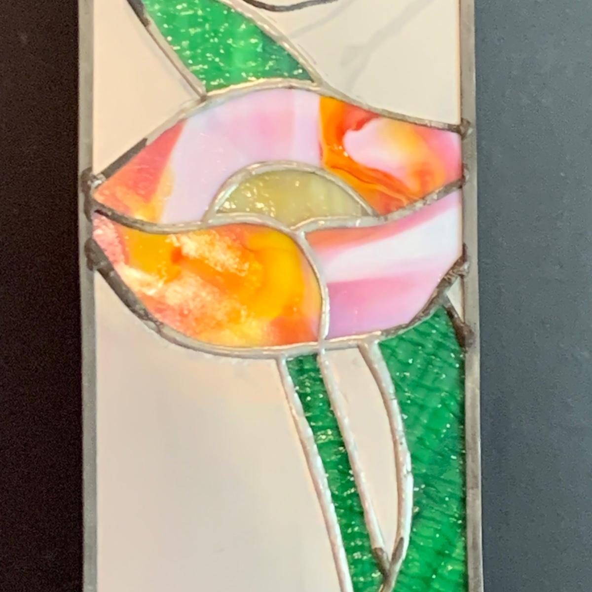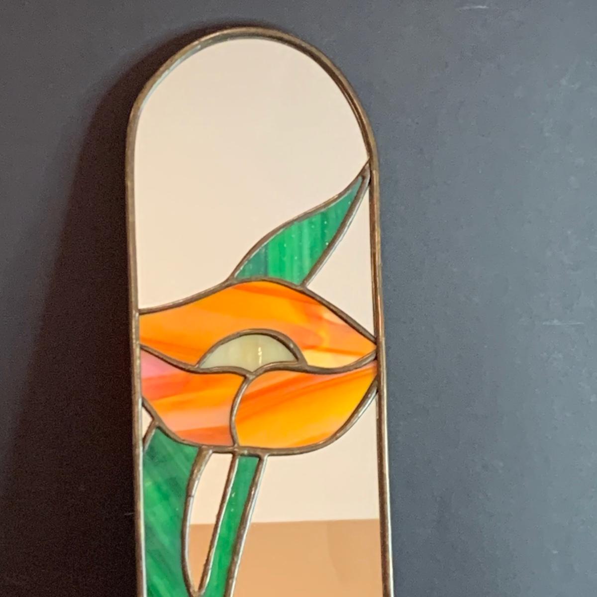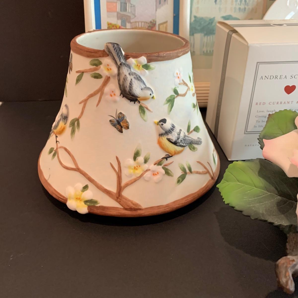 Mirrored floral stained glass wall sconce, framed prints, candles,candle shades and a porcelain rose.