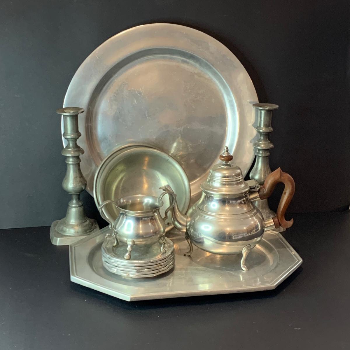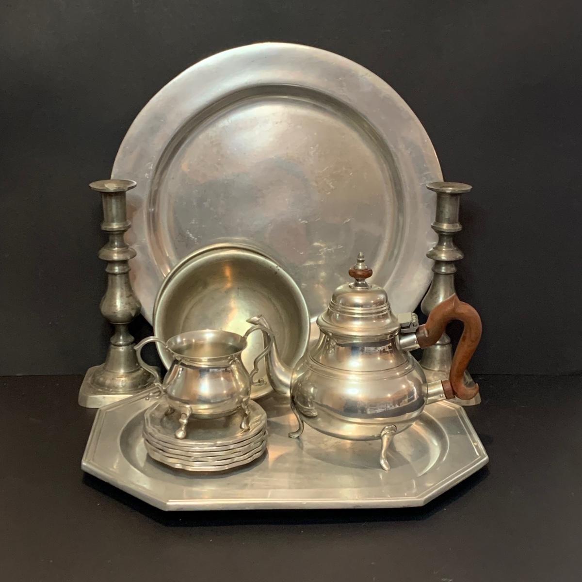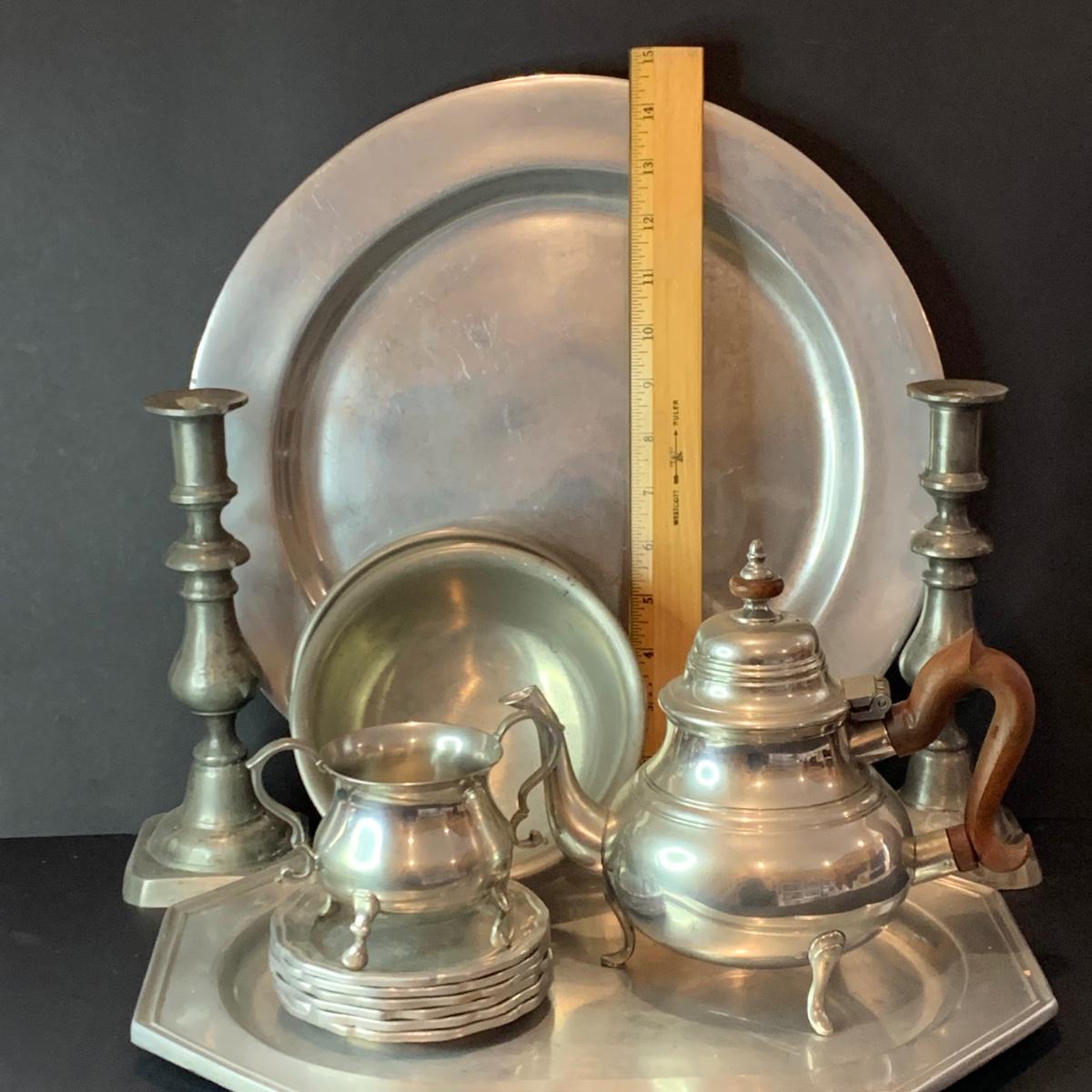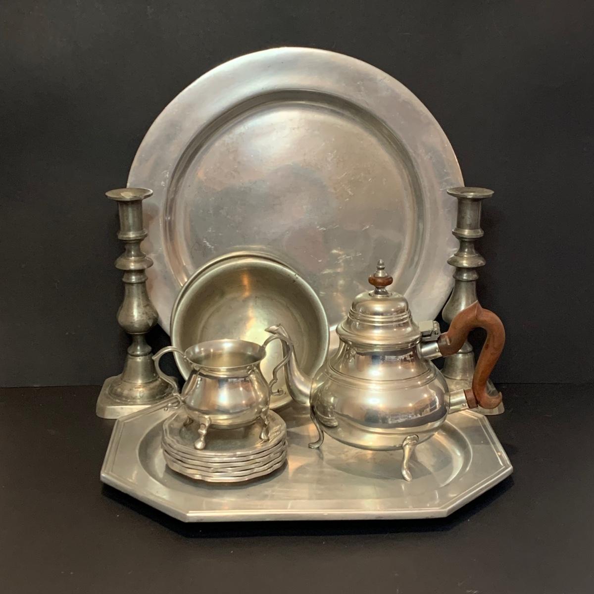 LOT 38R: Vintage Williamsburg  Pewter Teapot & Sugar Bowl, Pewter Candlesticks, Platters etc.