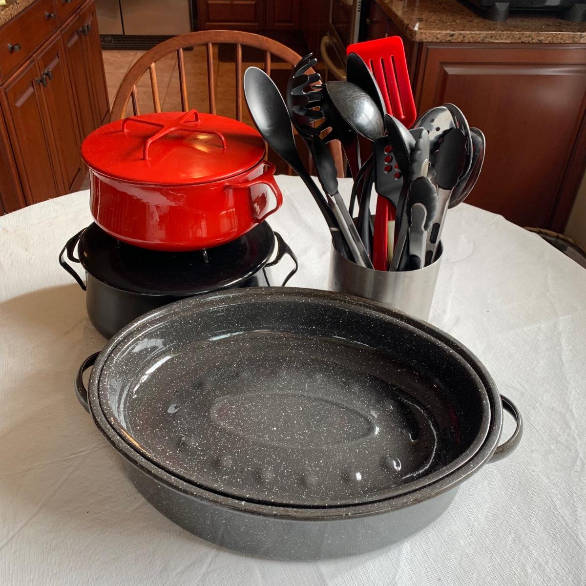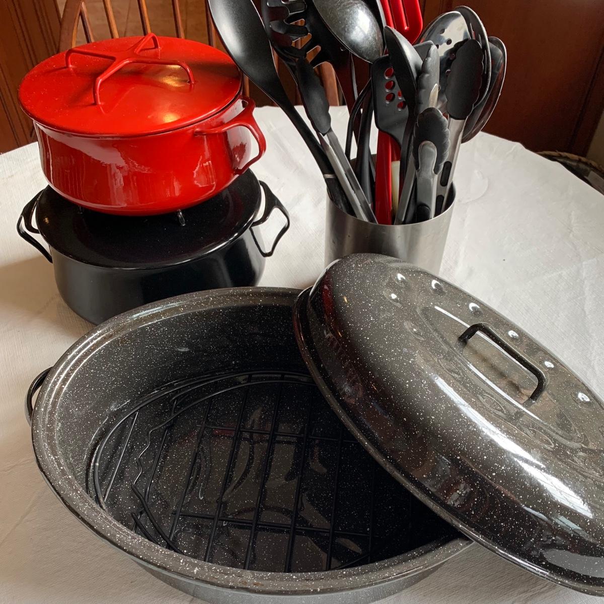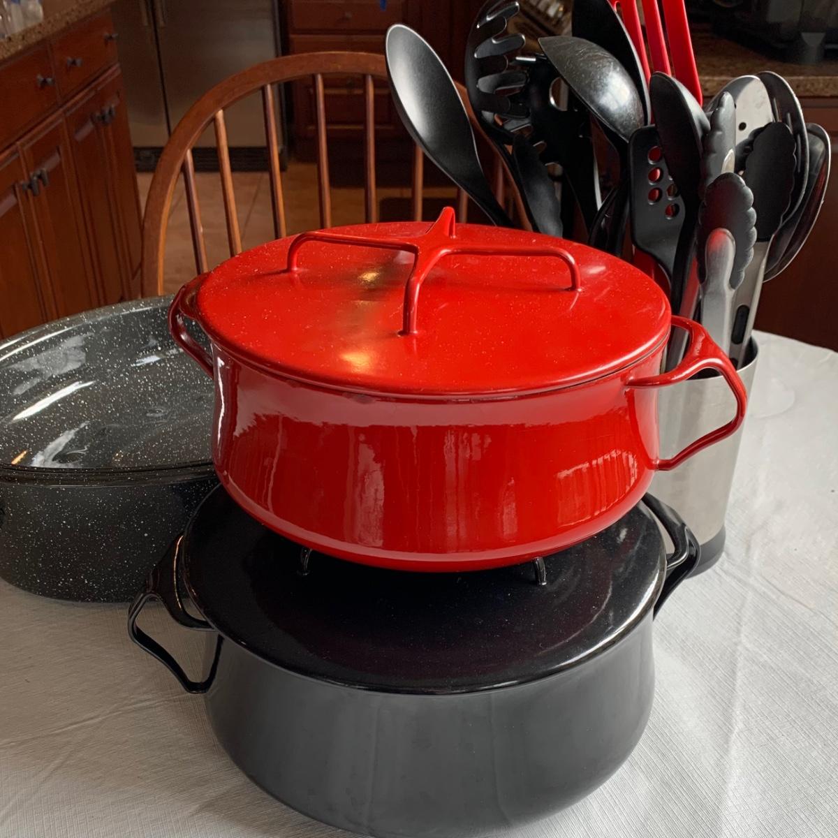 LOT 39R:  Dansk Kobenstyle Chili Red & Midnight Casserole Pots, Roaster, Utensils in Steel Finish Holder