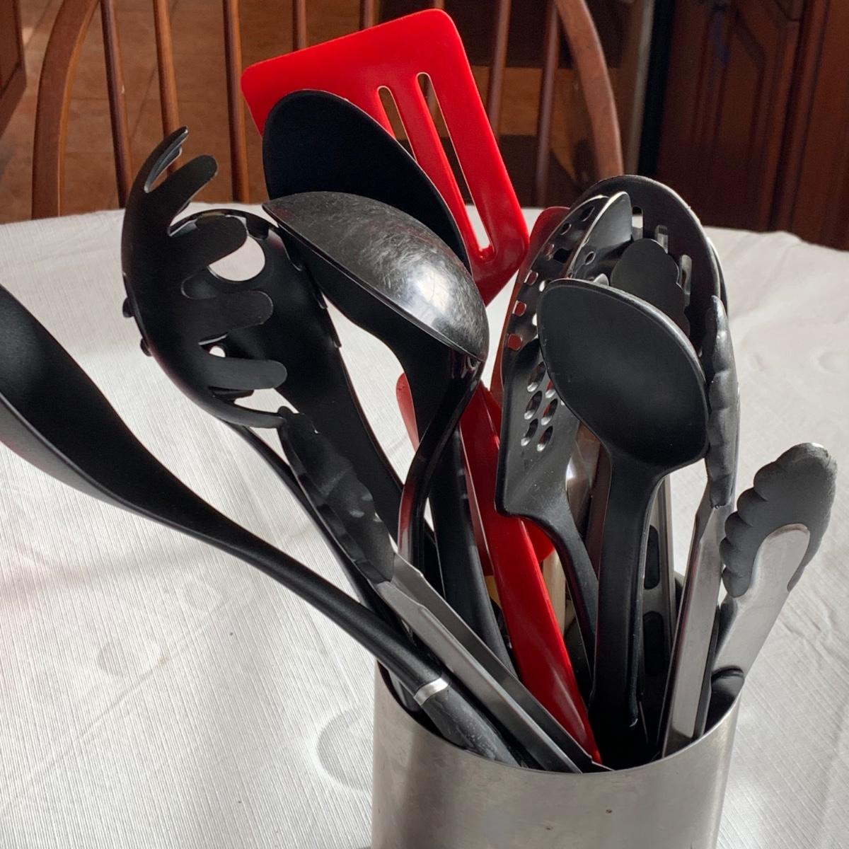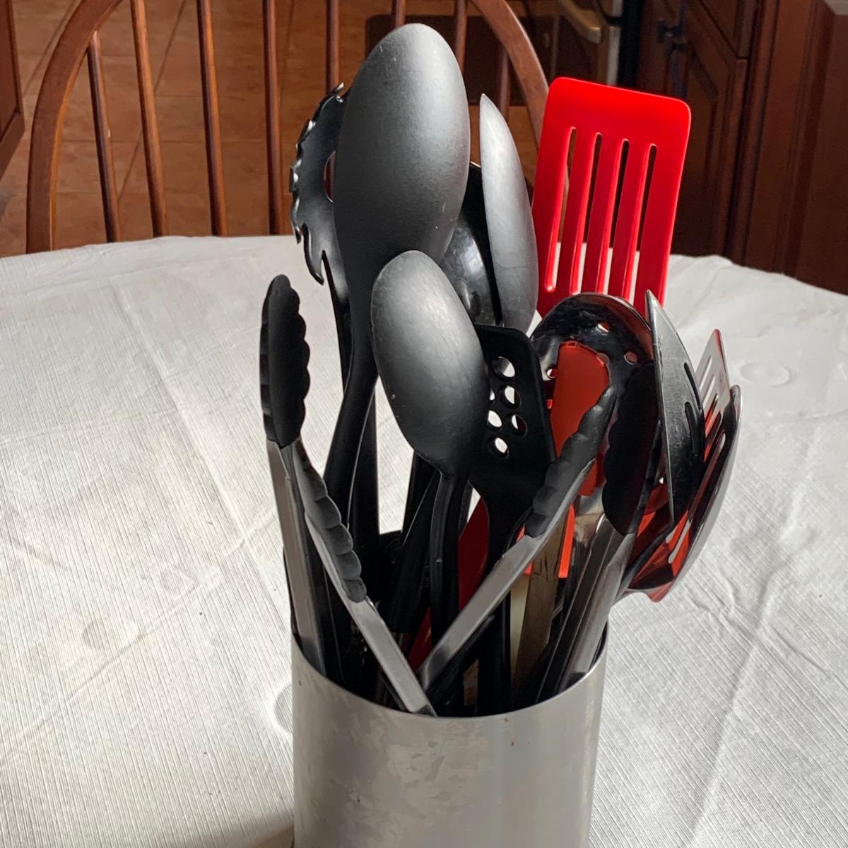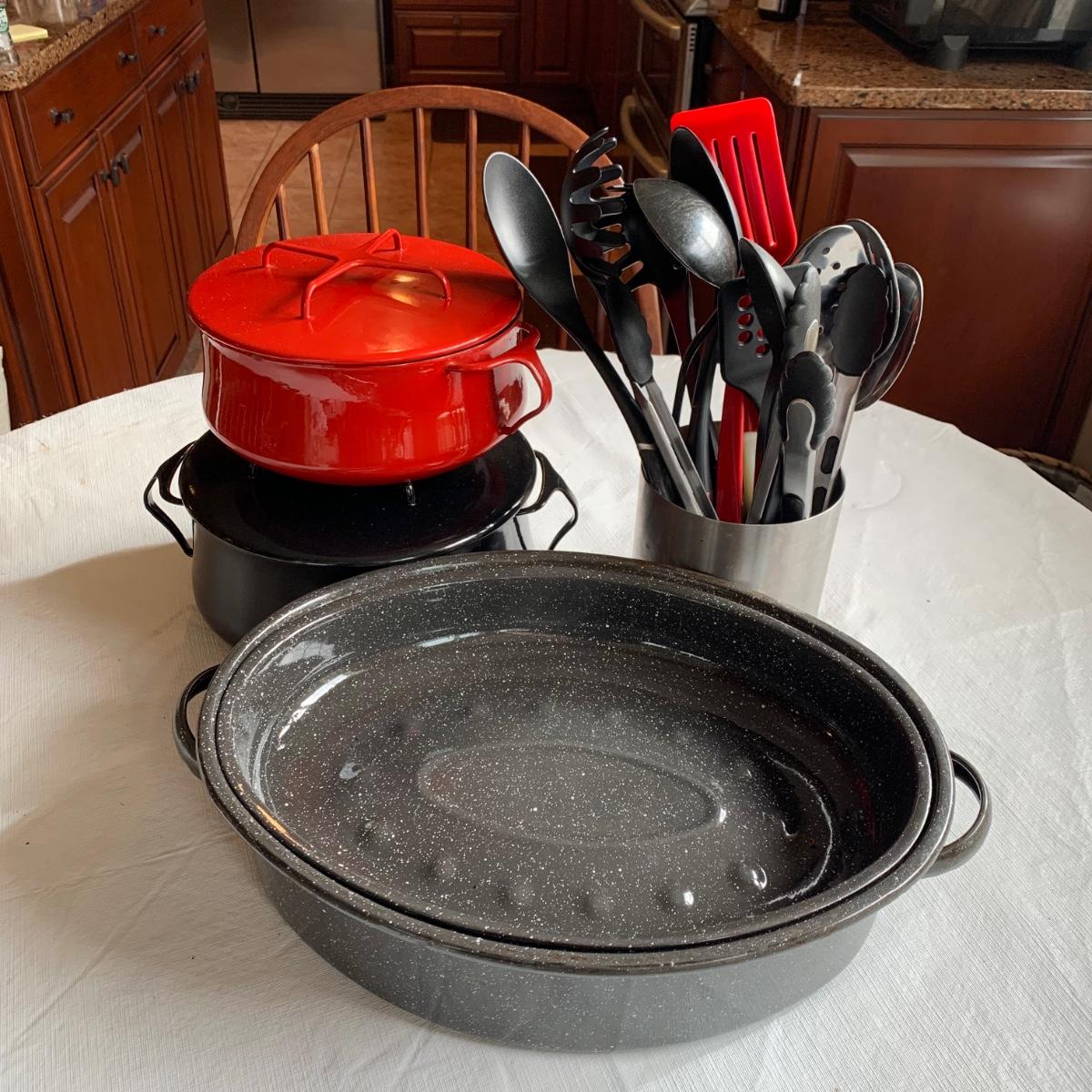 LOT 39R:  Dansk Kobenstyle Chili Red & Midnight Casserole Pots, Roaster, Utensils in Steel Finish Holder