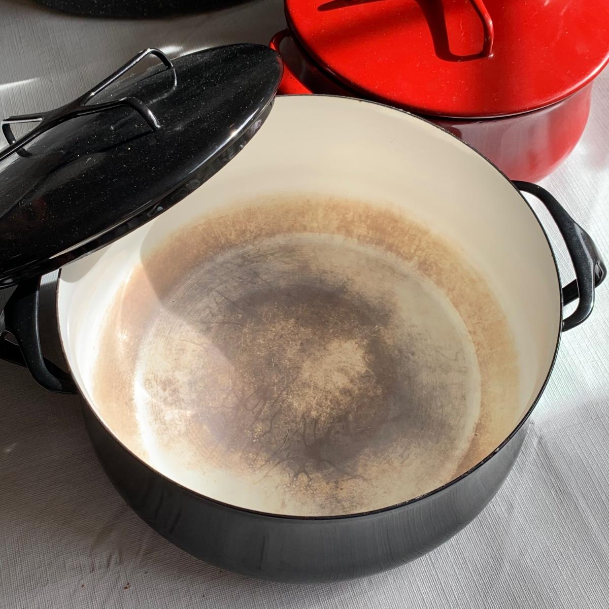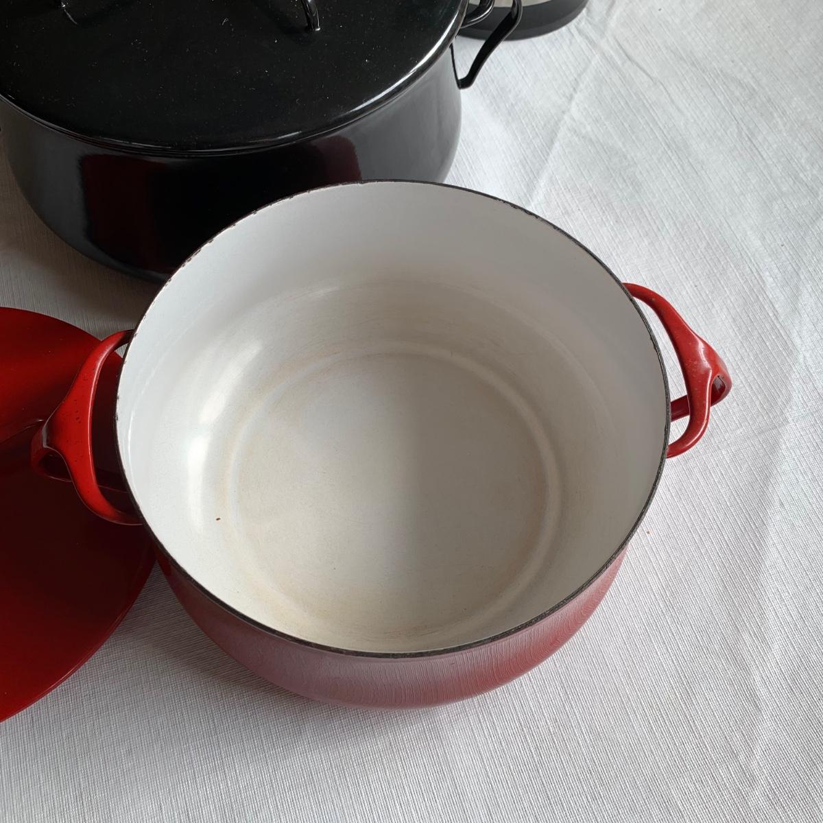 LOT 39R: Dansk Kobenstyle Chili Red & Midnight Casserole Pots, Roaster, Utensils in Steel Finish Holder