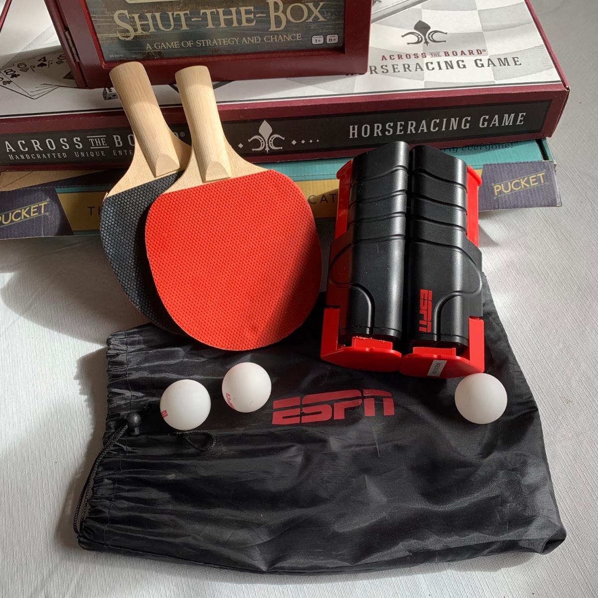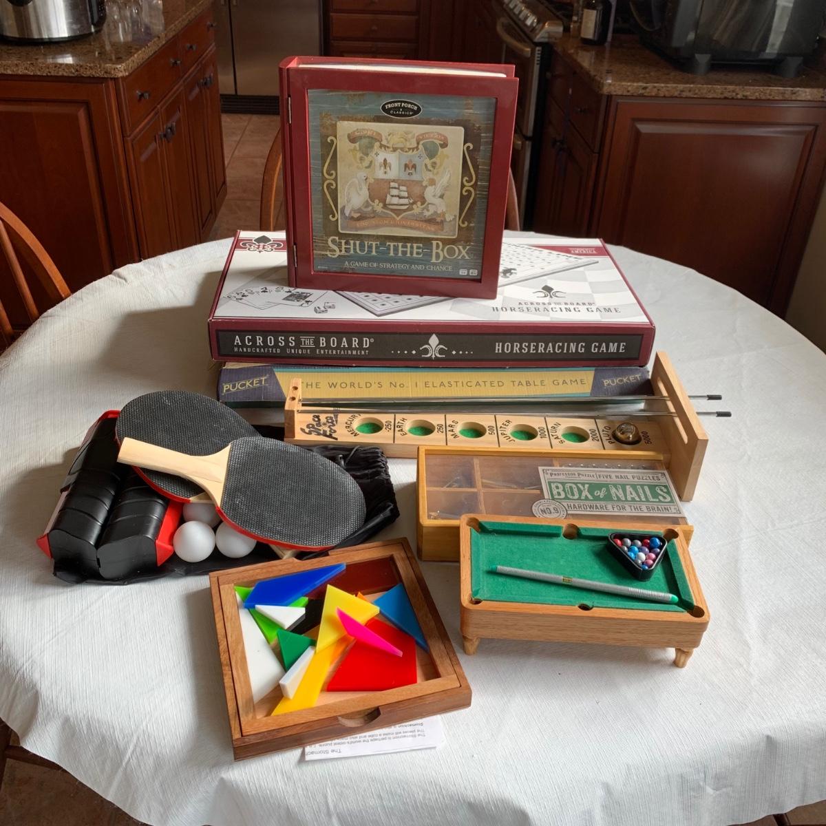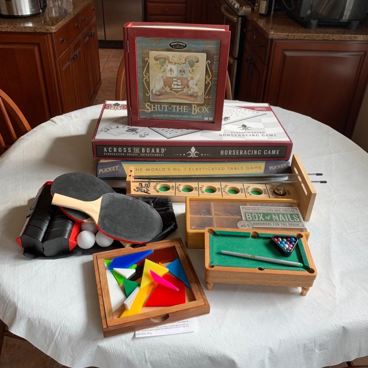 LOT 41R: Games: Shut-The-Box, ESPN Tabletop Ping Pong, Box of Nails, Across the Board, Stomachion Puzzle, Pucket & More