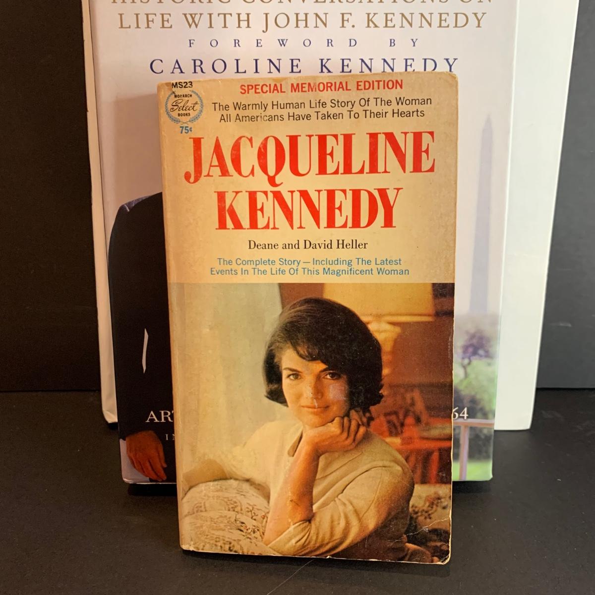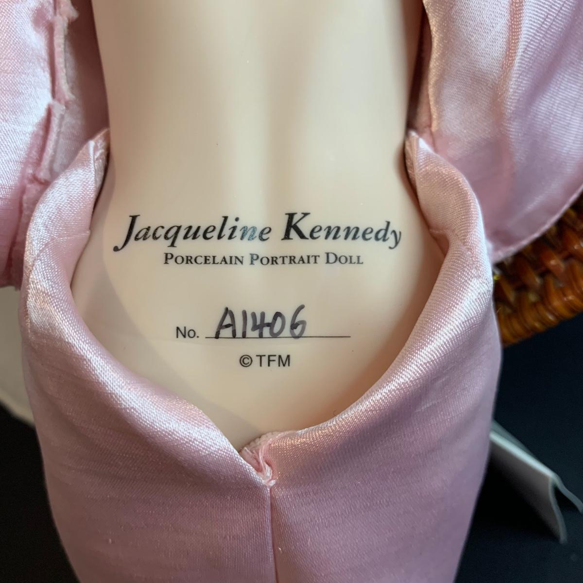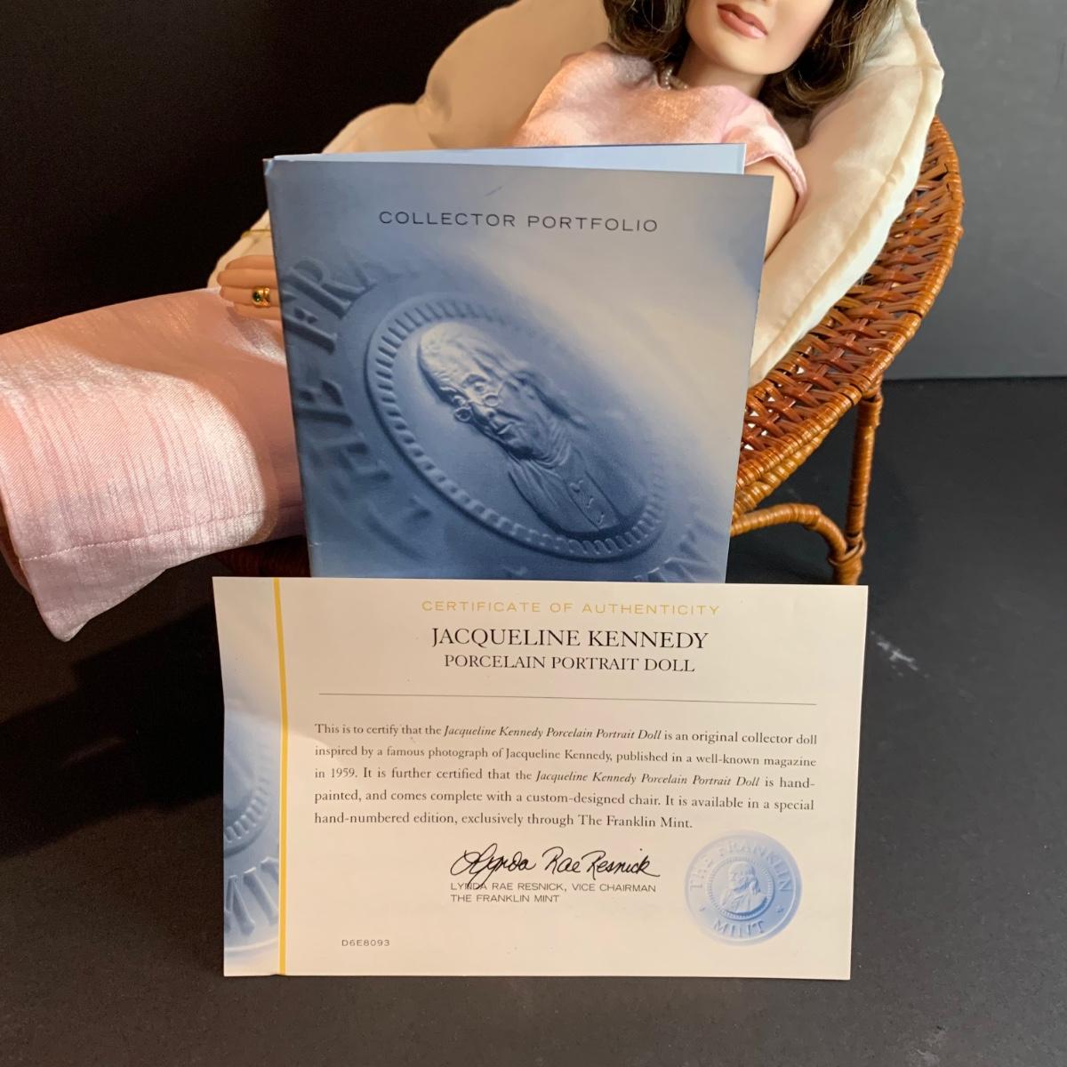 LOT 50R: Franklin Mint Jackie Kennedy Porcelain Doll Sitting in Rattan Chair, Jacqueline Kennedy Books & JFK Book