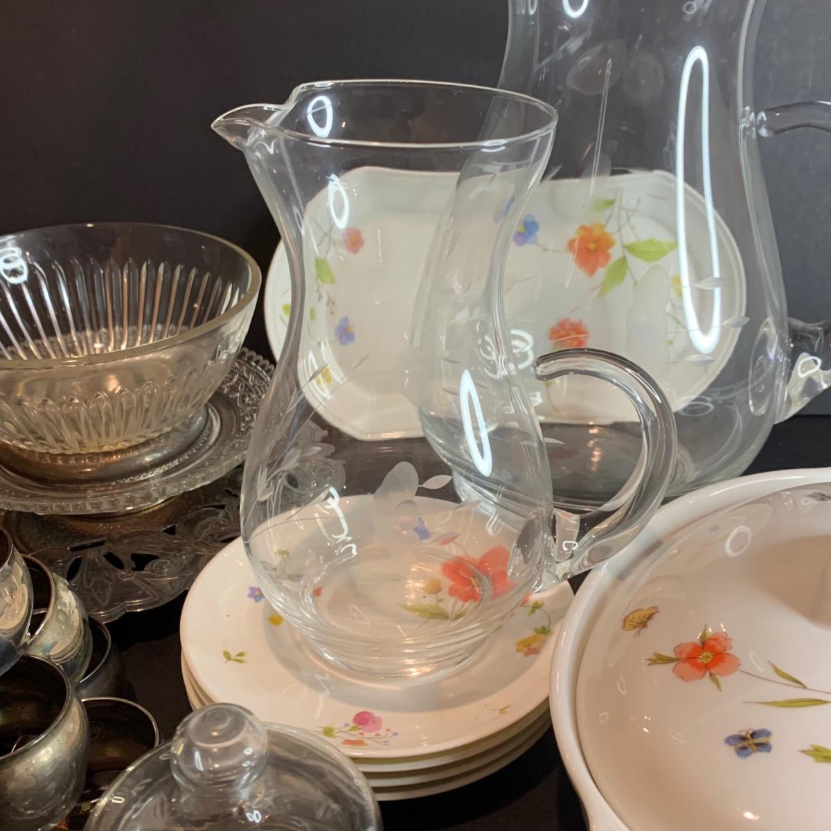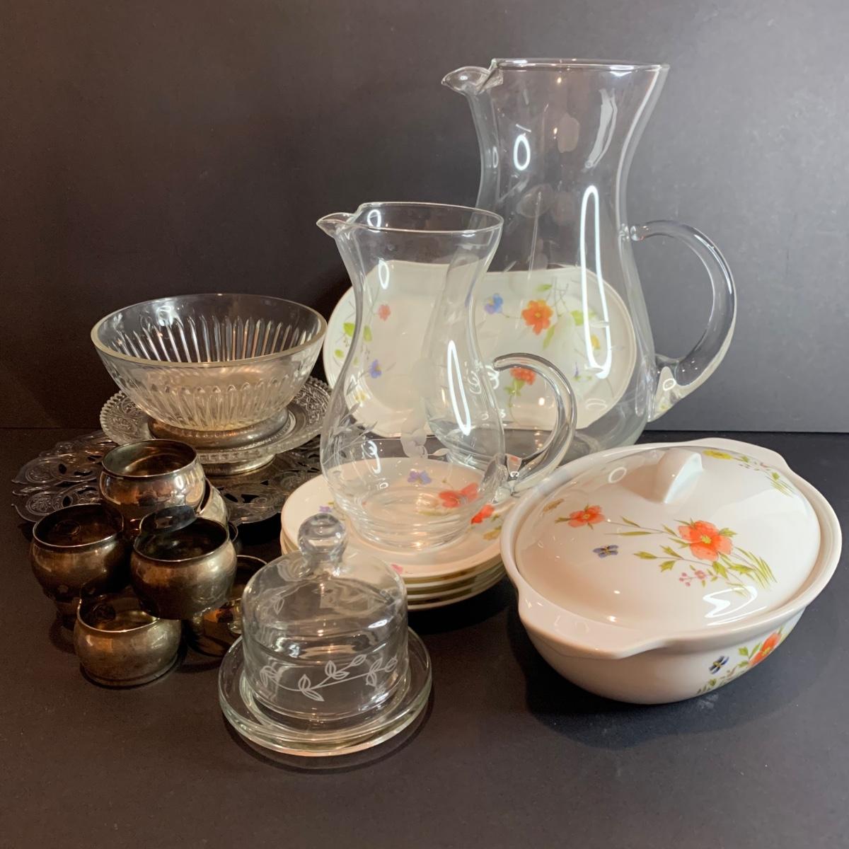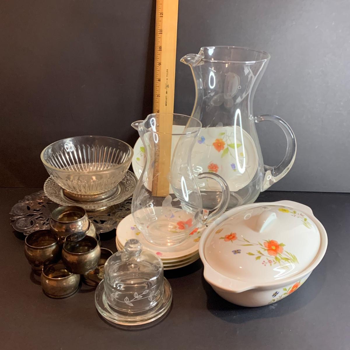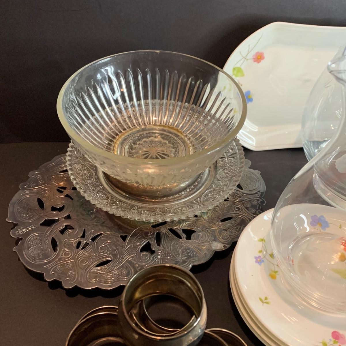 LOT 54R: Princess House Crystal Pitchers, Andrea Cookware, Mikasa, Silvertone Napkin Rings & More