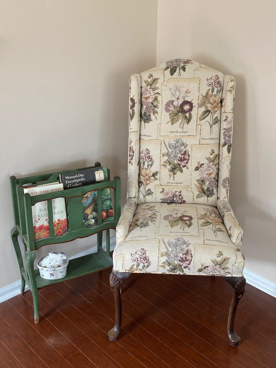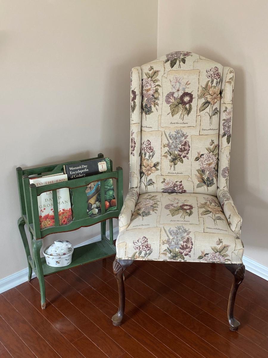 LOT 87C: Floral Print Chair, Magazines Rack and Books