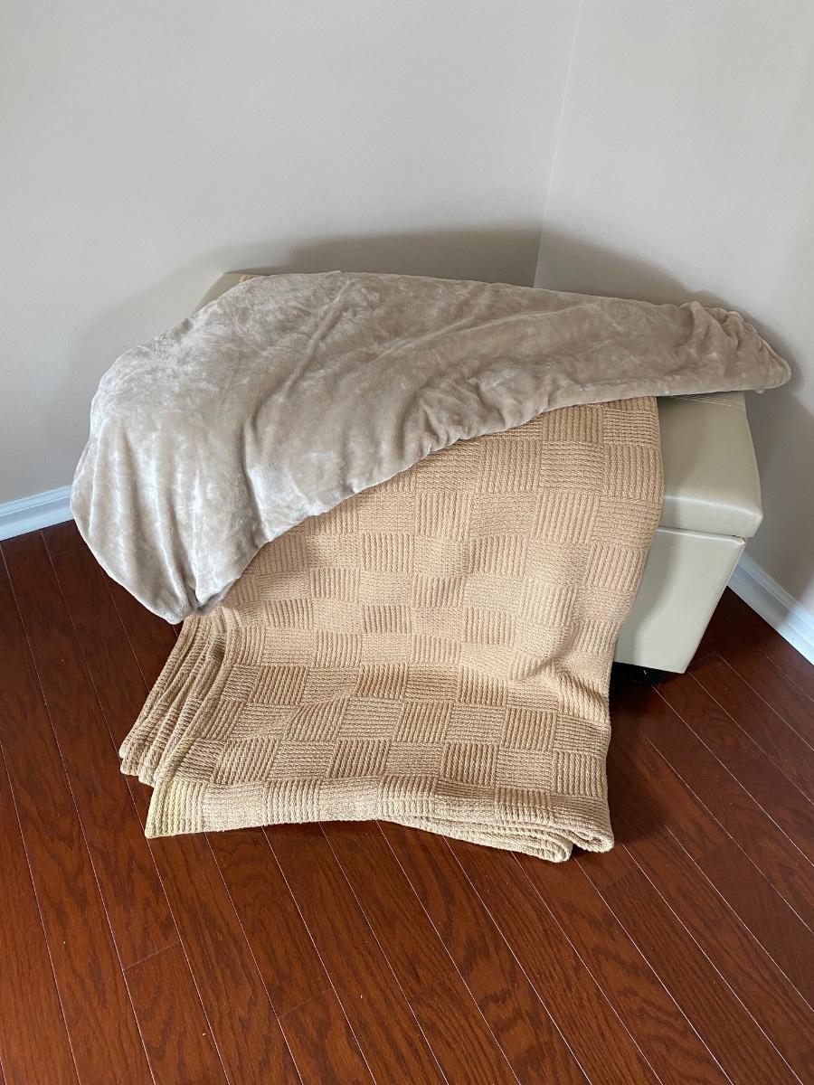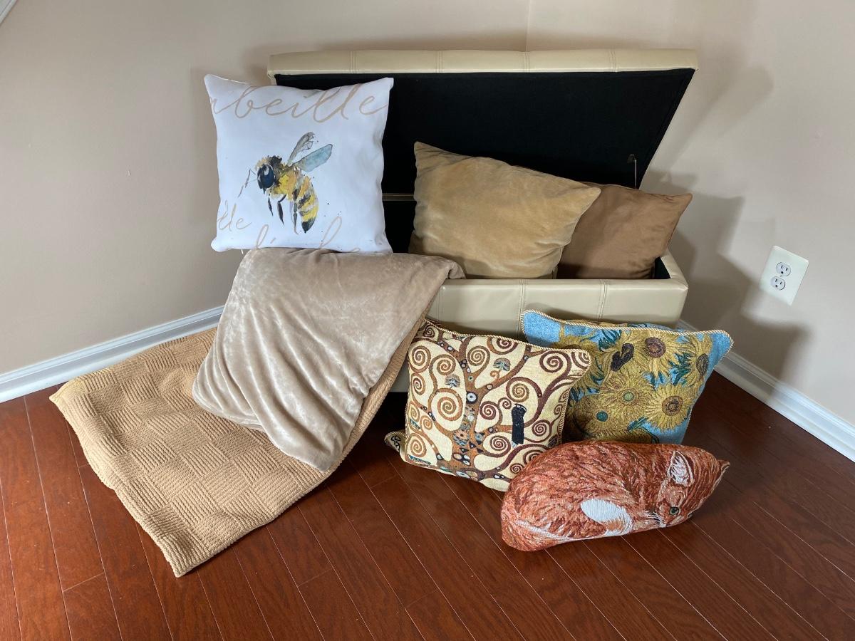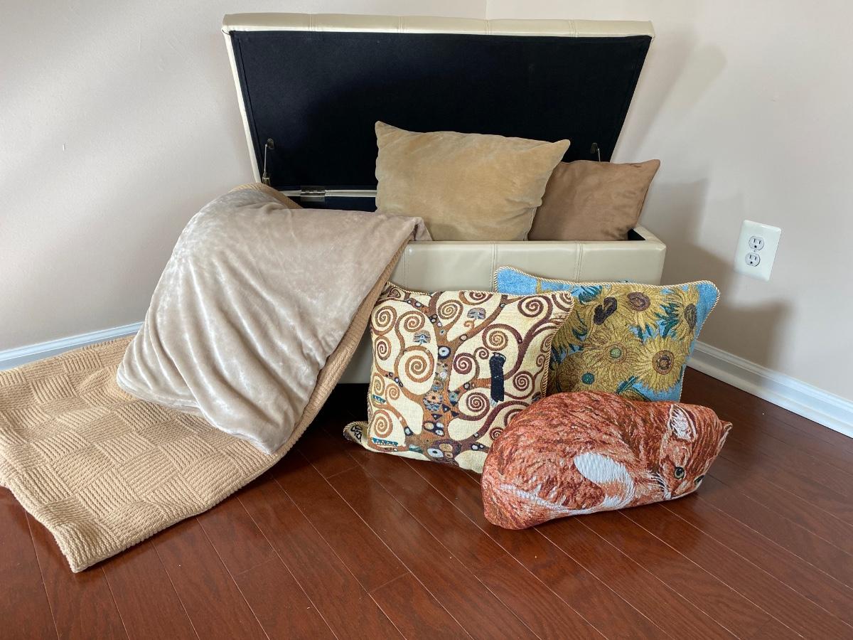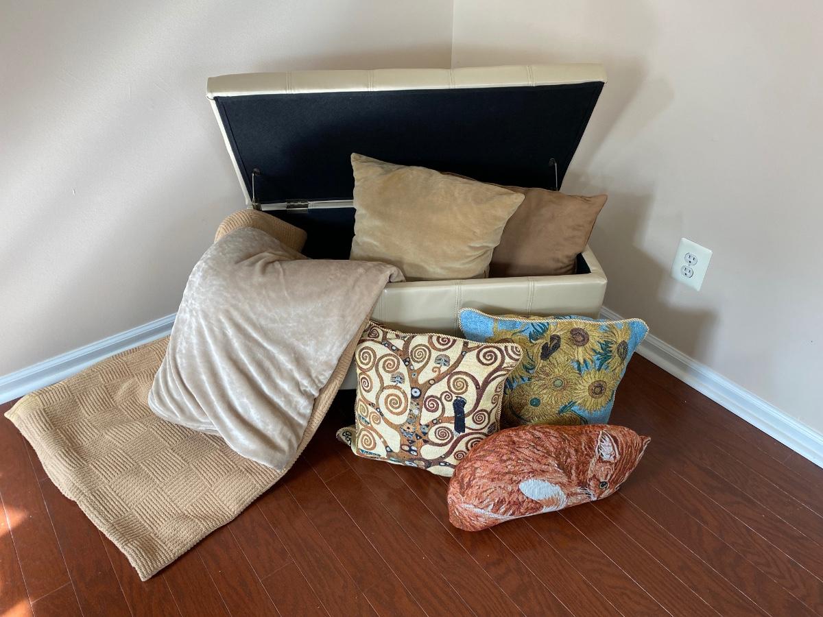 35”x 18”x 18” Ottoman. Accent pillows and throw blankets.