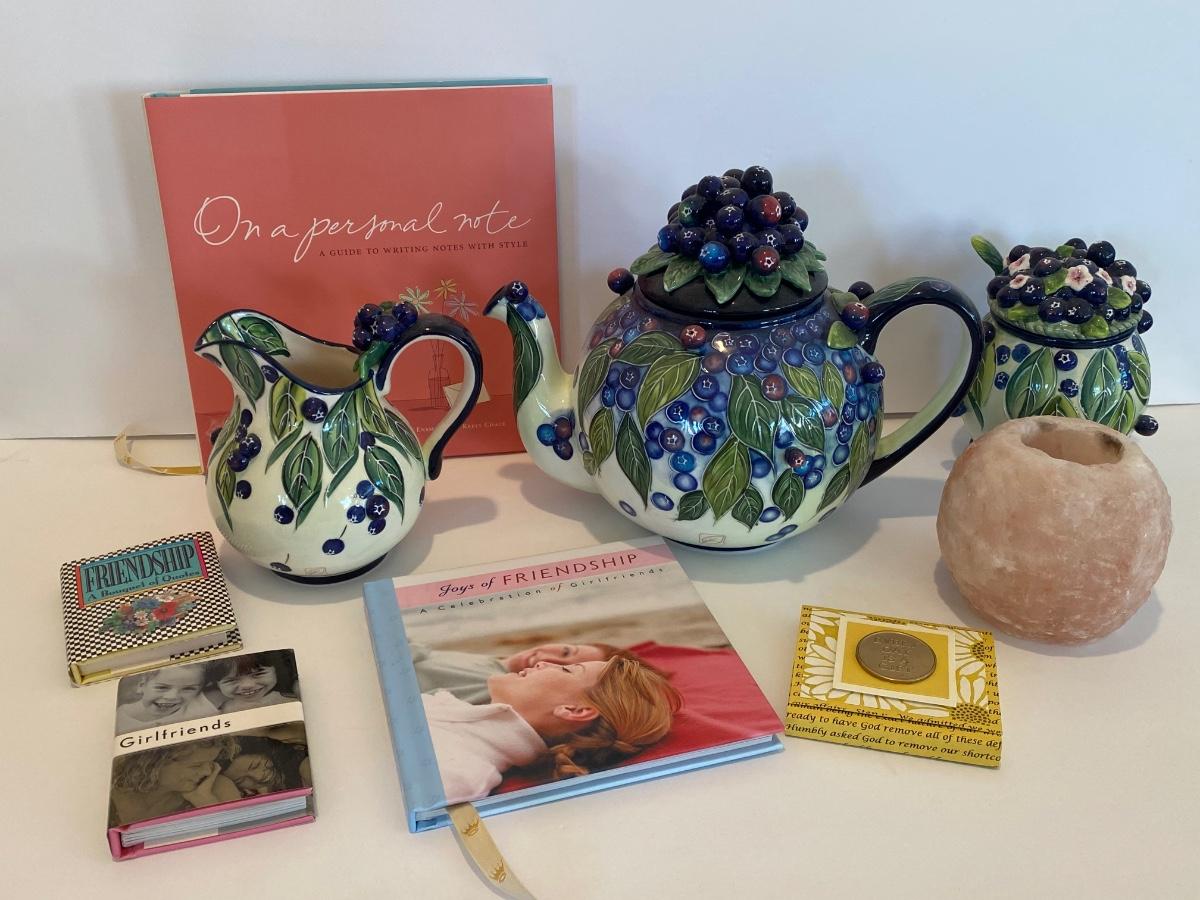 Tea set featuring “Blueberries”. Books on friendship, salt tea light holder and mini notebook. Please see all pictures as they are the best representation of the items. The pictures show condition, measurements if taken, and what is included in the lot. Due to the large amount that we photograph and the time frame, we are not always able to take measurements. All items unless noted, are pre-owned and have been used. If you purchased furniture, you must bring help. We do not allow one person to carry large furniture out on their own. Bring help, tools and a truck for the safety of our client’s homes, and your personal safety. Any damages that result to the property including walls, and floors due to moving of the furniture will be charged to the buyer. Company policy. Thank you.