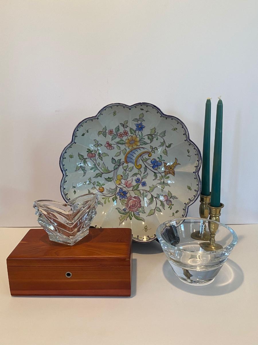 Decorative bowl is made is Portugal. Trinket box is made by Lane.