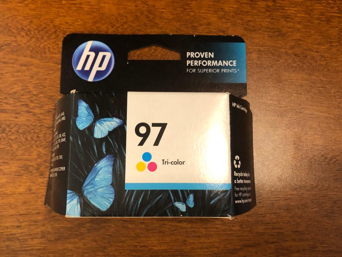Printer powers on and includes some paper, user manual, and an unopened color ink pack.