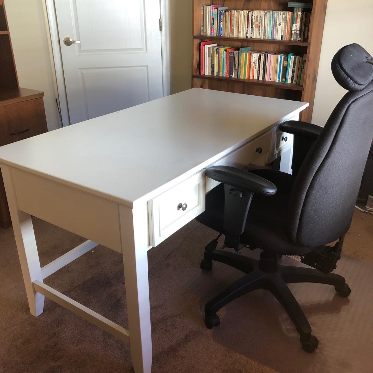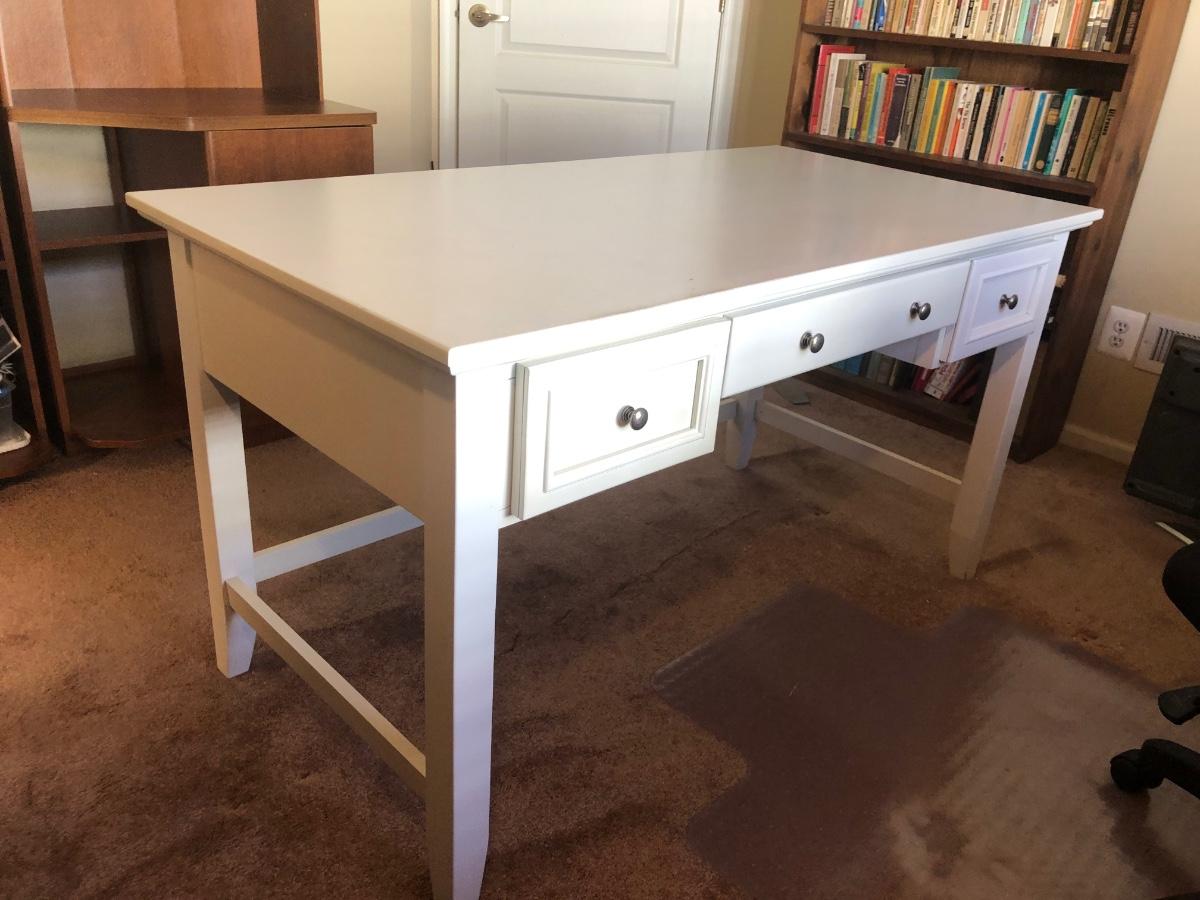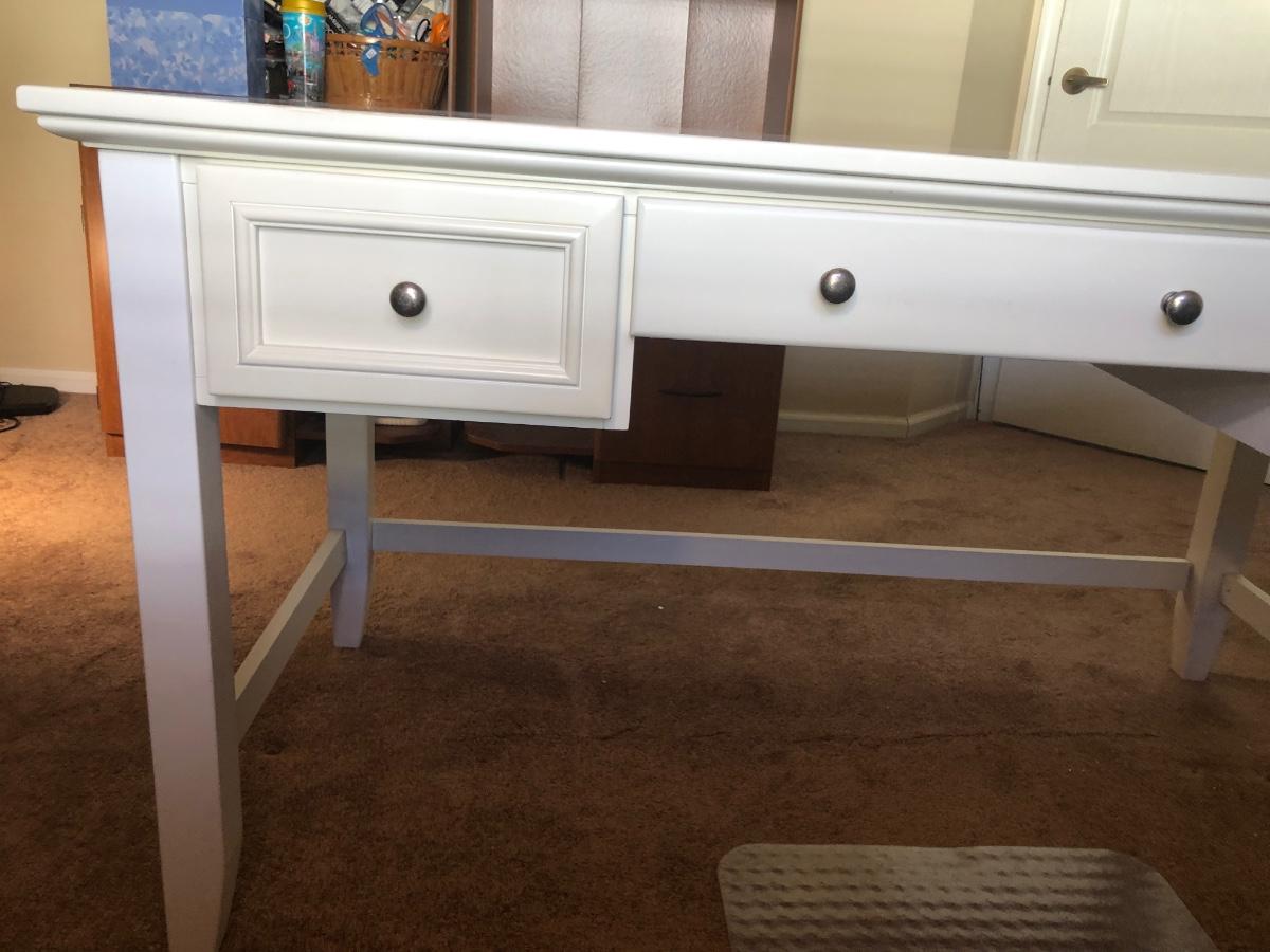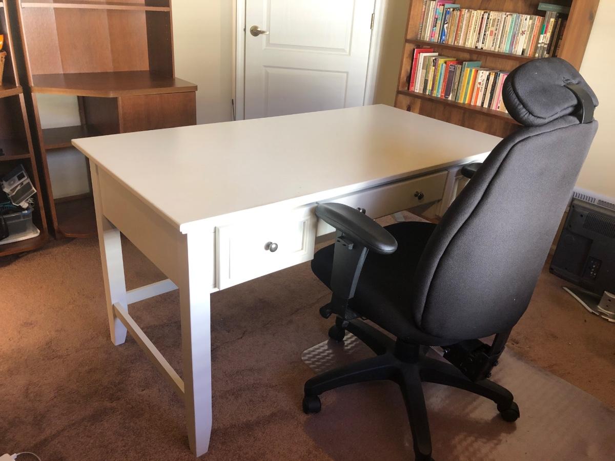 Includes drawers full of office supplies. Desk measures 54W x 28D x 29H and chair measures 29W x 20D x 44H,