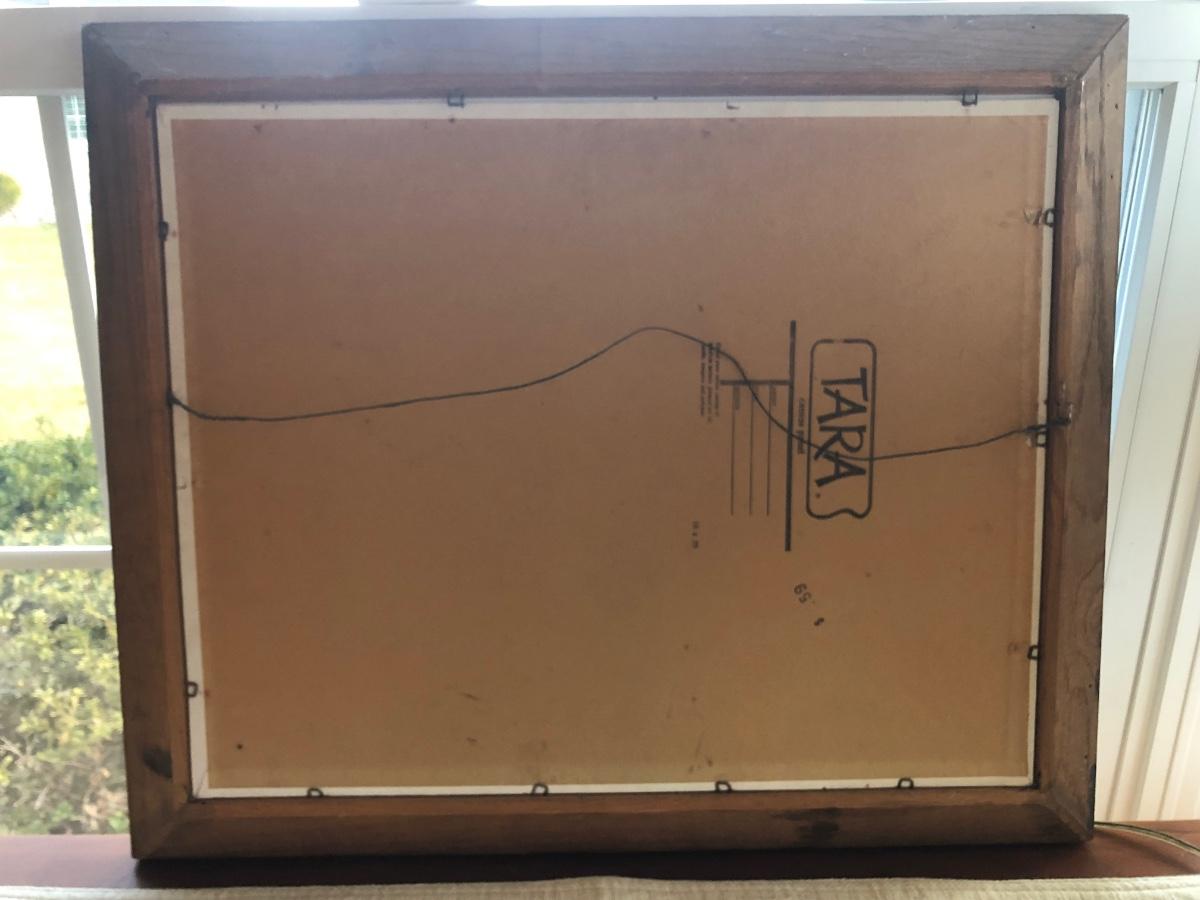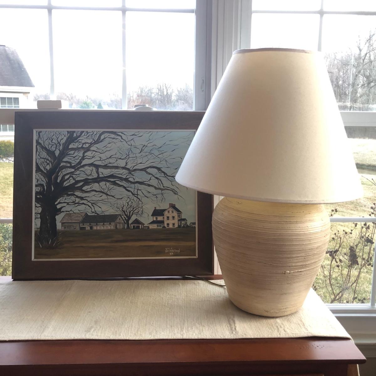 Lamp measures 25 inches tall with the shade. Print measures 24 x 20 inches.