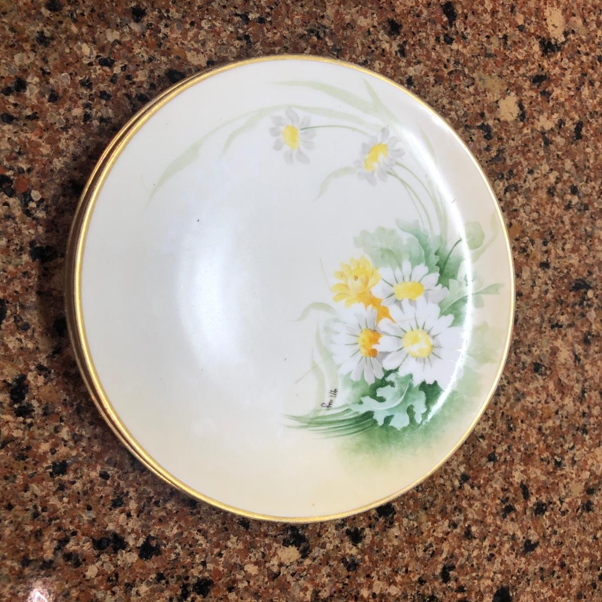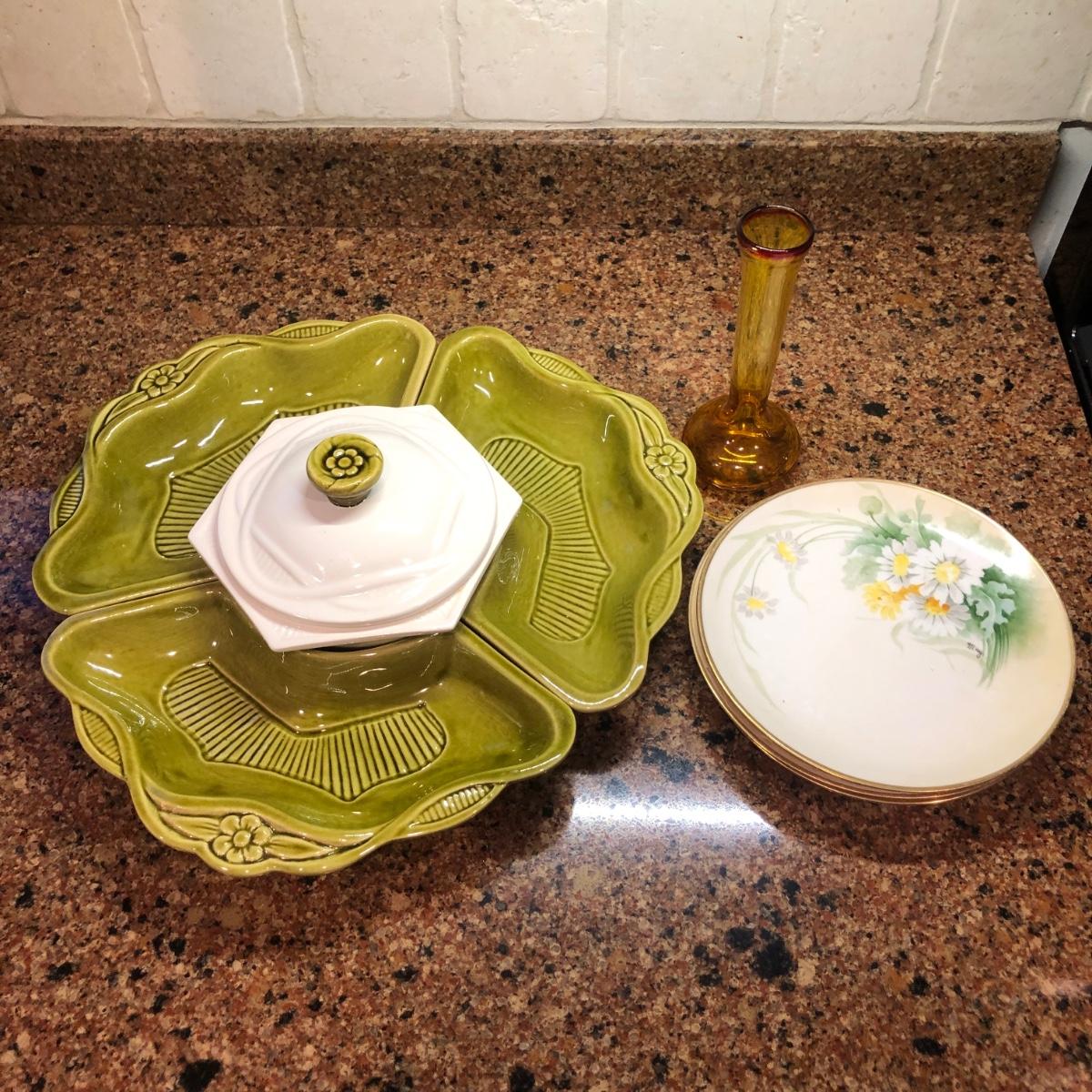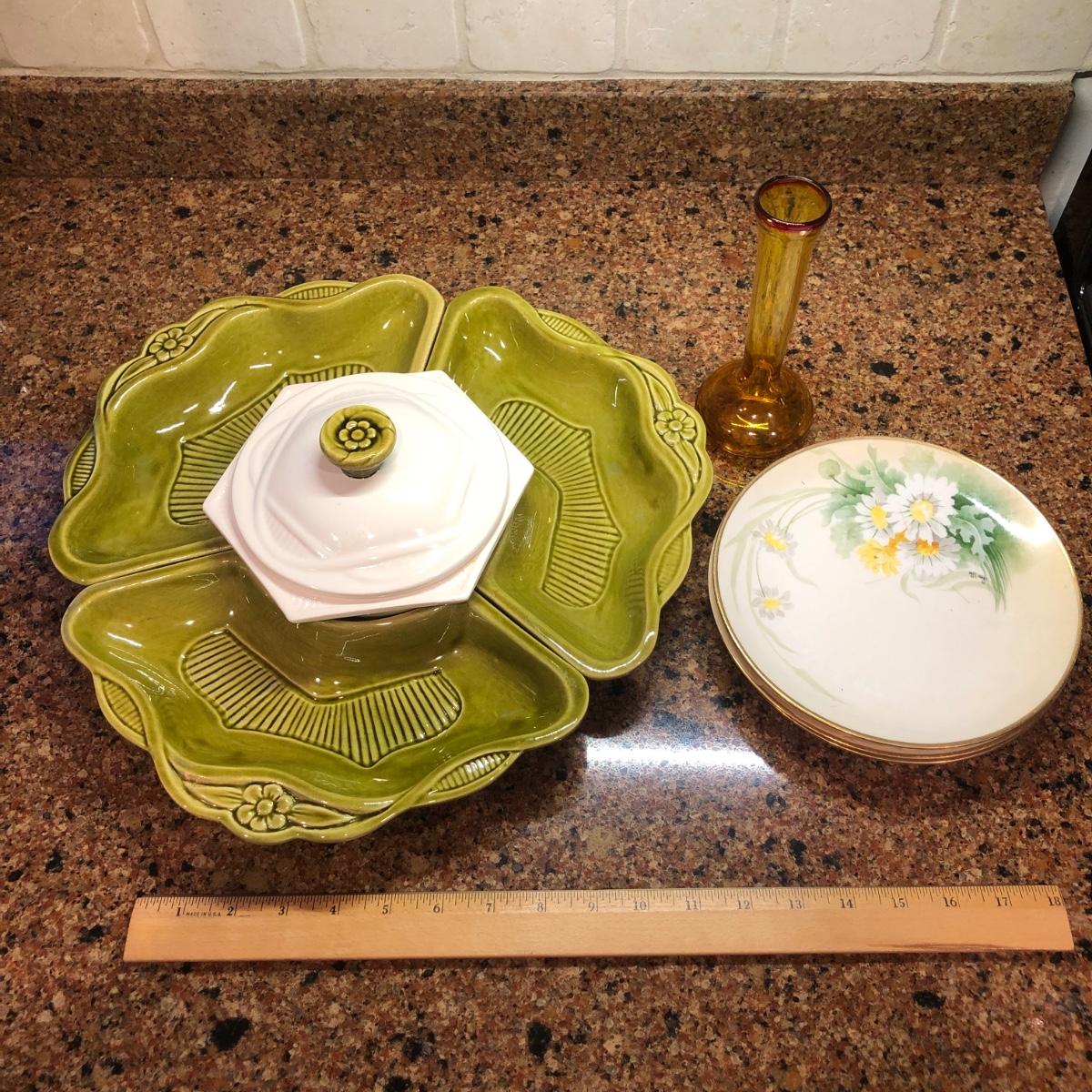 Includes a serving set of four dishes, a set of hand painted Limoges plates made in France, and a small brown glass vase.