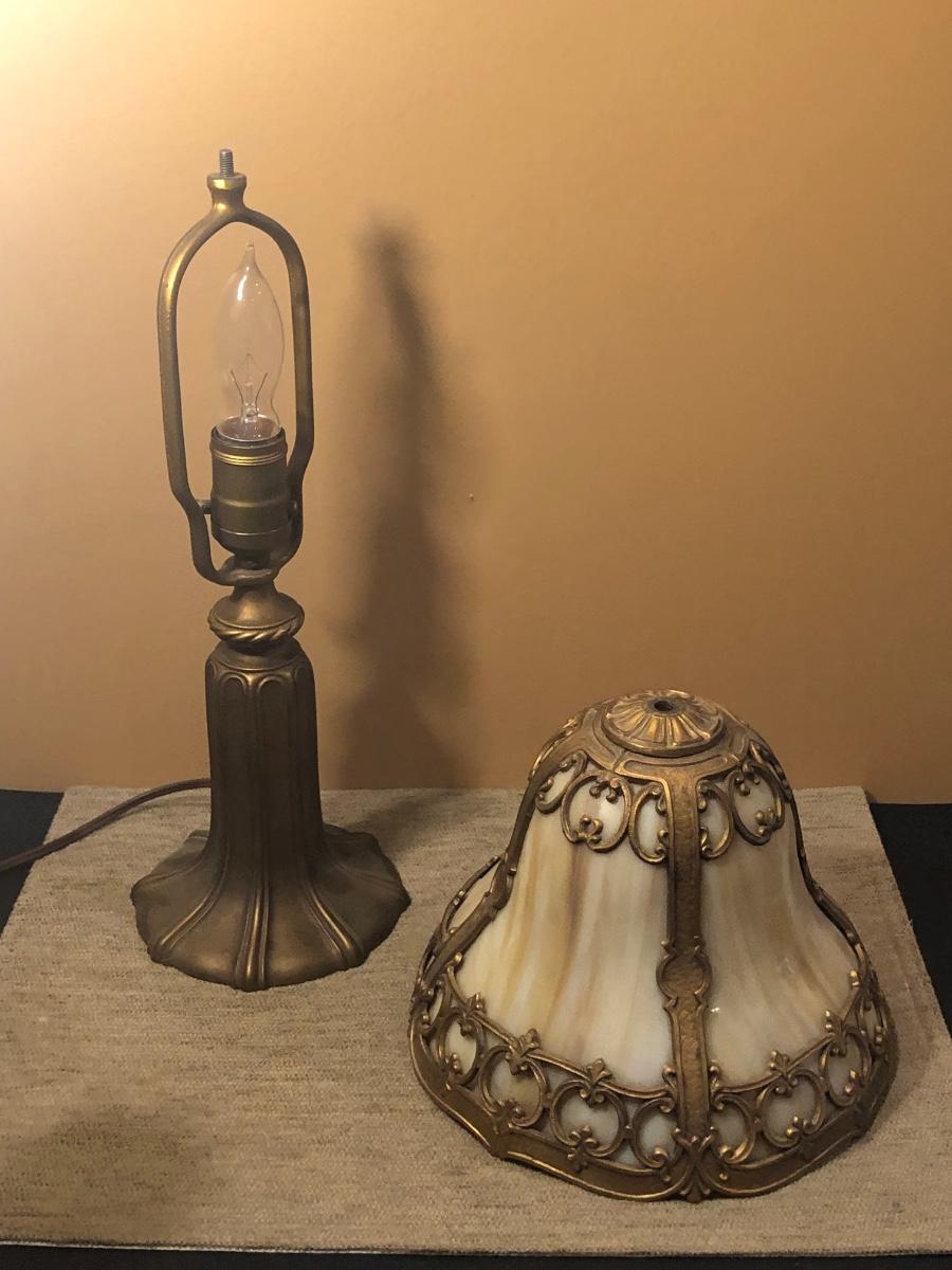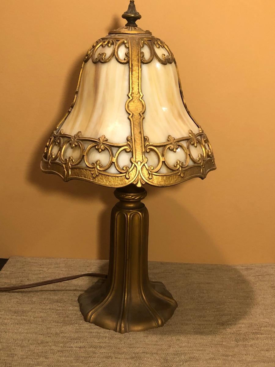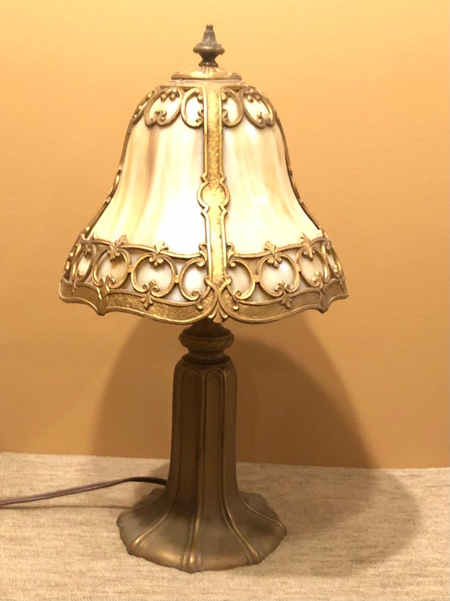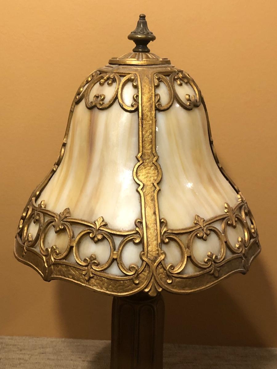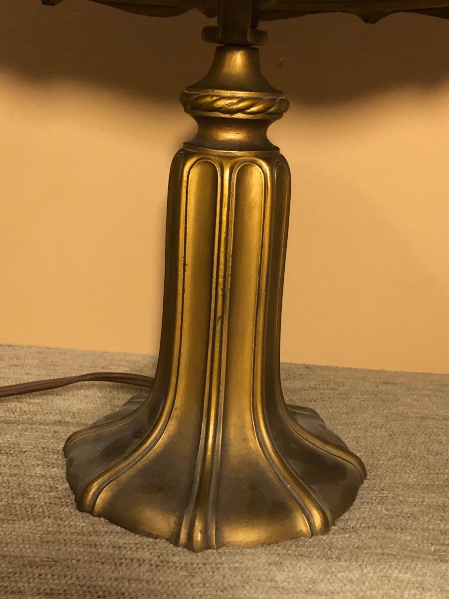 LOT134M: Antique Brass Lamp w/ Stained Glass Shade