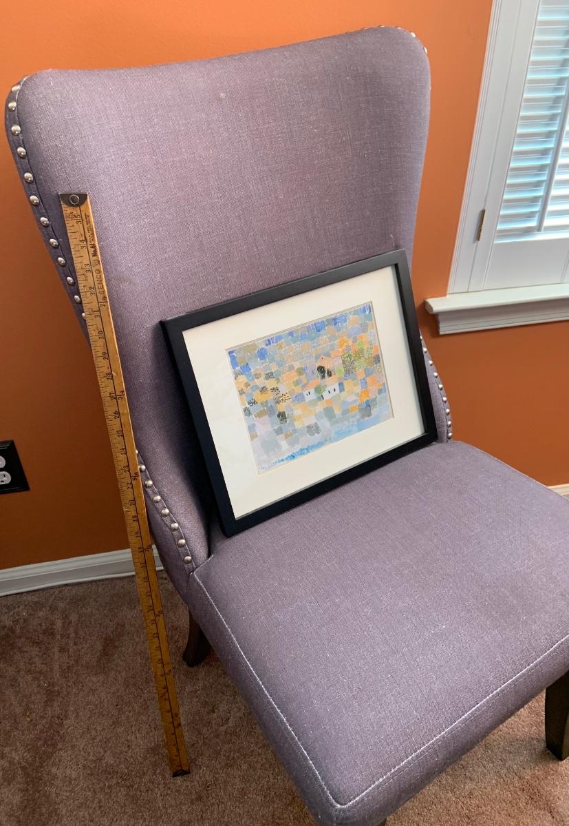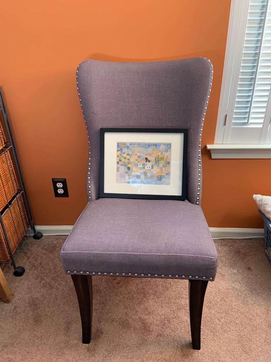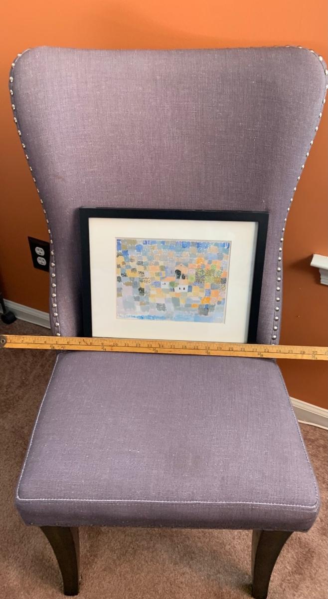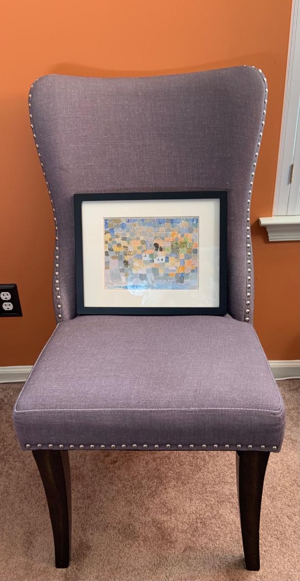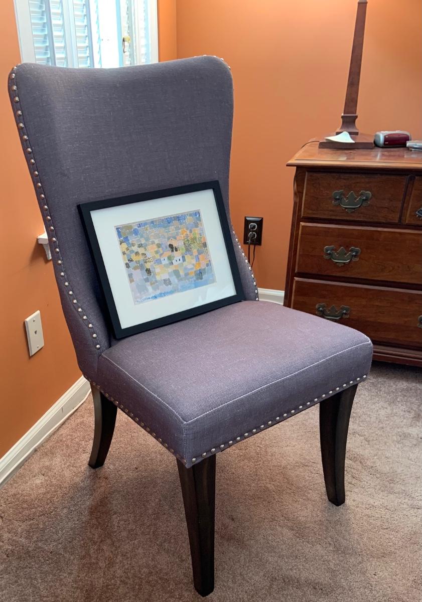 LOT:142: Gray Upholstered Chair w/metal studs & Framed & Signed Print