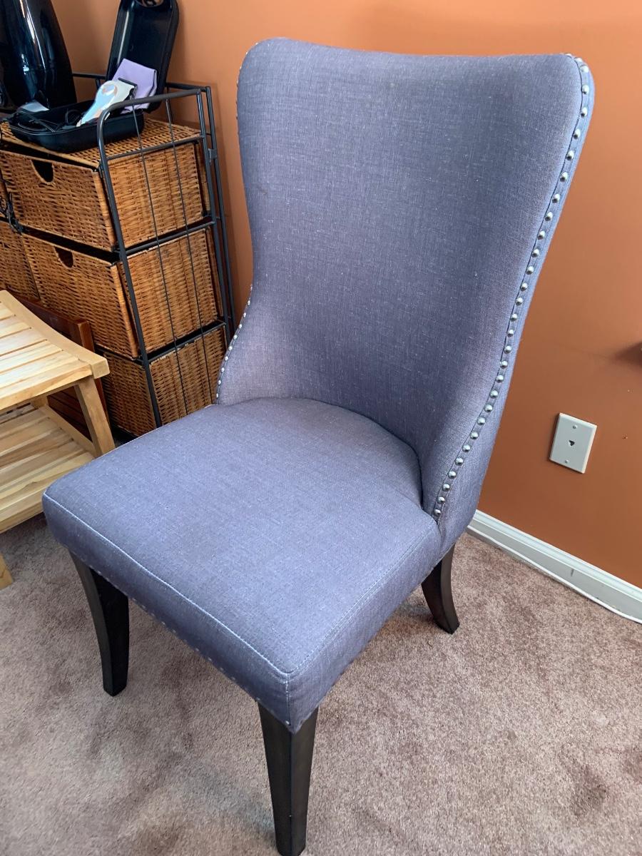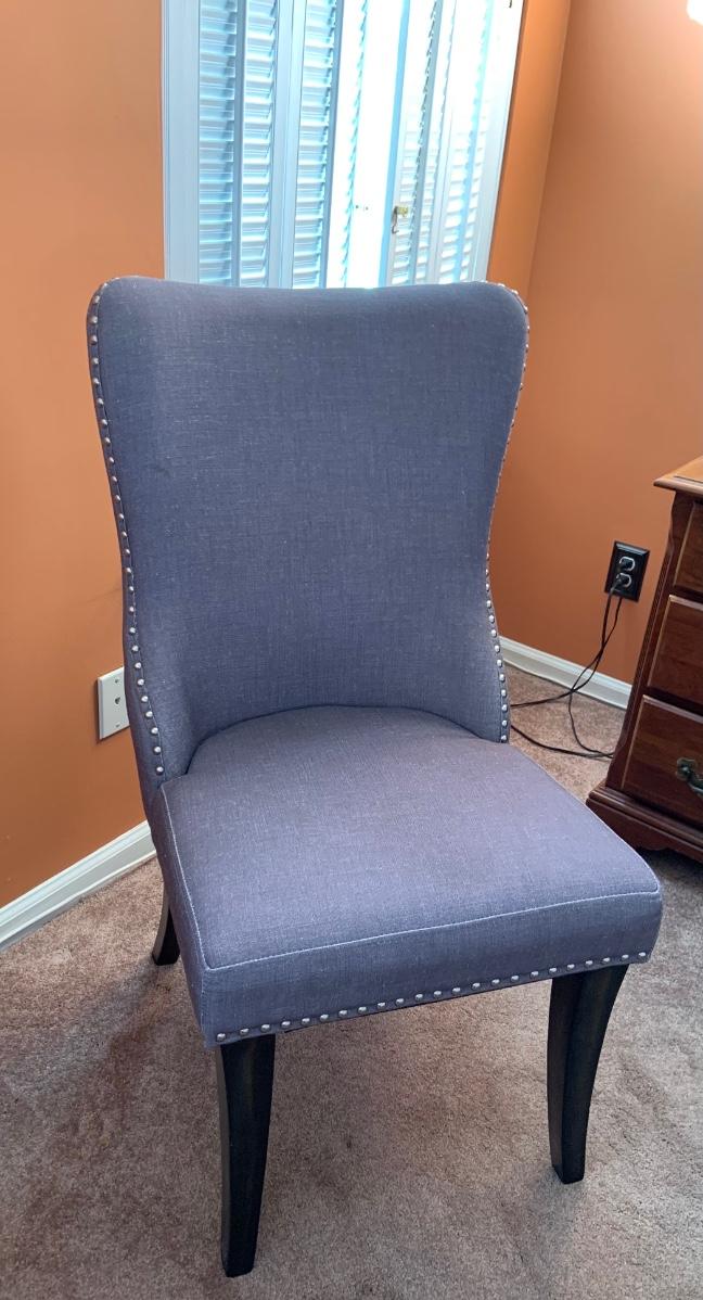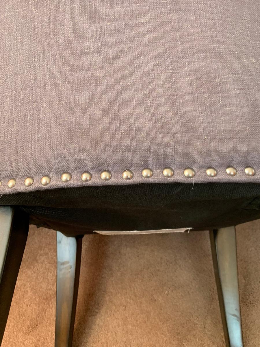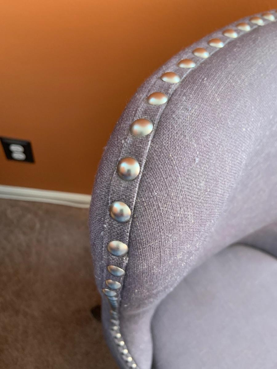 LOT:142: Gray Upholstered Chair w/metal studs & Framed & Signed Print