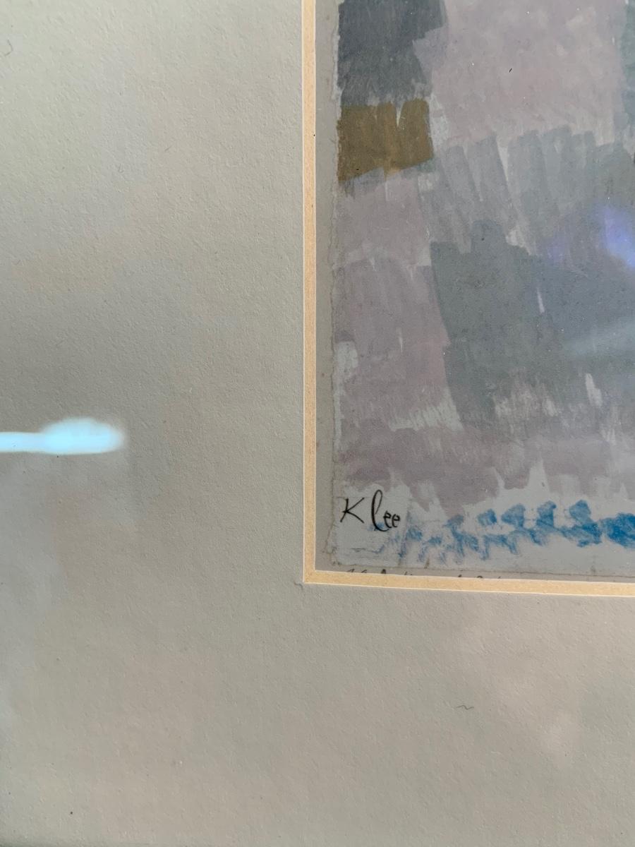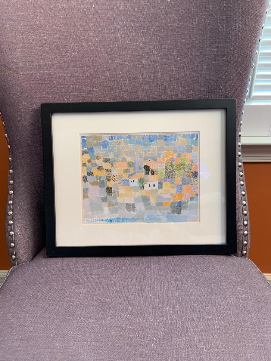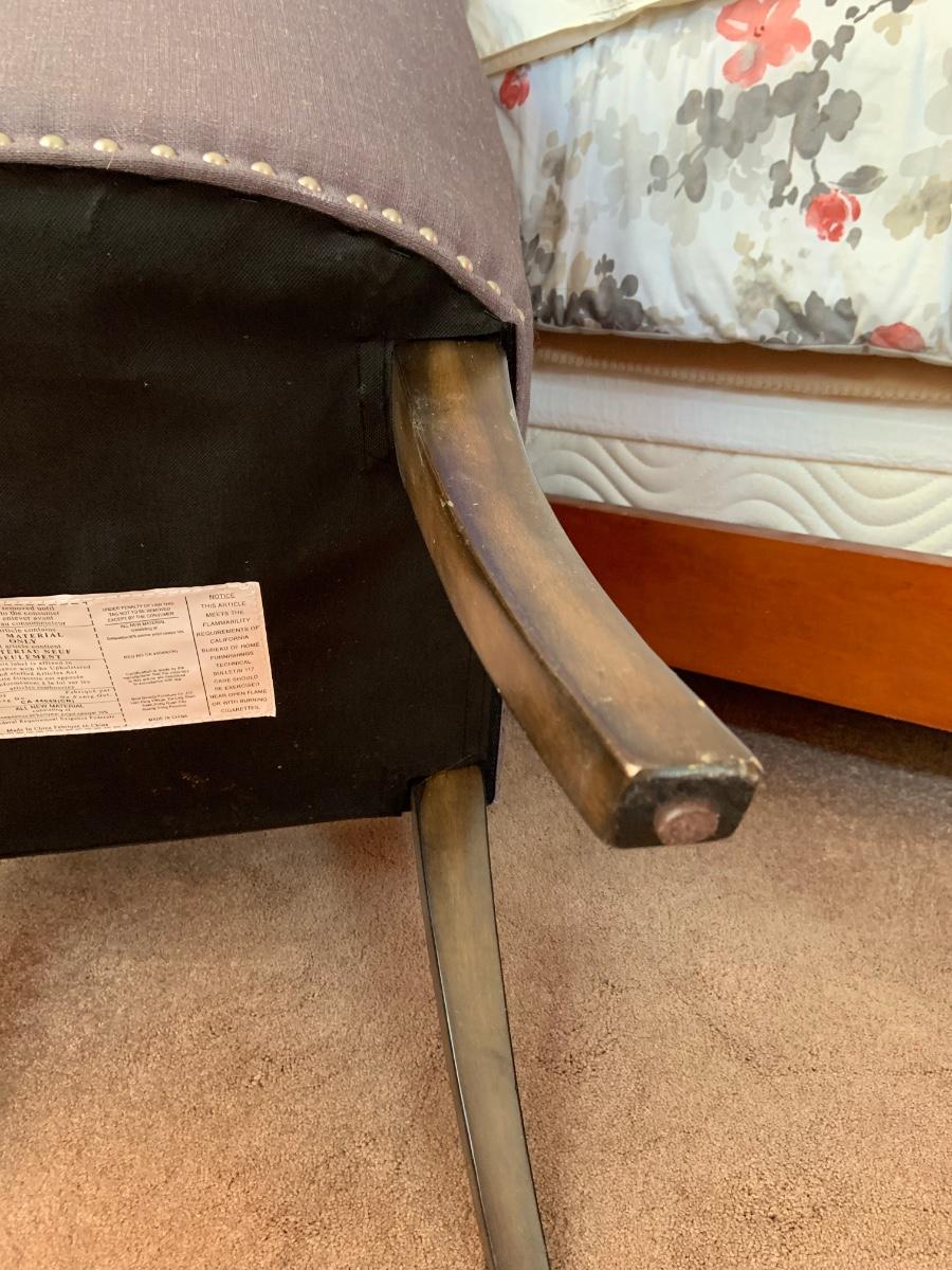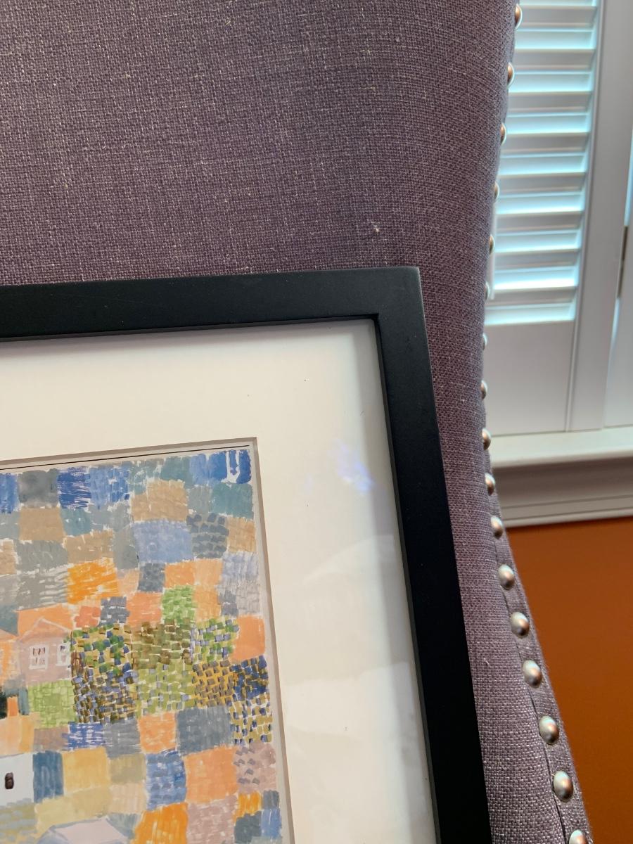 LOT:142: Gray Upholstered Chair w/metal studs & Framed & Signed Print