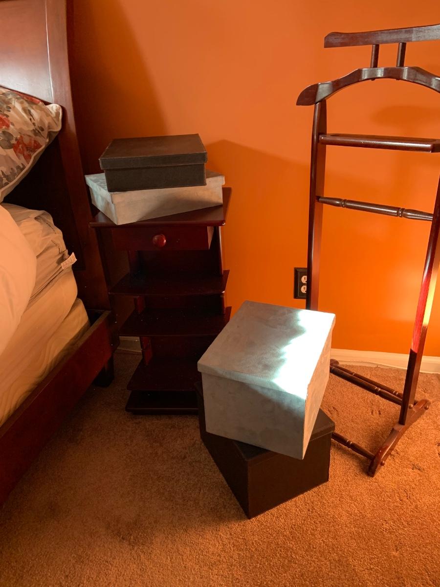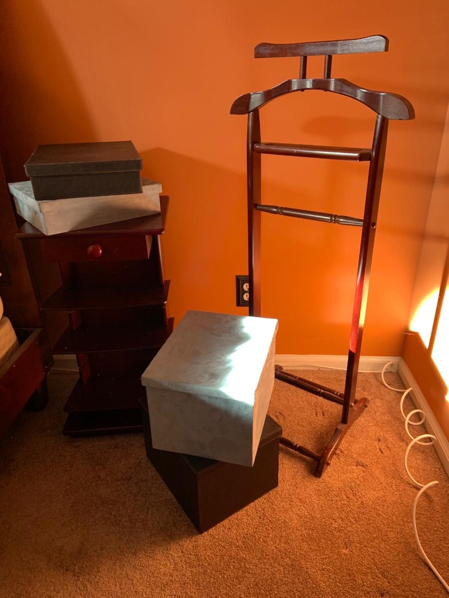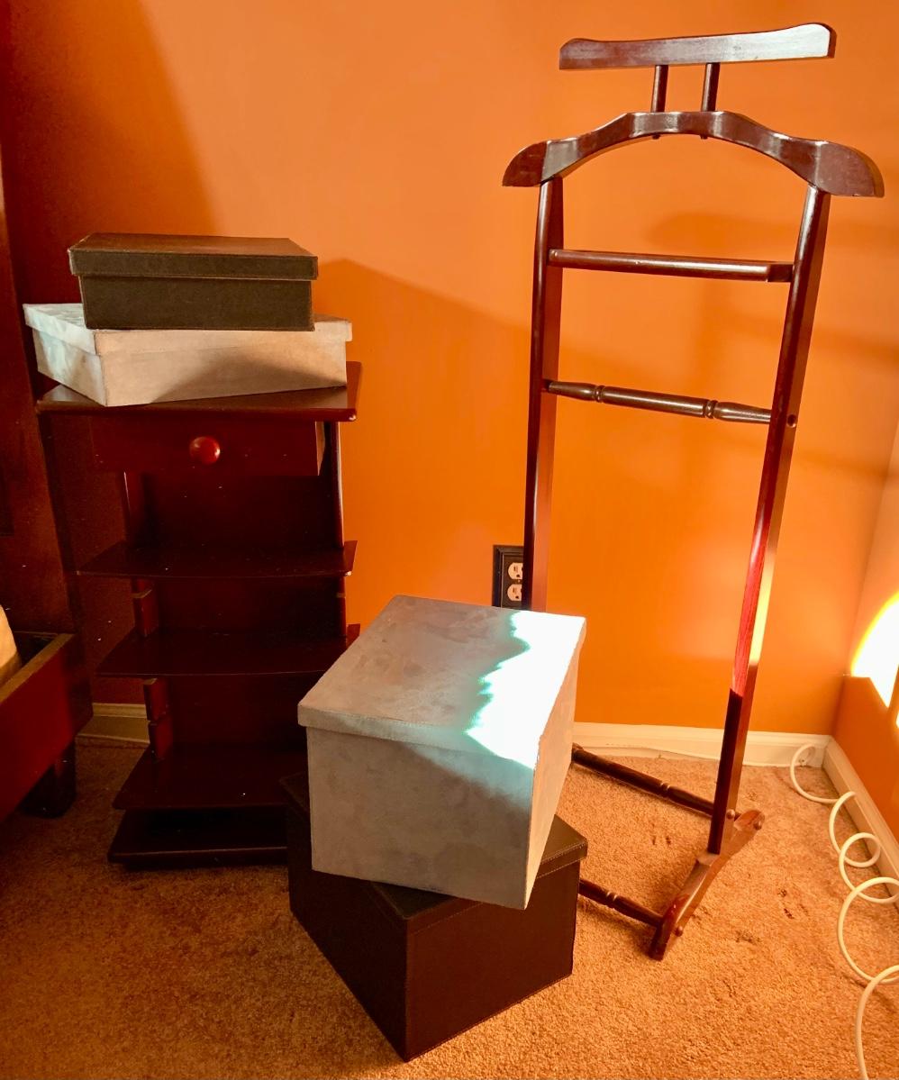 LOT:143: Wooden Magazine Rack, Wooden Valet Stand & Faux Leather/Suede Storage Boxes