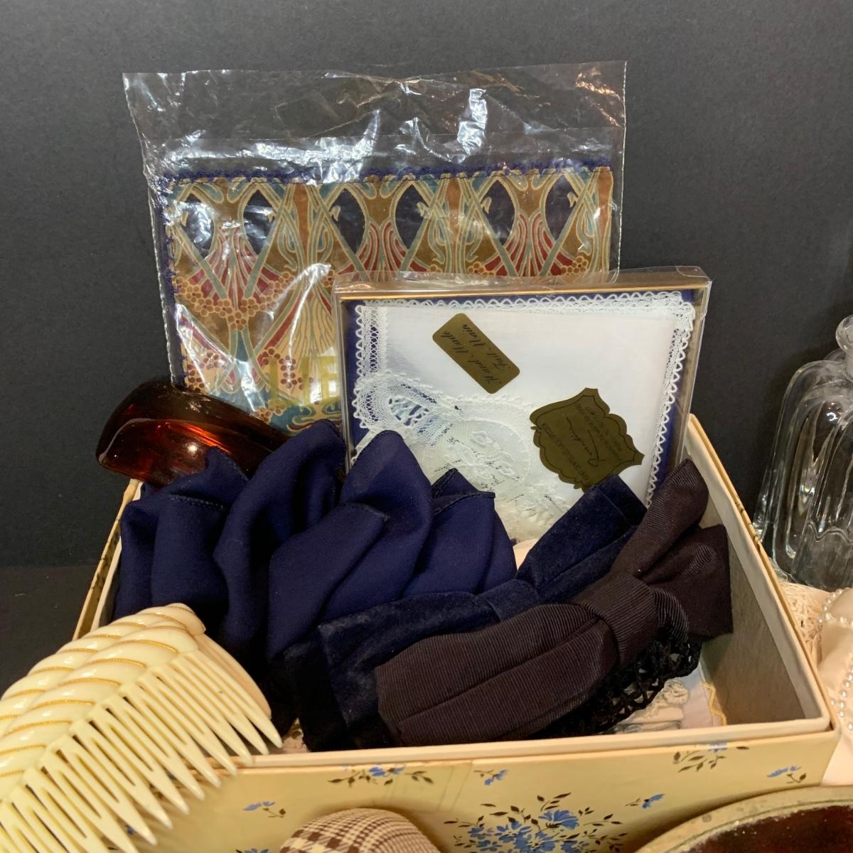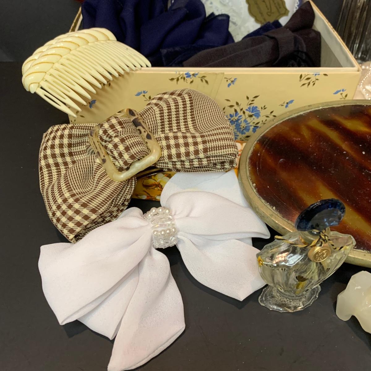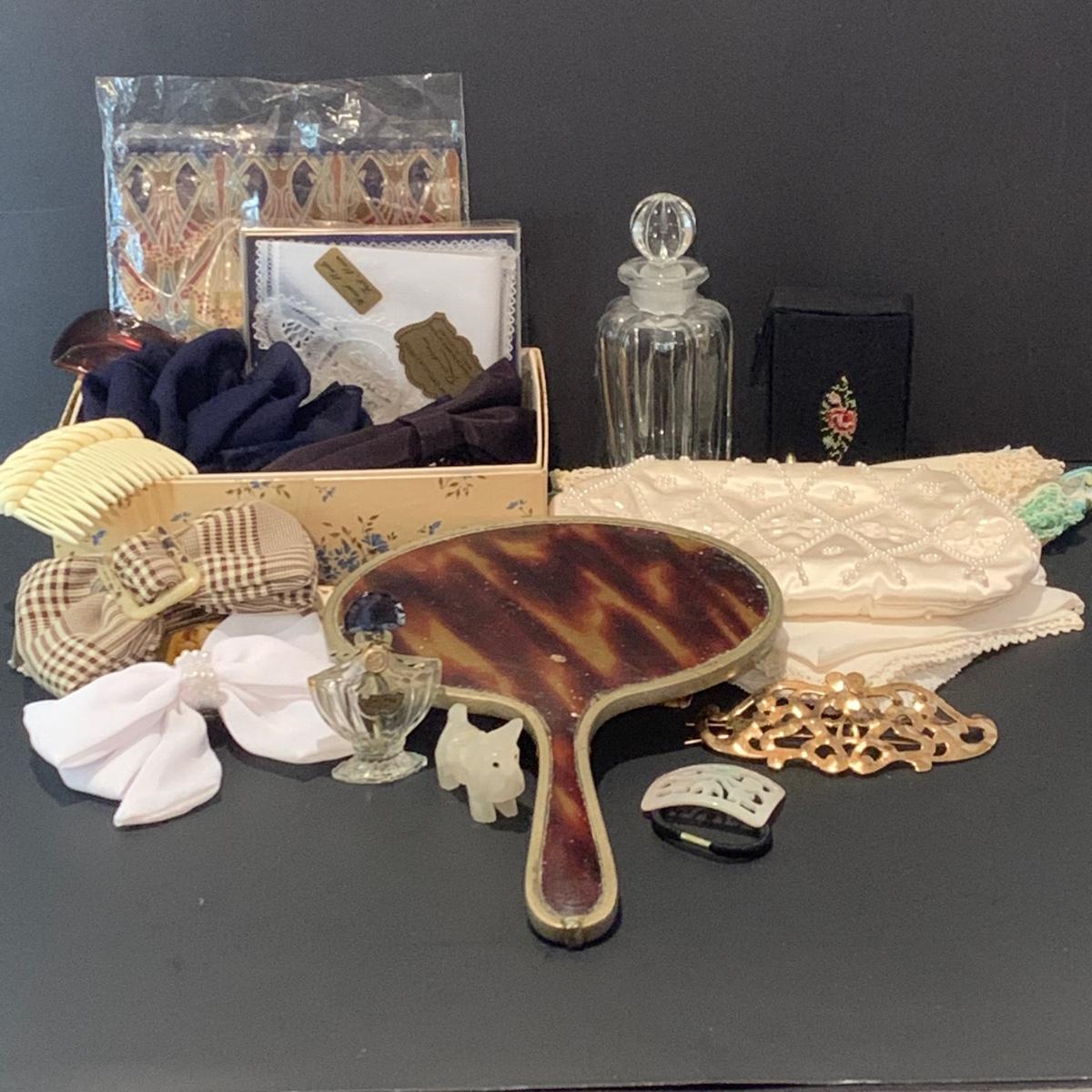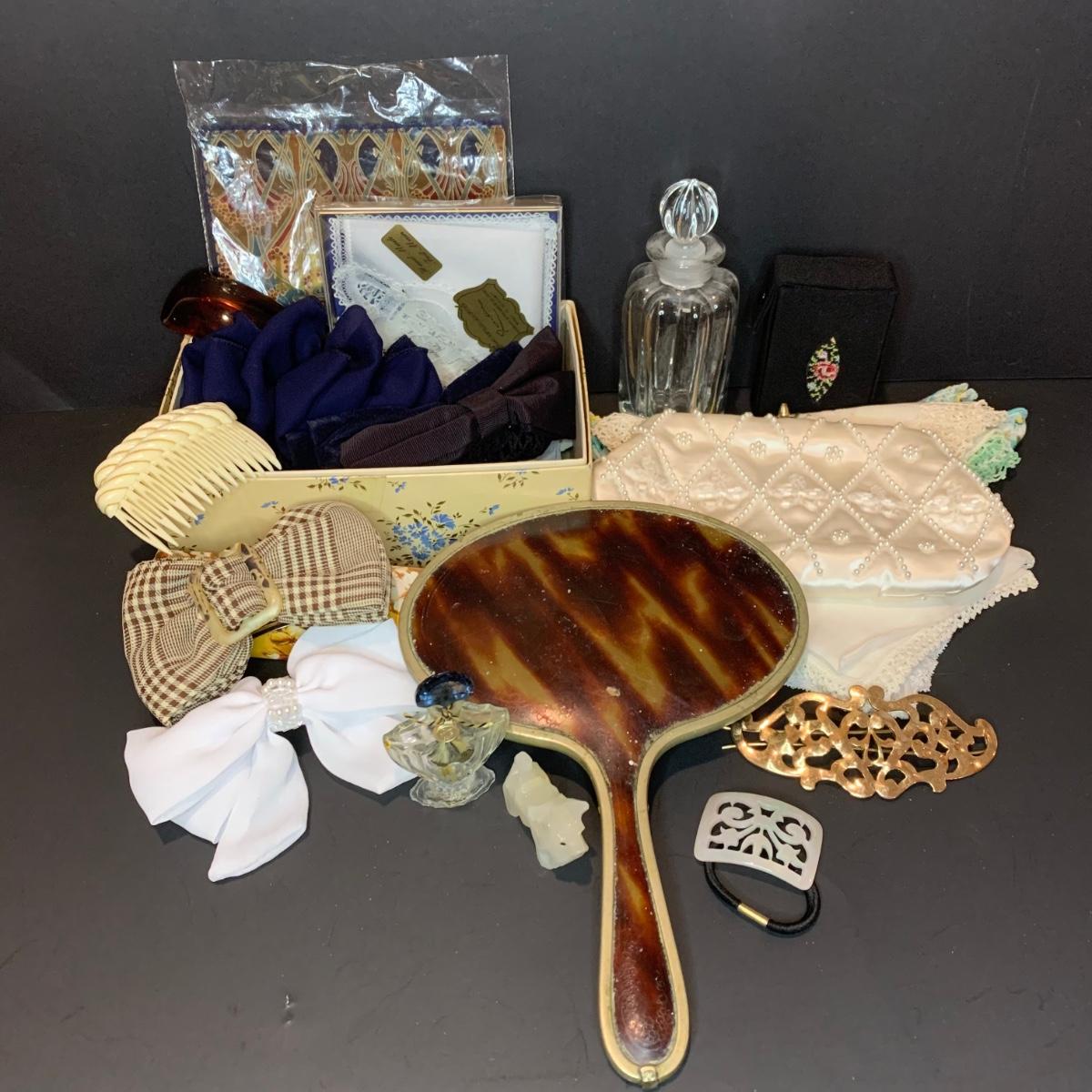 LOT 152R: Vintage Mirror,  Beaded Purse, Ladies Handkerchiefs, Hair Accessories, & More