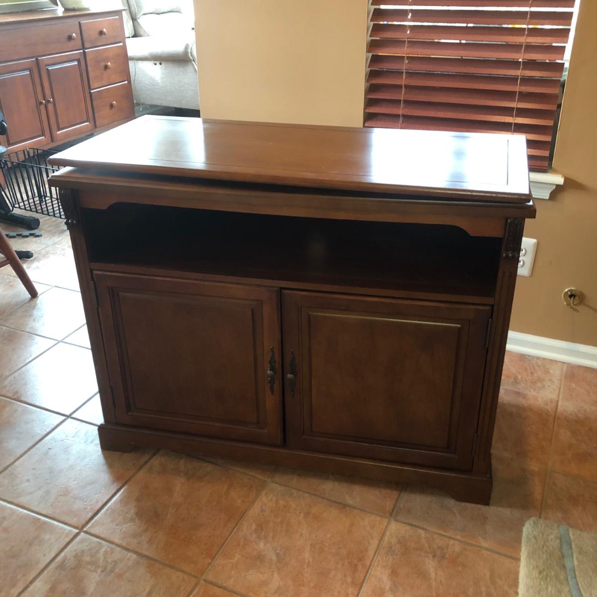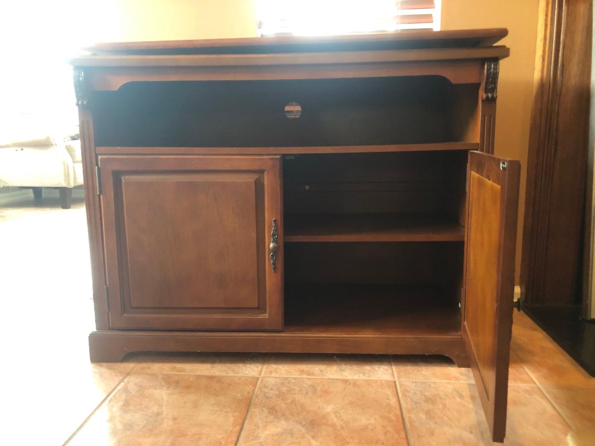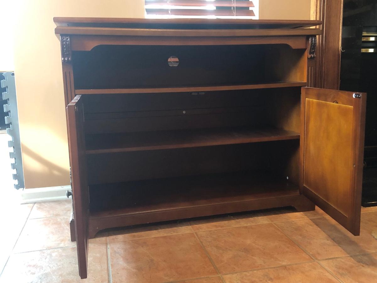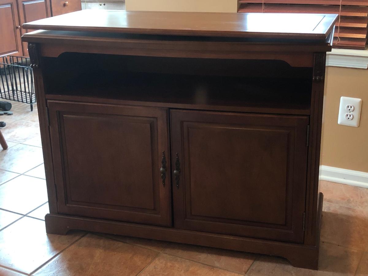TV Stand has a swivel top and holes in the back for wires. Measures 39.5W x 17.5D x 31H.