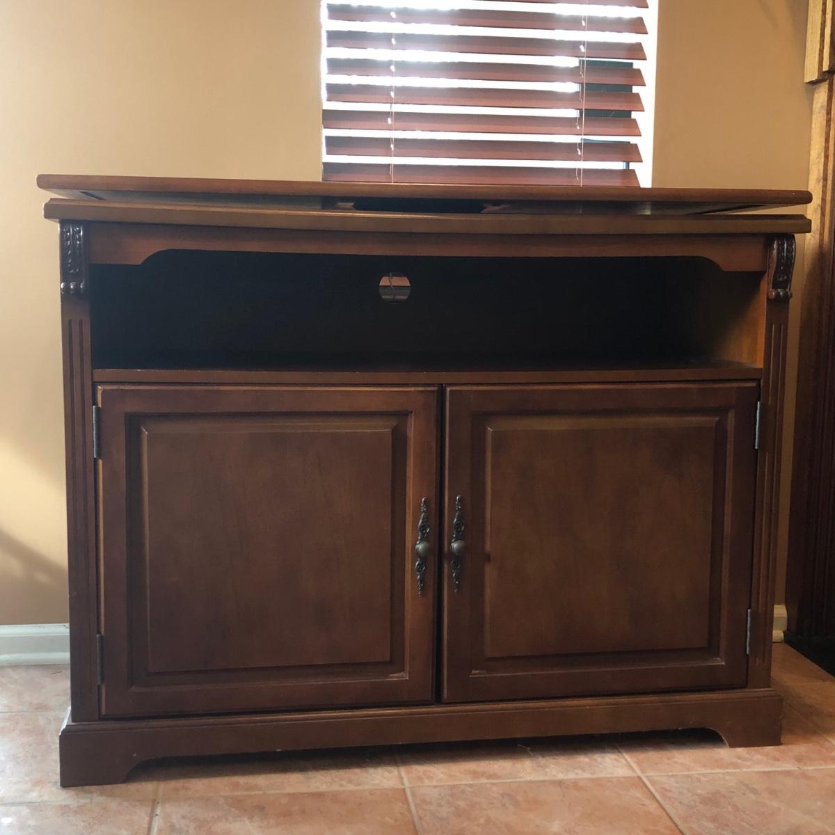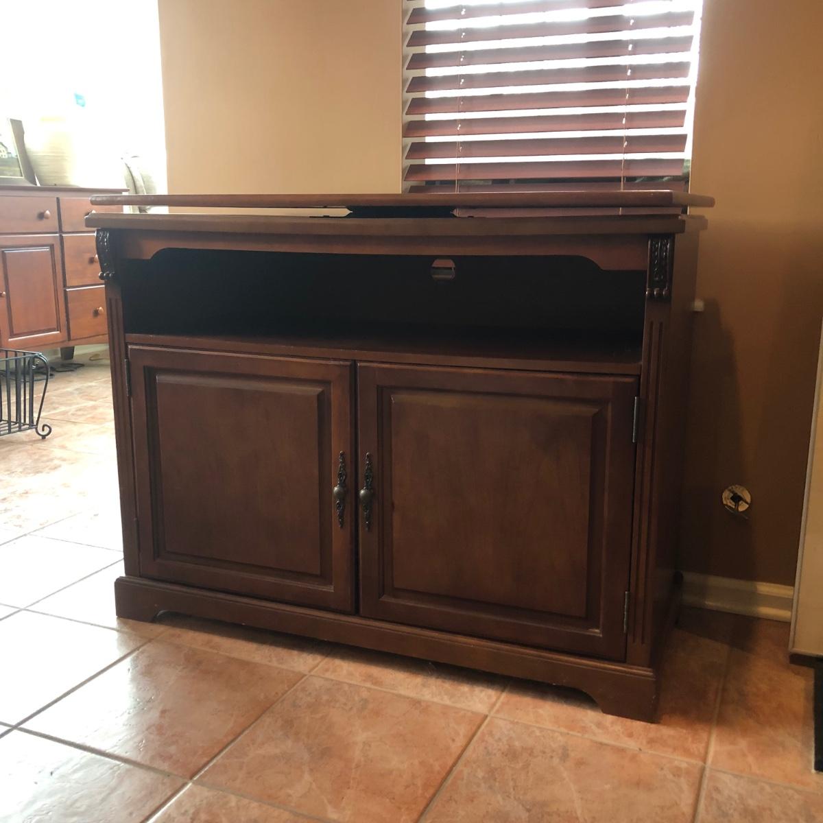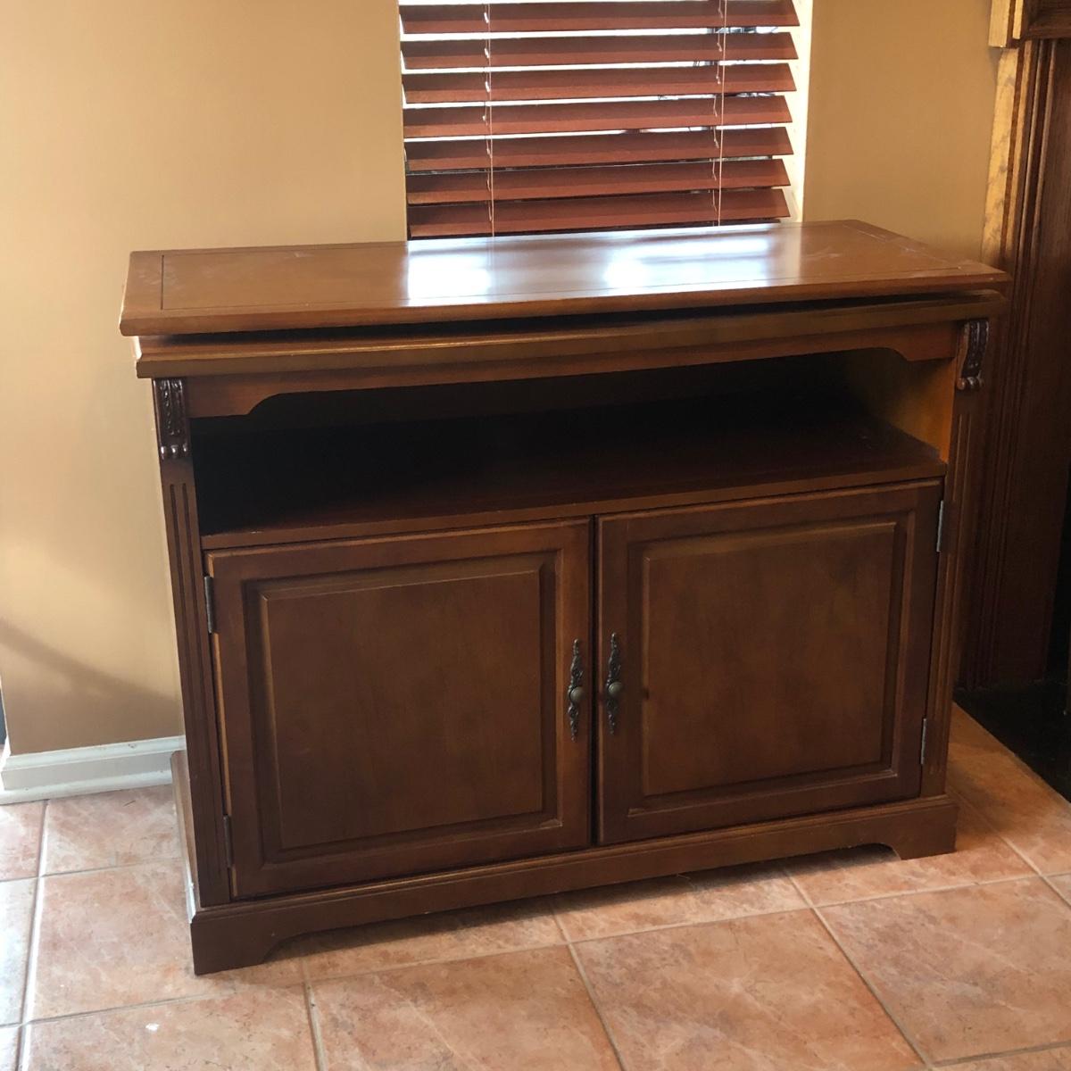 TV Stand has a swivel top and holes in the back for wires. Measures 39.5W x 17.5D x 31H.