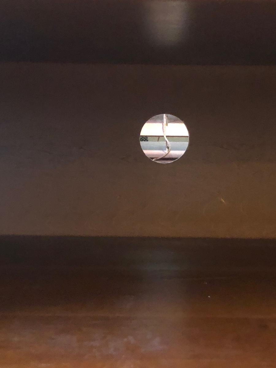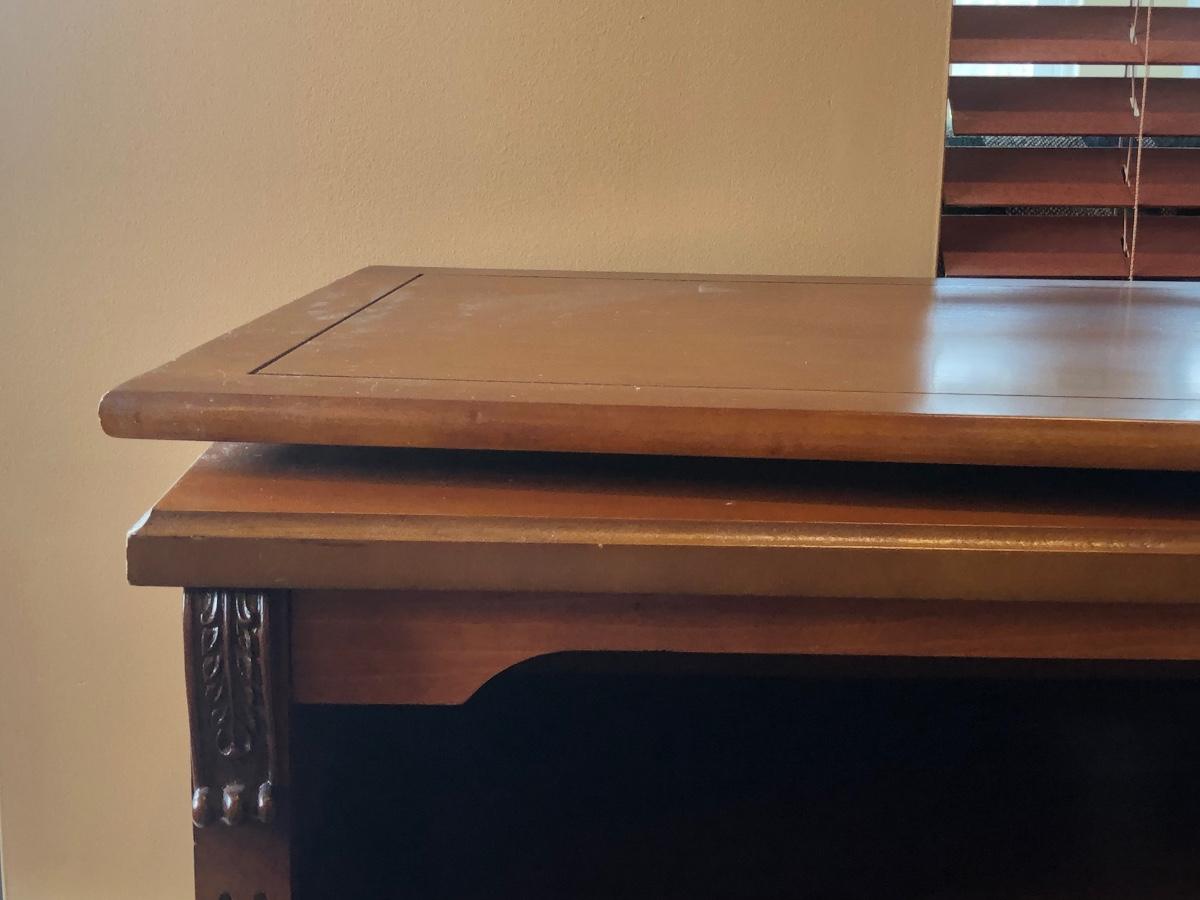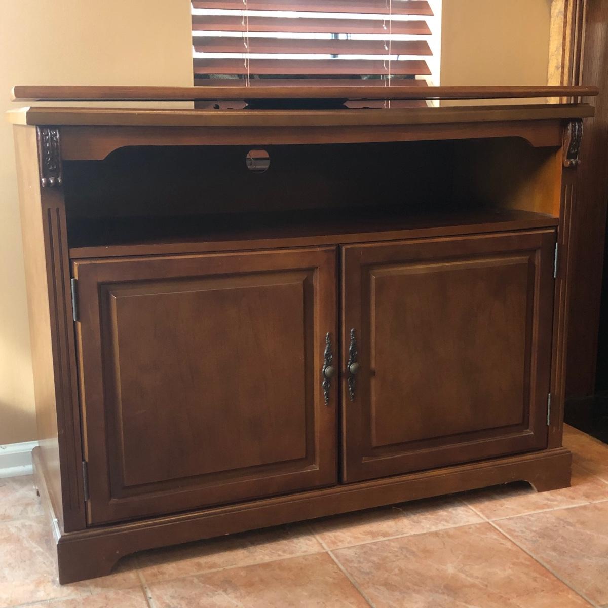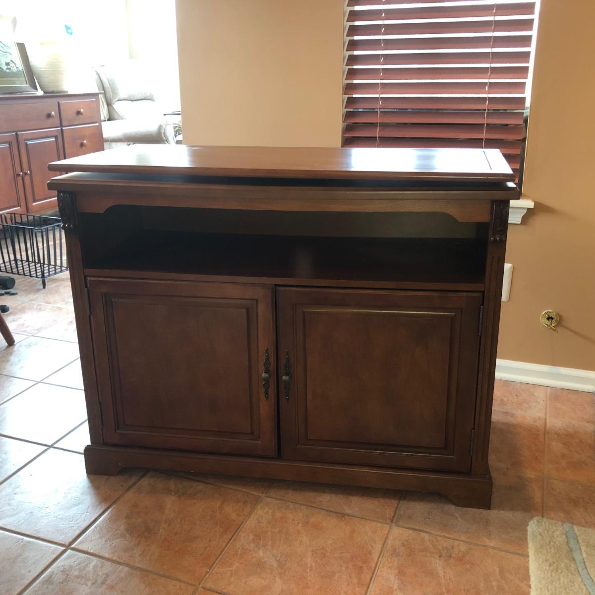TV Stand has a swivel top and holes in the back for wires. Measures 39.5W x 17.5D x 31H.