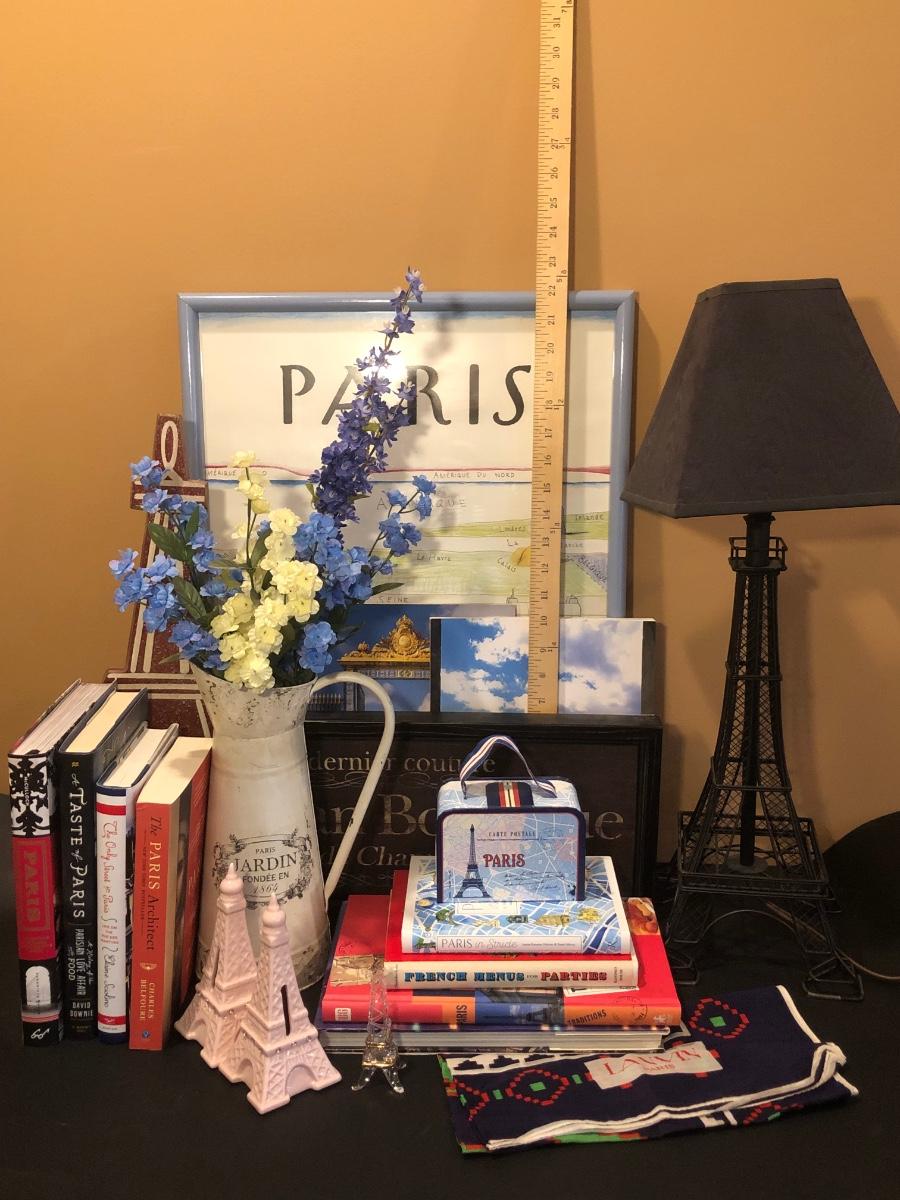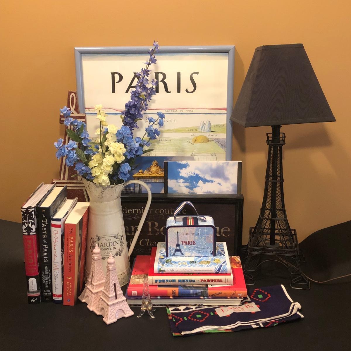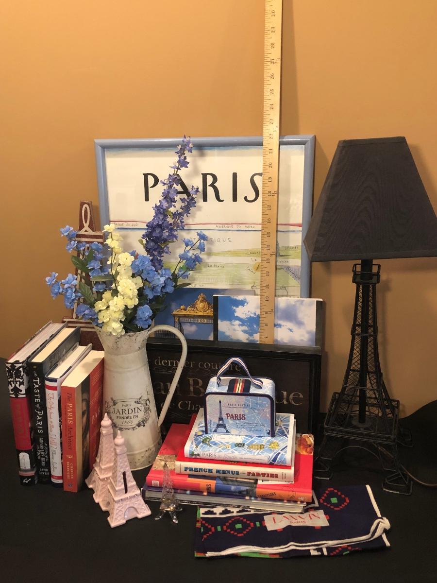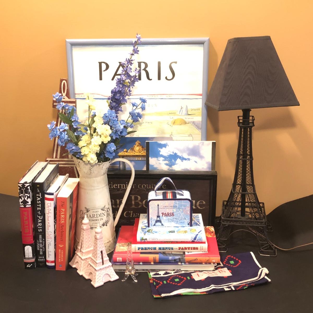 Includes large framed print, faux flowers, ceramic, an Eiffel Tower lamp, several books and more decor.