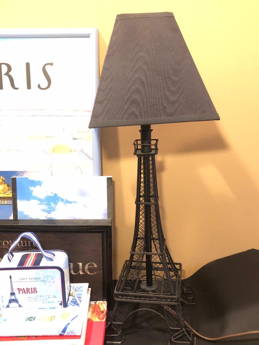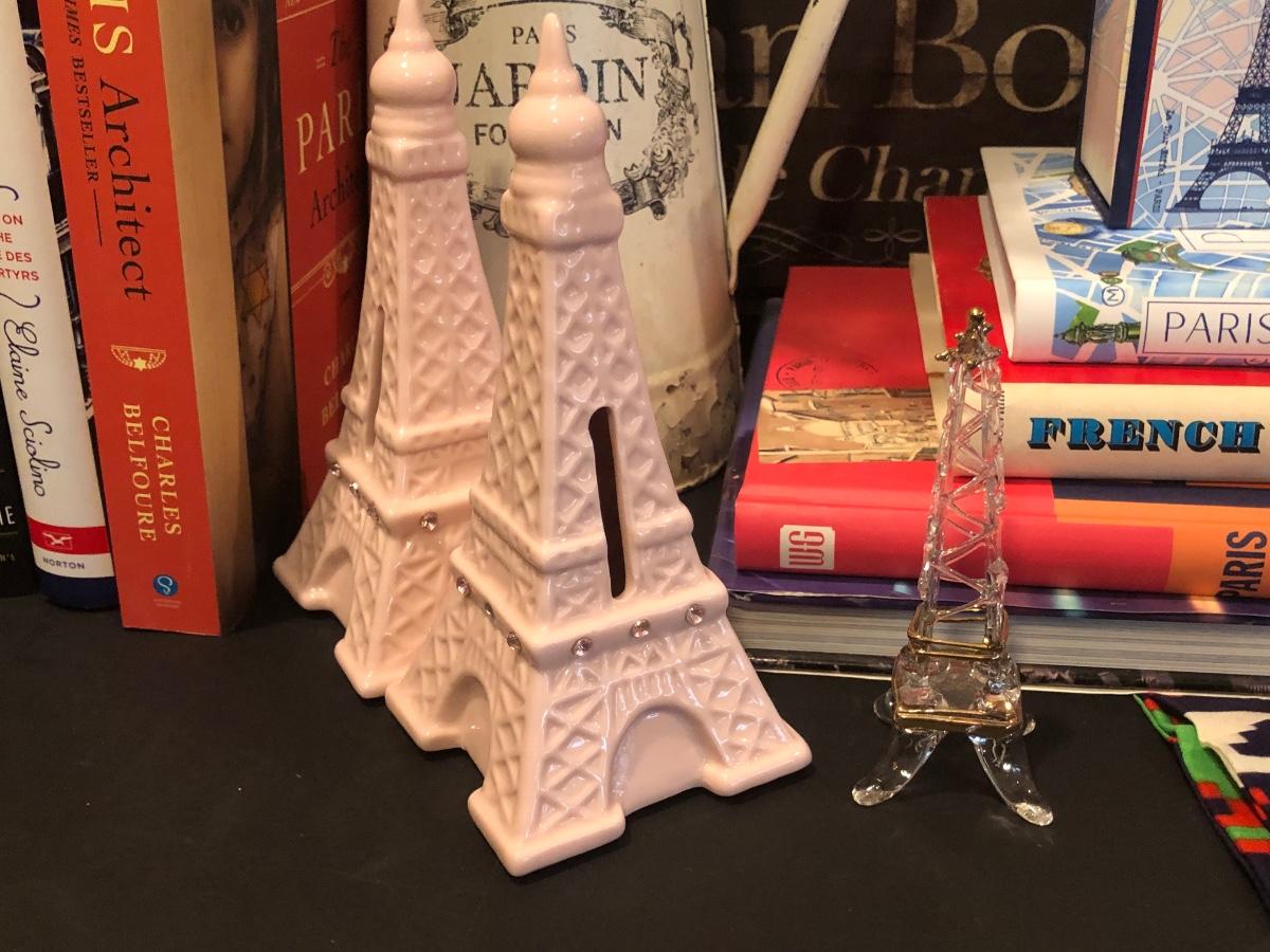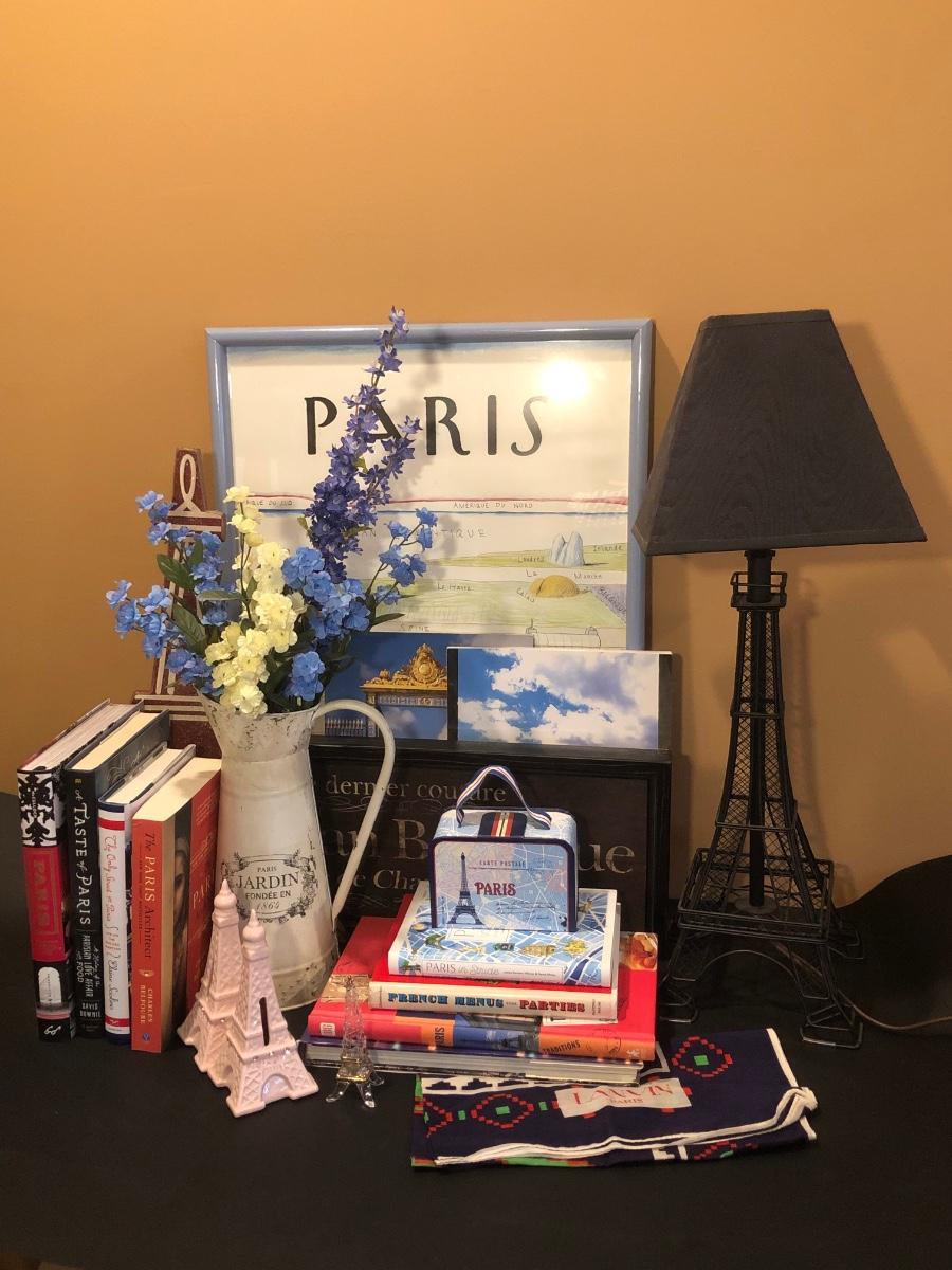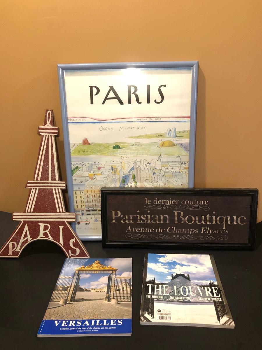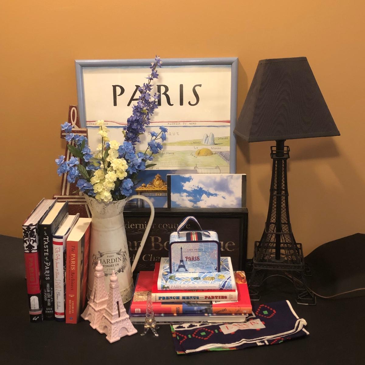 Includes large framed print, faux flowers, ceramic, an Eiffel Tower lamp, several books and more decor.