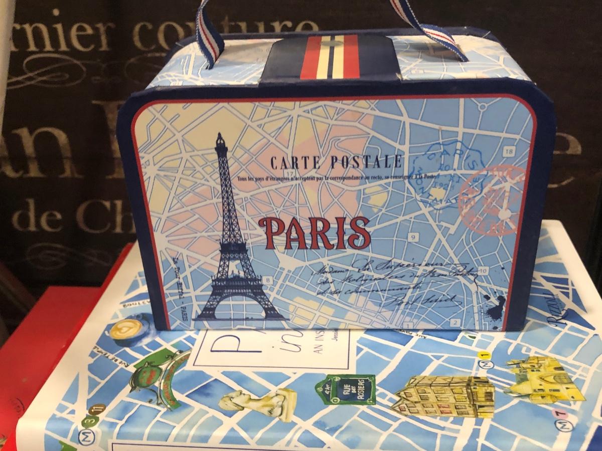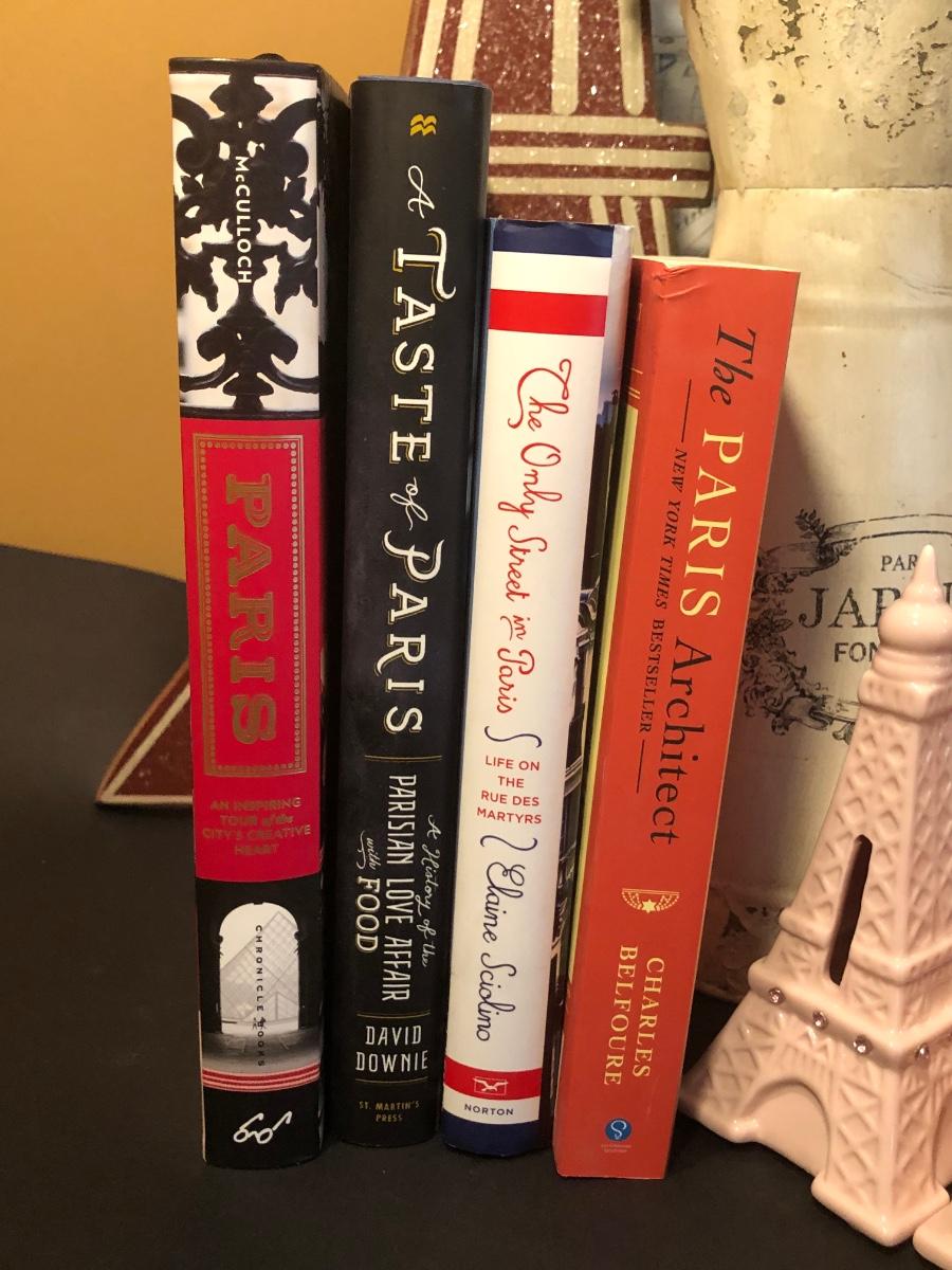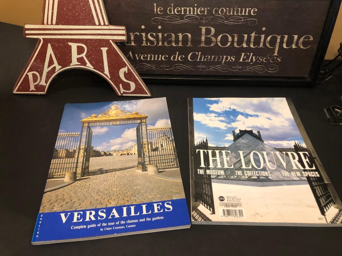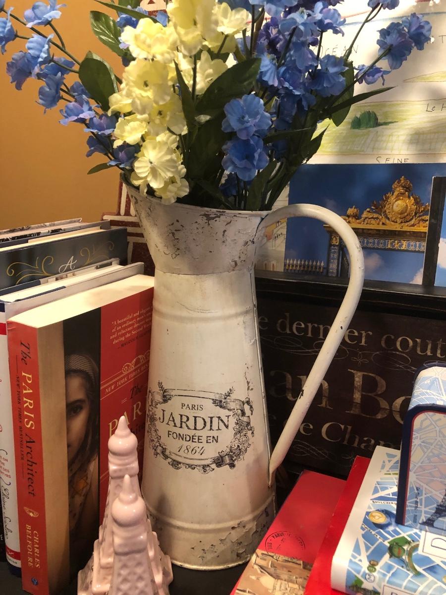 Includes large framed print, faux flowers, ceramic, an Eiffel Tower lamp, several books and more decor.