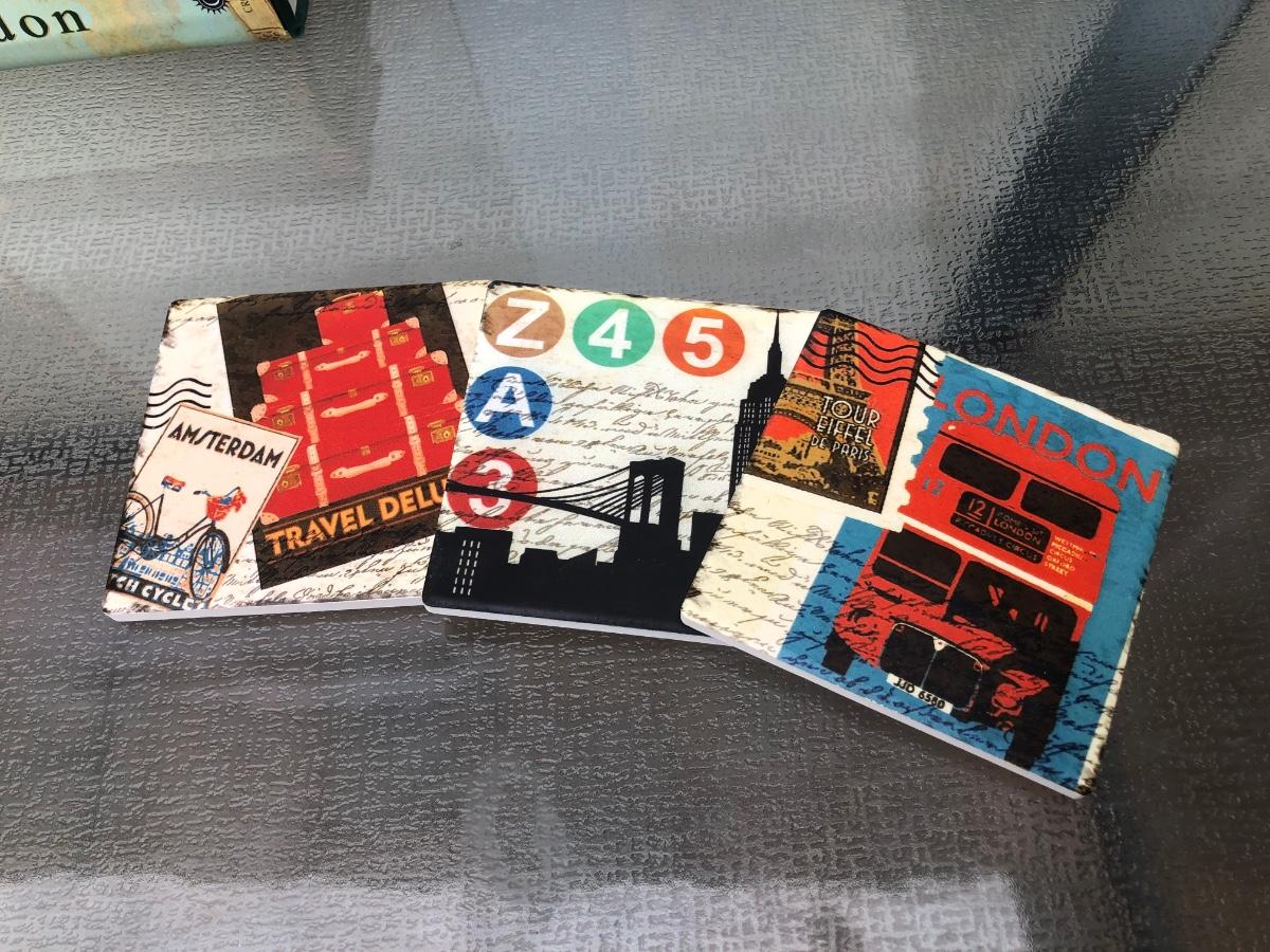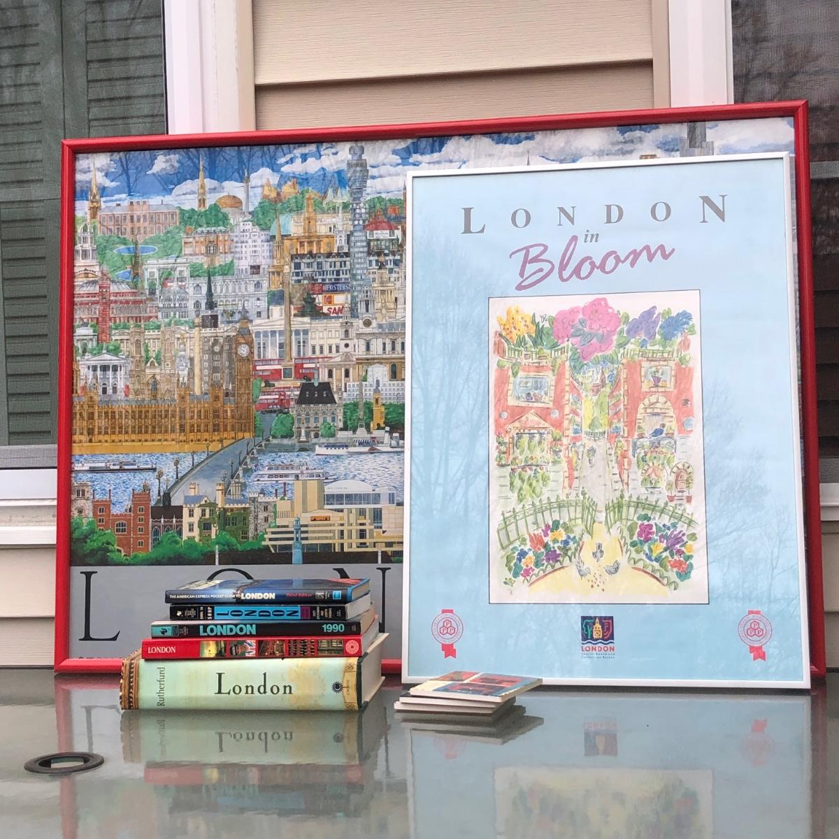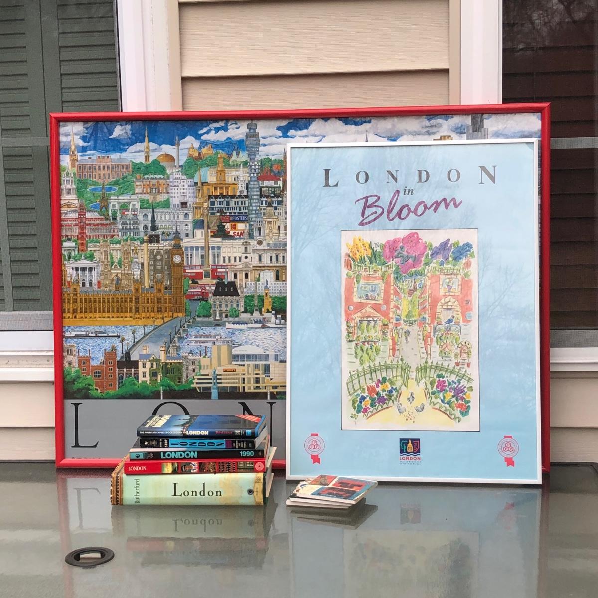 Includes two large prints of London and "London in Bloom,: Books on London and travel themed coasters.