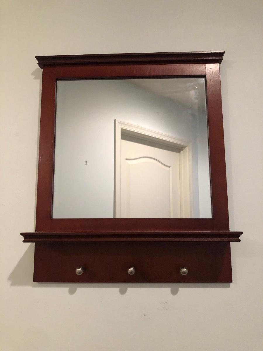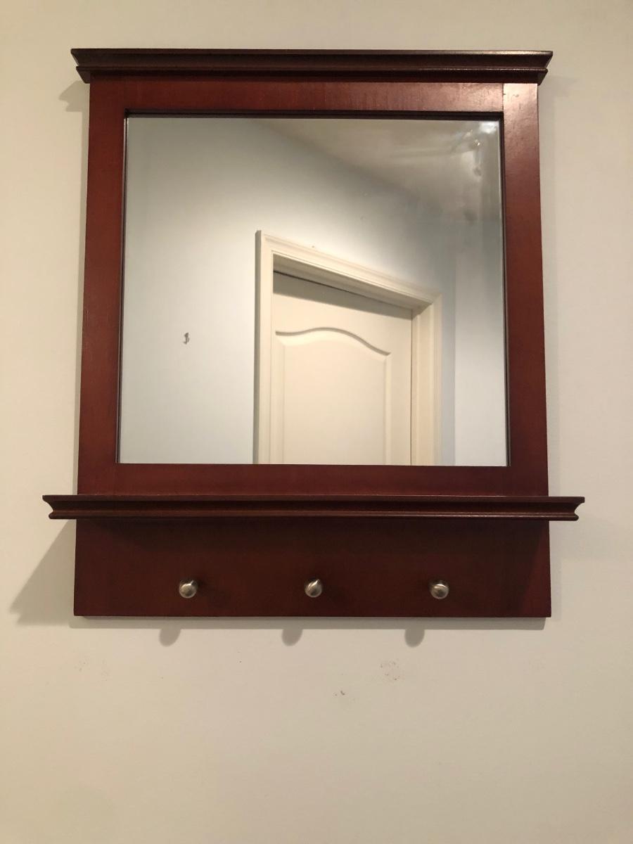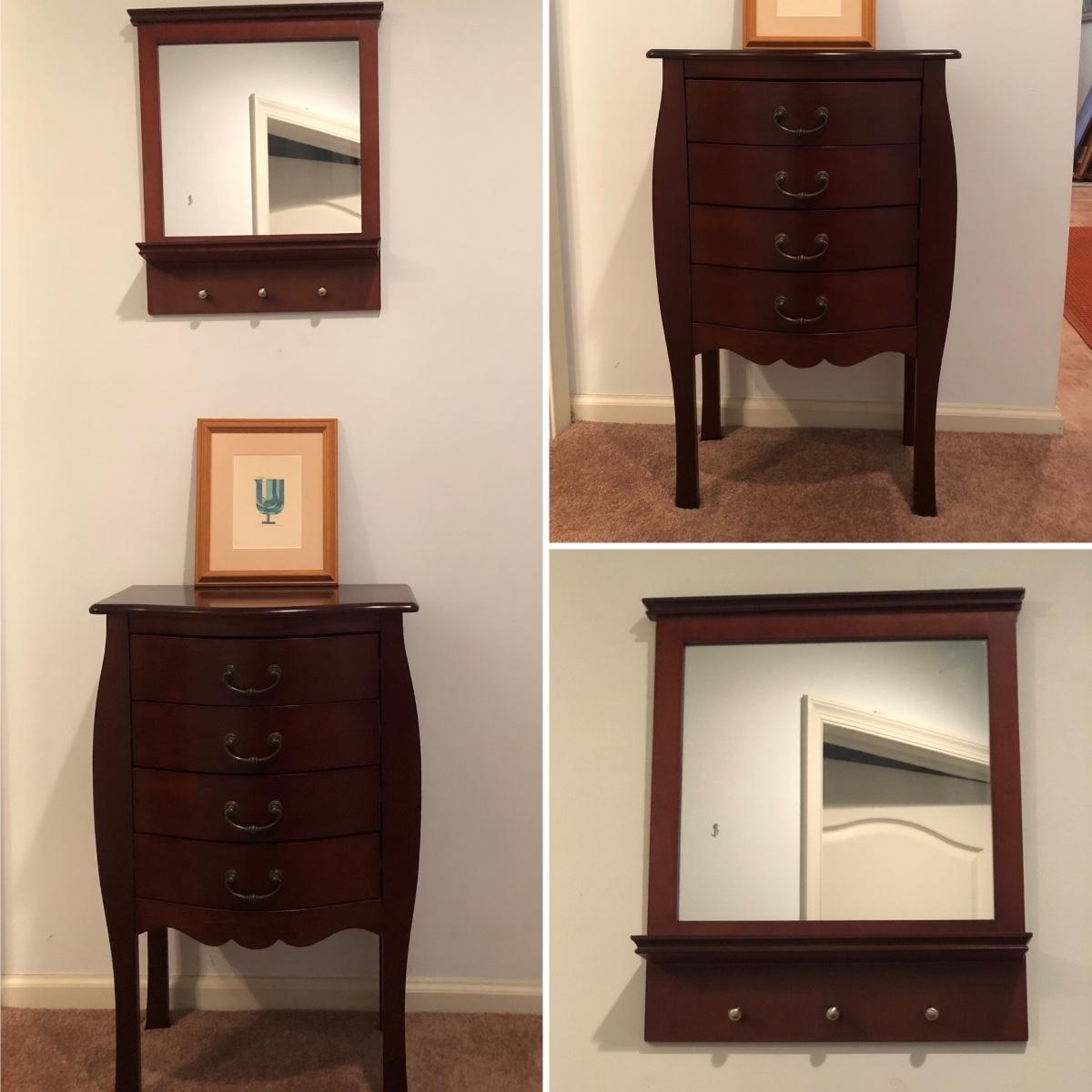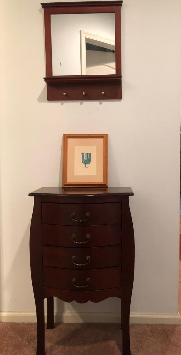 Mirror measures 16 x 19.5 inches with a 3 inch shelf. Cabinet measures 19W x 10D x 31H and has four drawers. Contents included.
