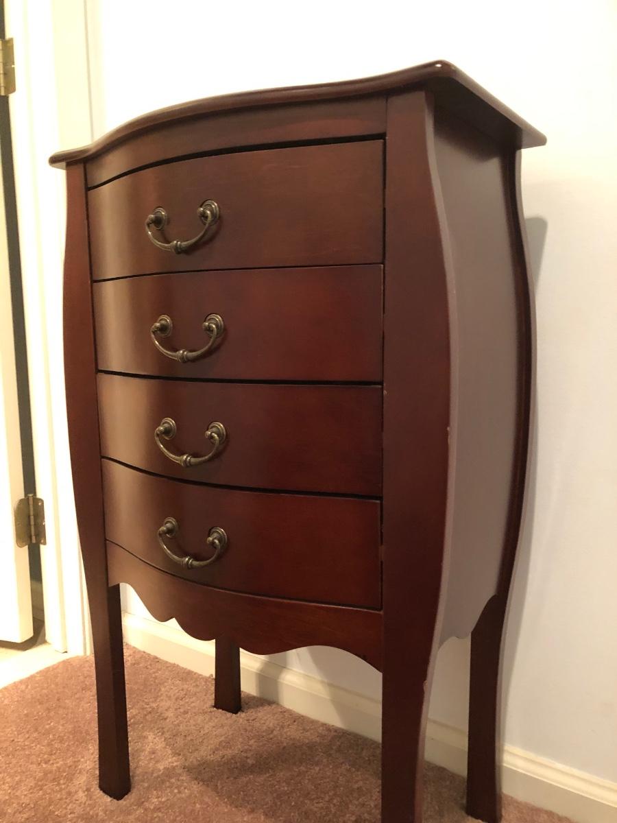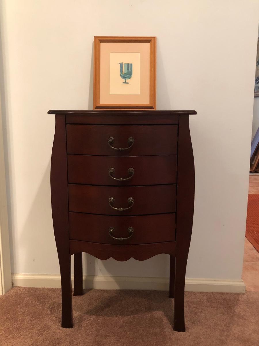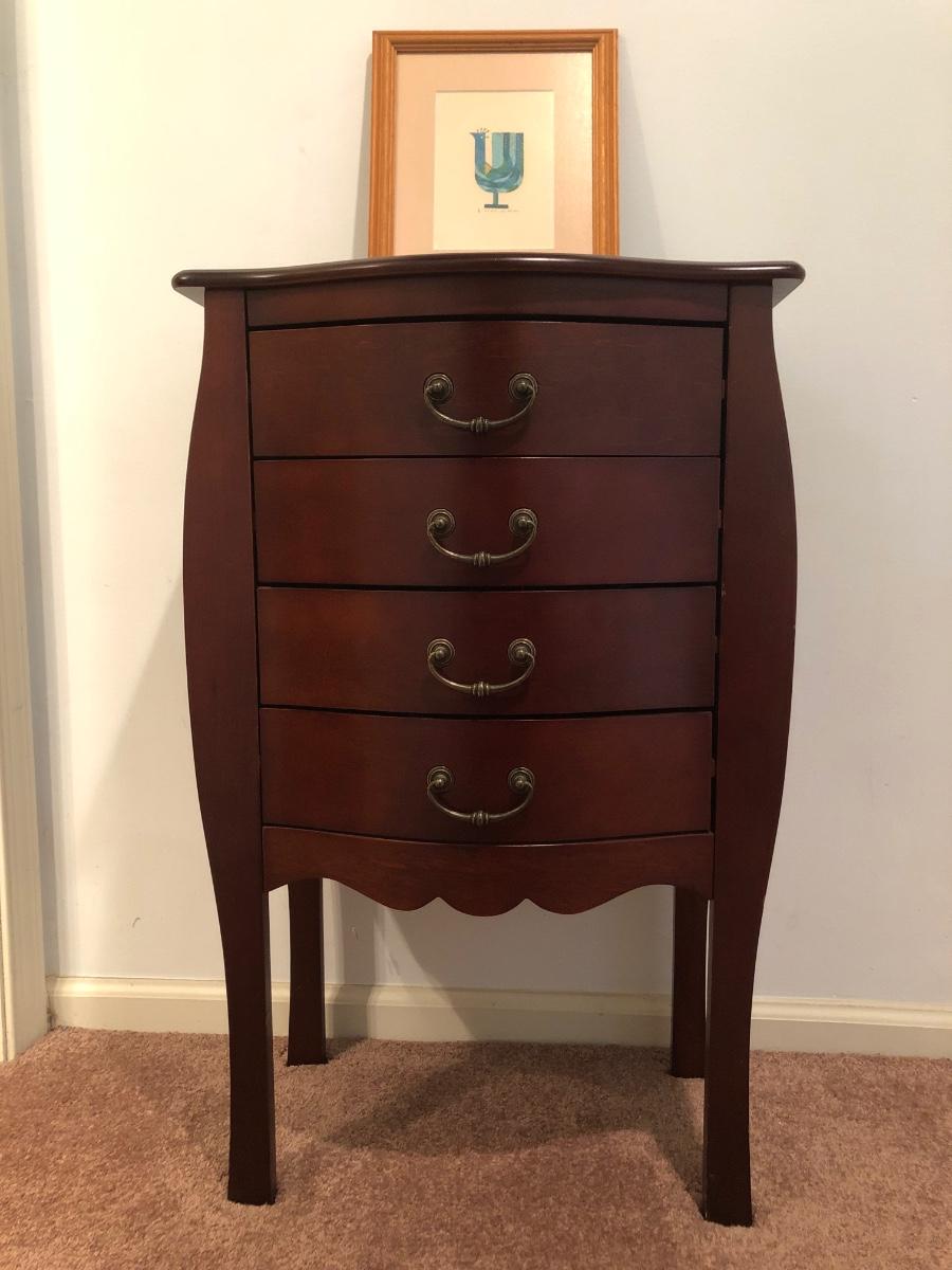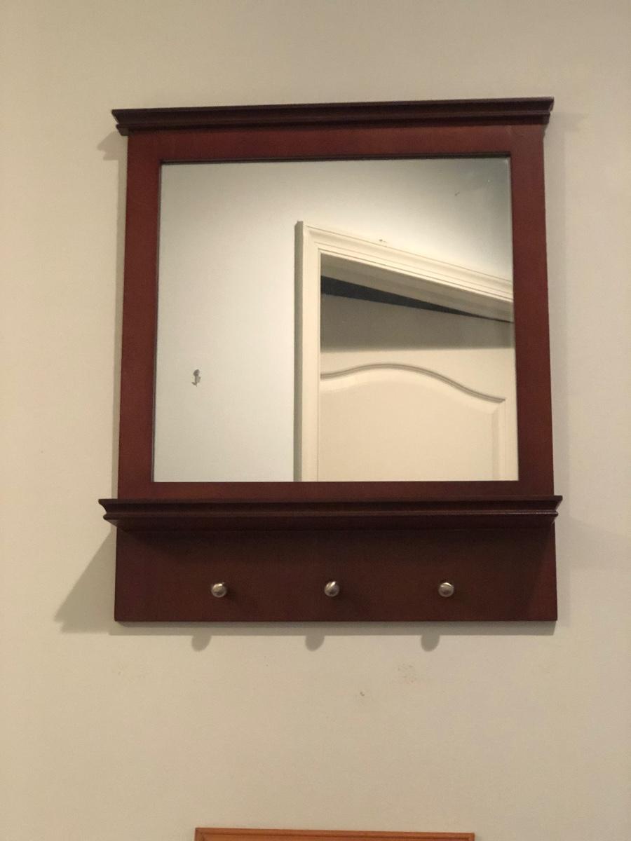 Mirror measures 16 x 19.5 inches with a 3 inch shelf. Cabinet measures 19W x 10D x 31H and has four drawers. Contents included.