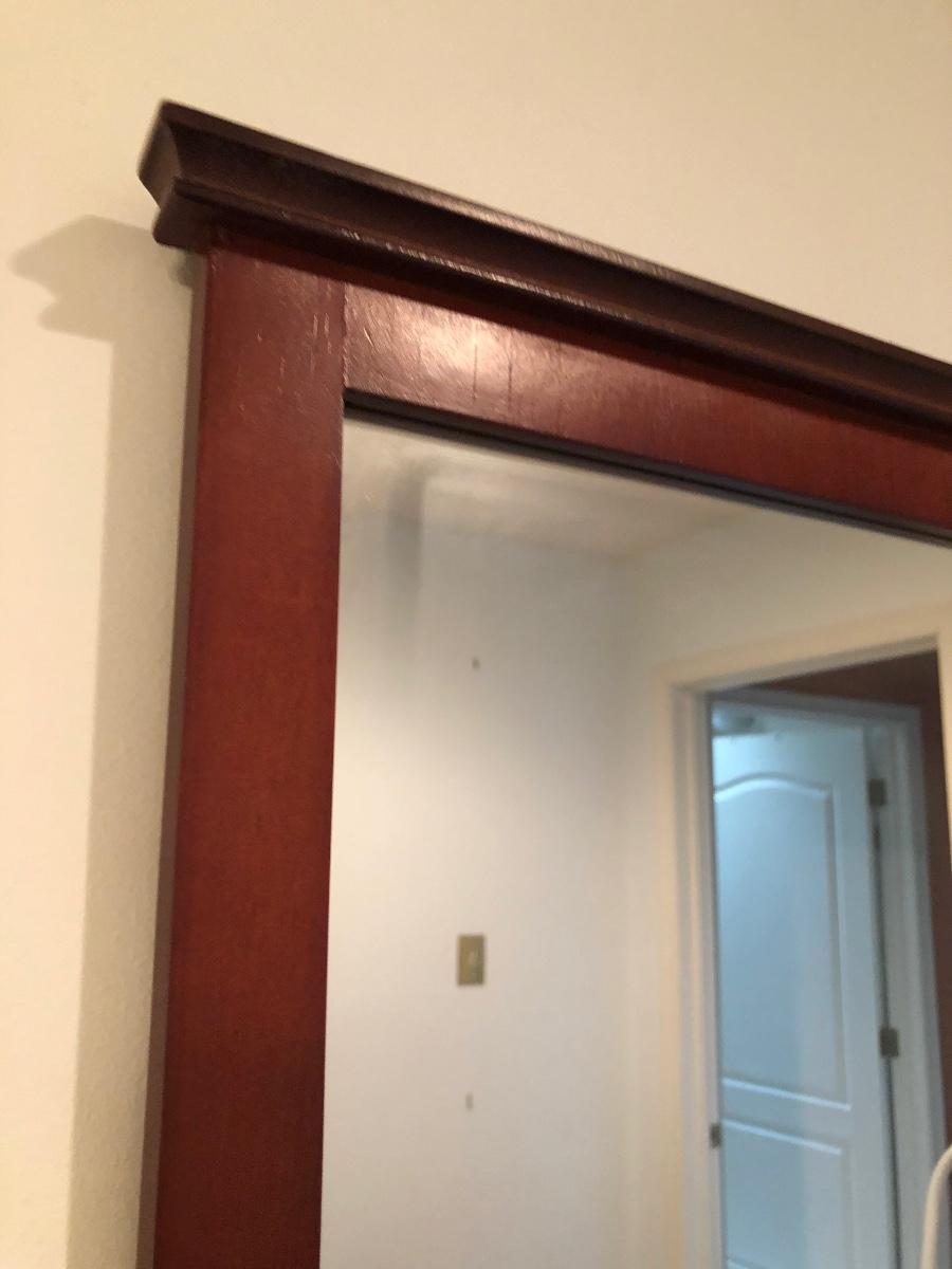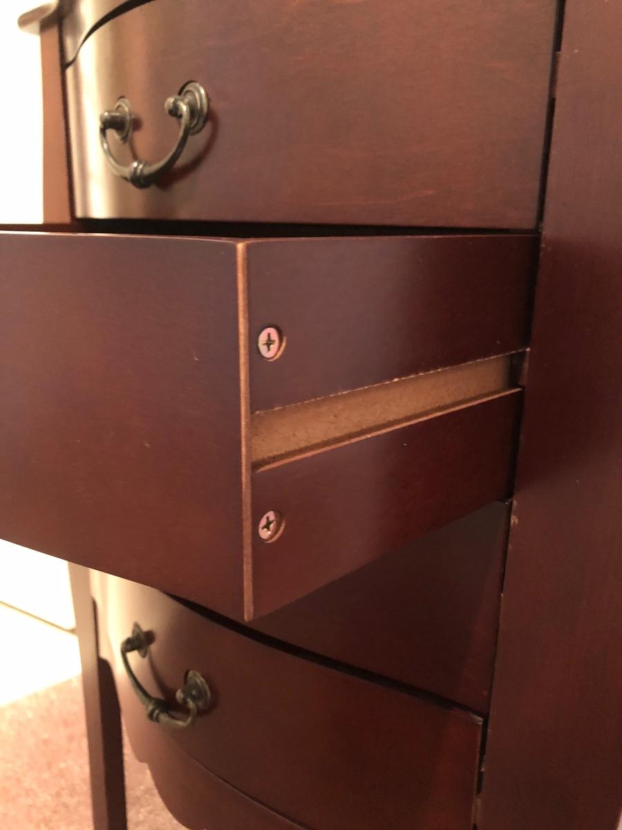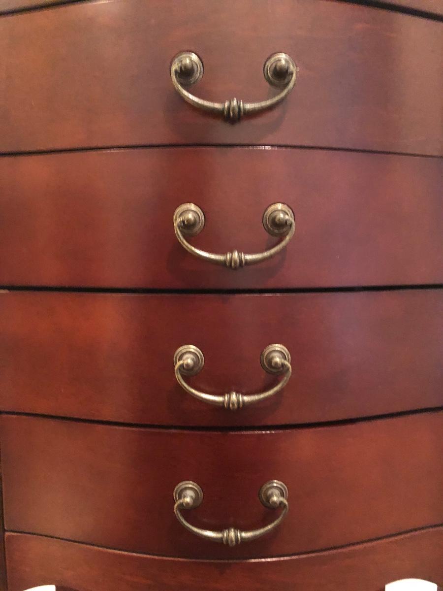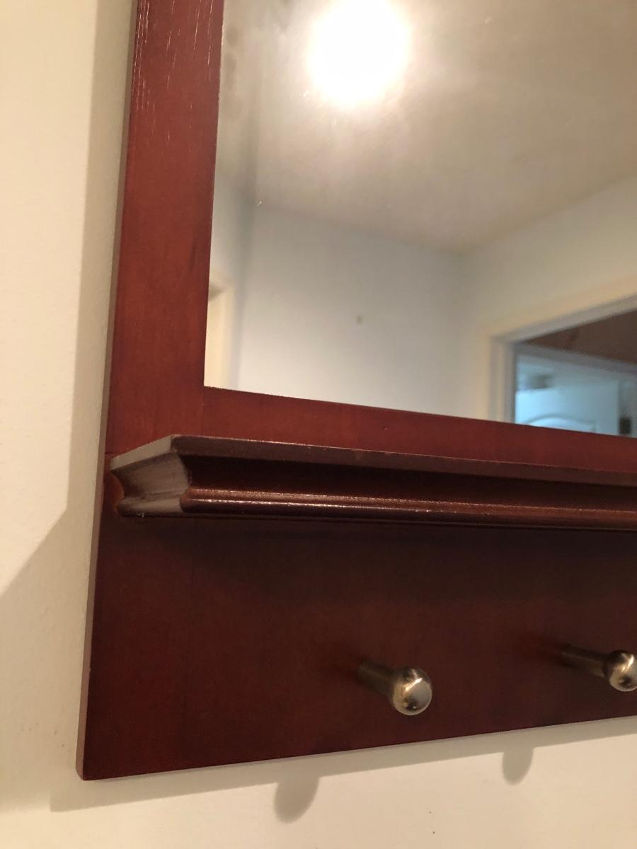 Mirror measures 16 x 19.5 inches with a 3 inch shelf. Cabinet measures 19W x 10D x 31H and has four drawers. Contents included.